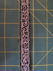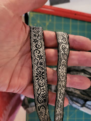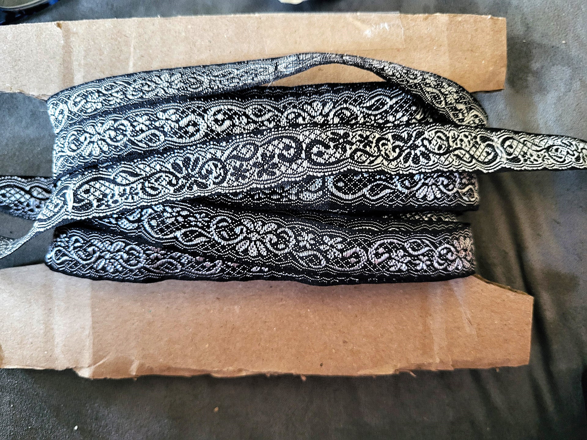 Jacquard ribbon trim fancy black silver metallic scrollwork flowers geometric 11 yards x 5/8" Reversible