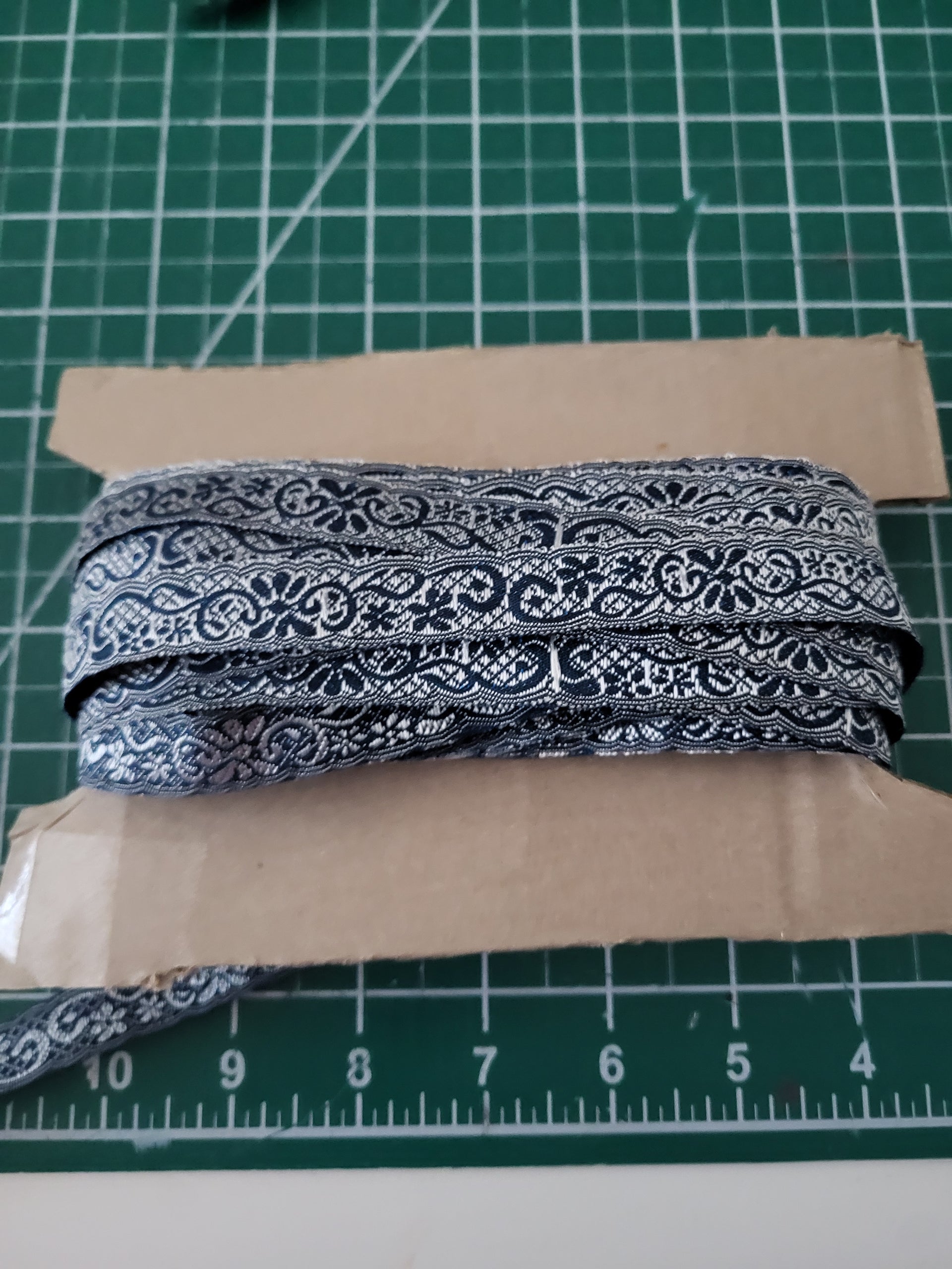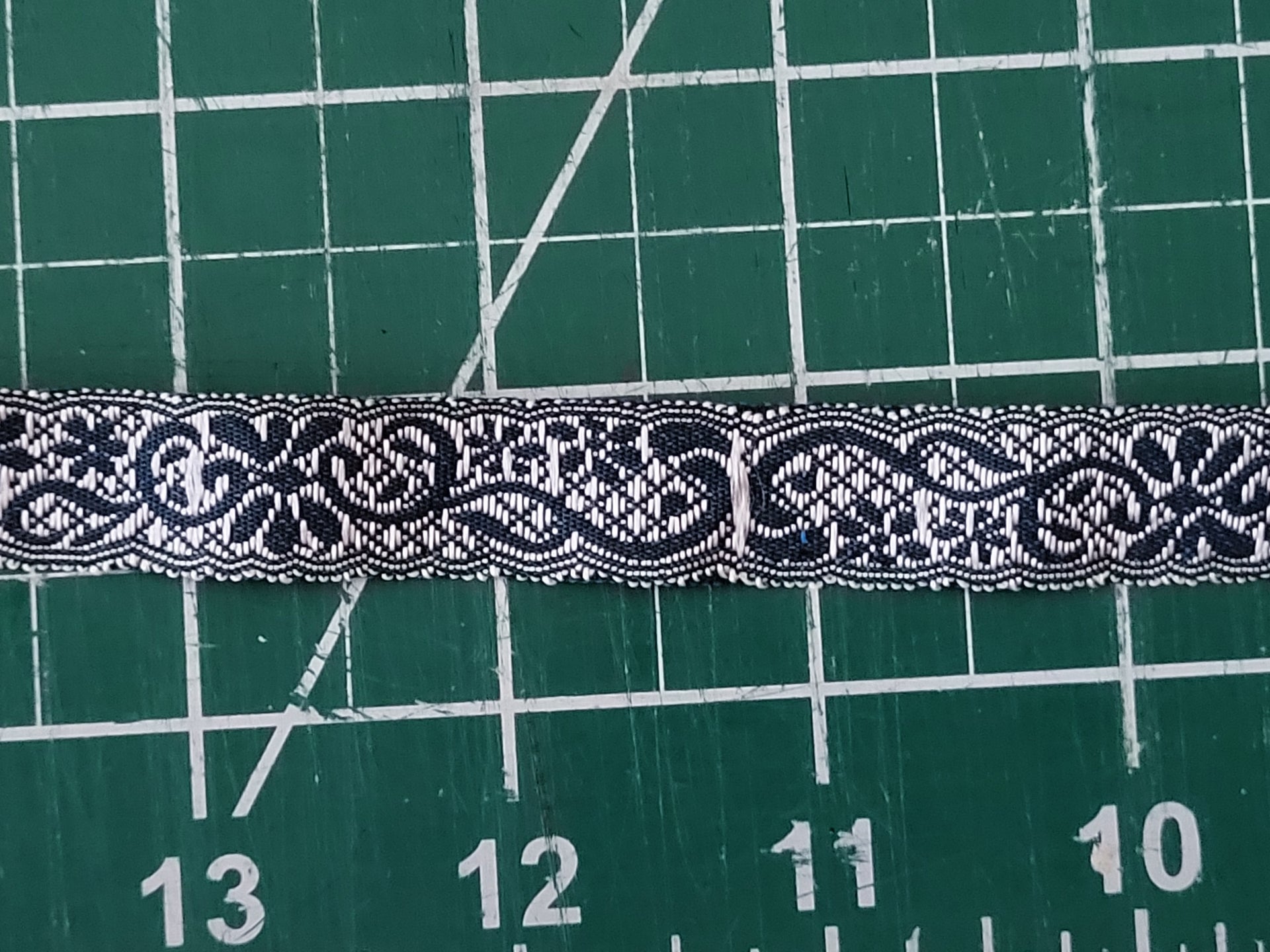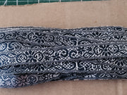 Jacquard ribbon trim fancy navy blue silver metallic scrollwork flowers geometric 5 yards x 5/8" Reversible. 4 lots of 5 yards are available and will be cut continuously.
