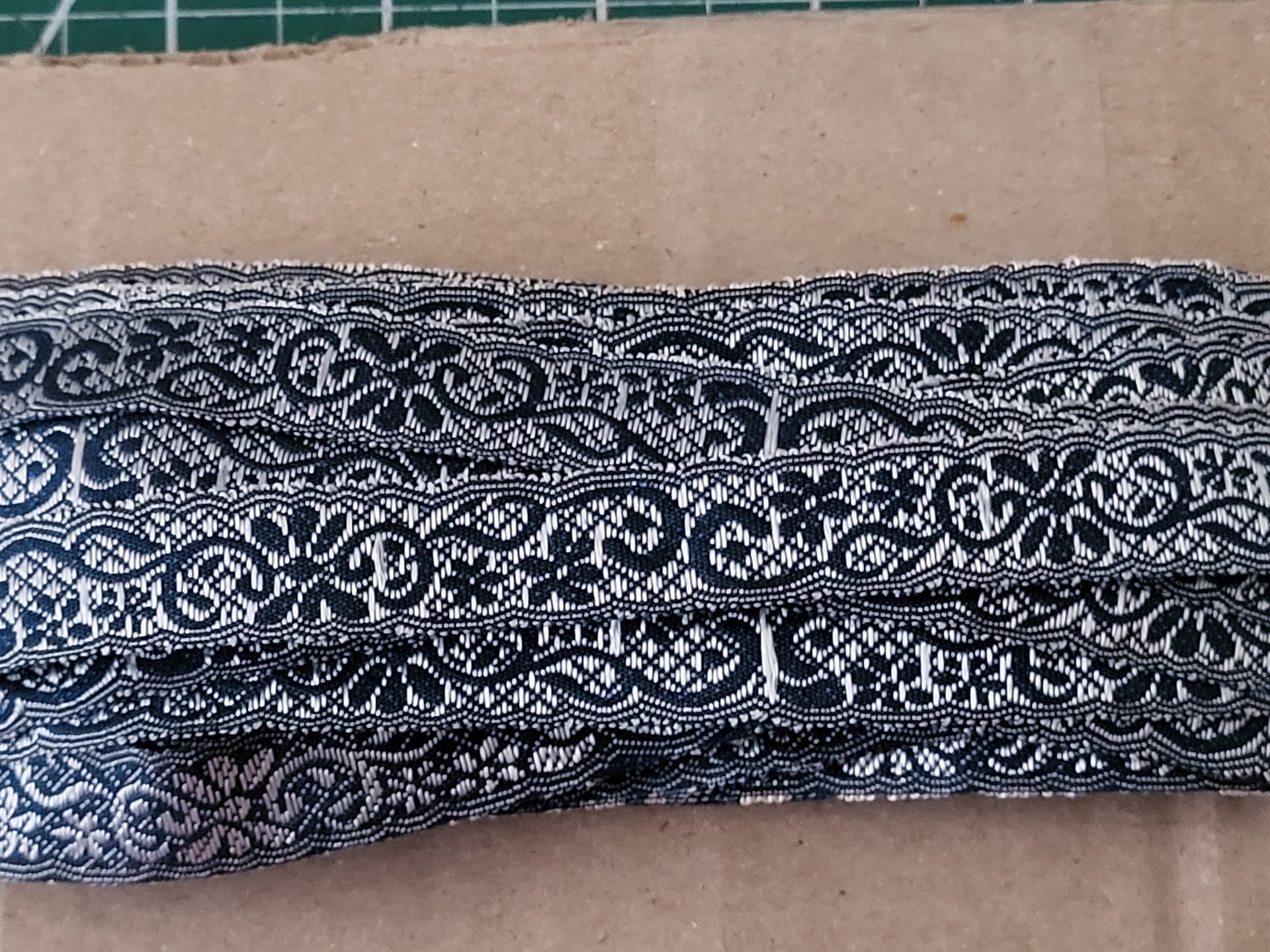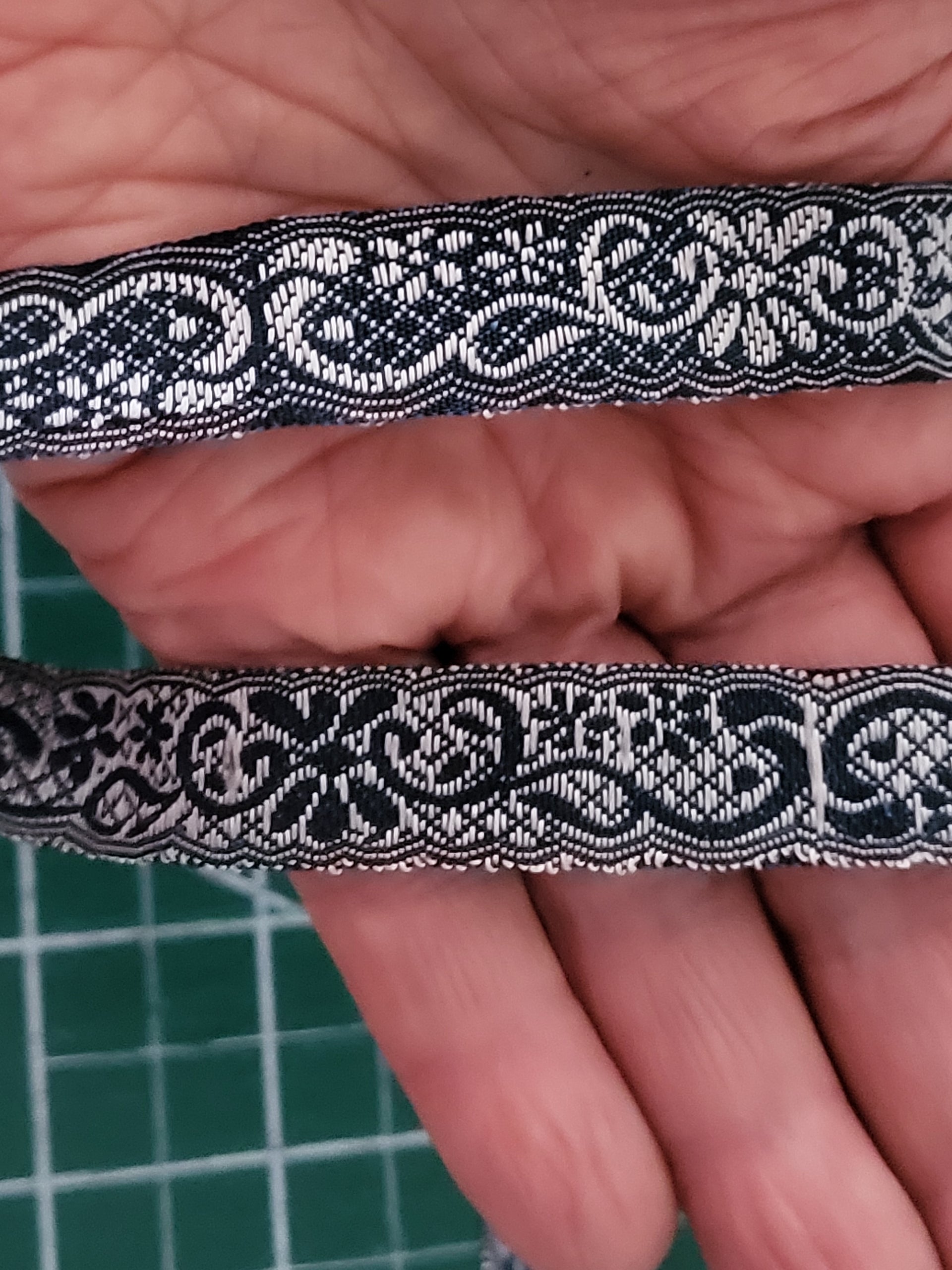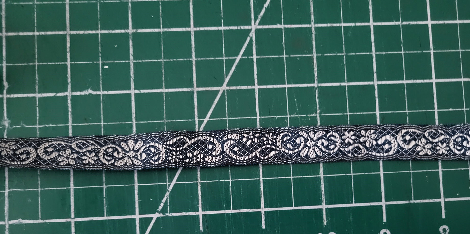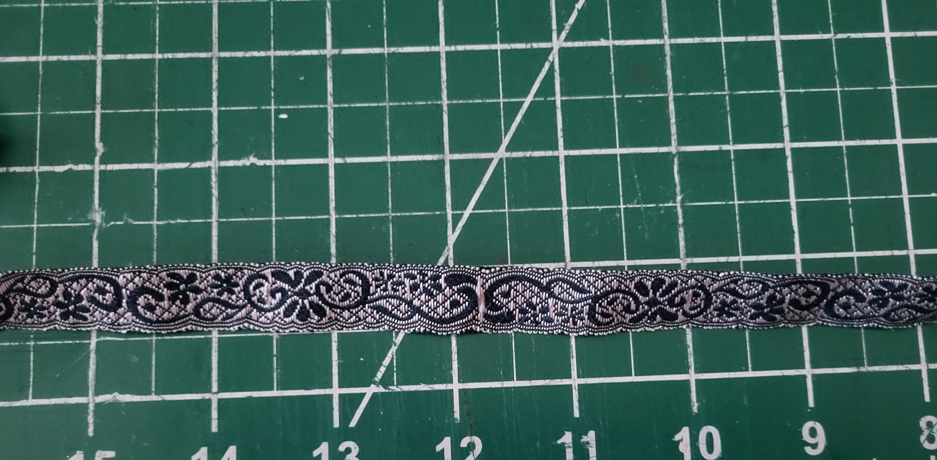 This diamond geometric ribbon is a tapestry trim that you sew on to an item. The detail is amazing with lots of tiny scroll work and flowers....STUNNING!