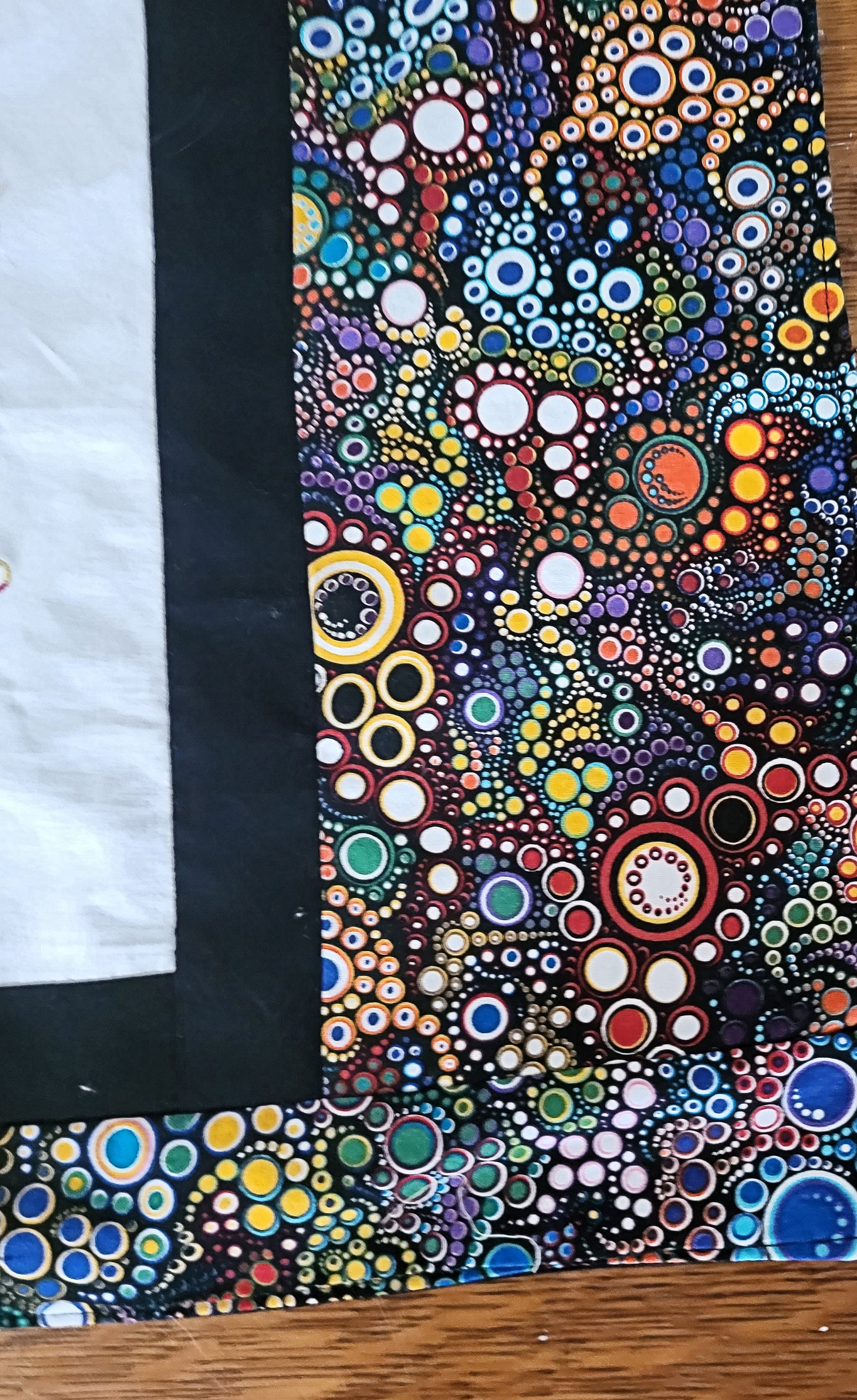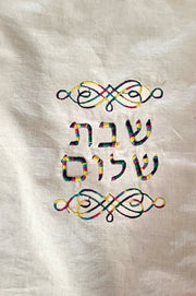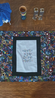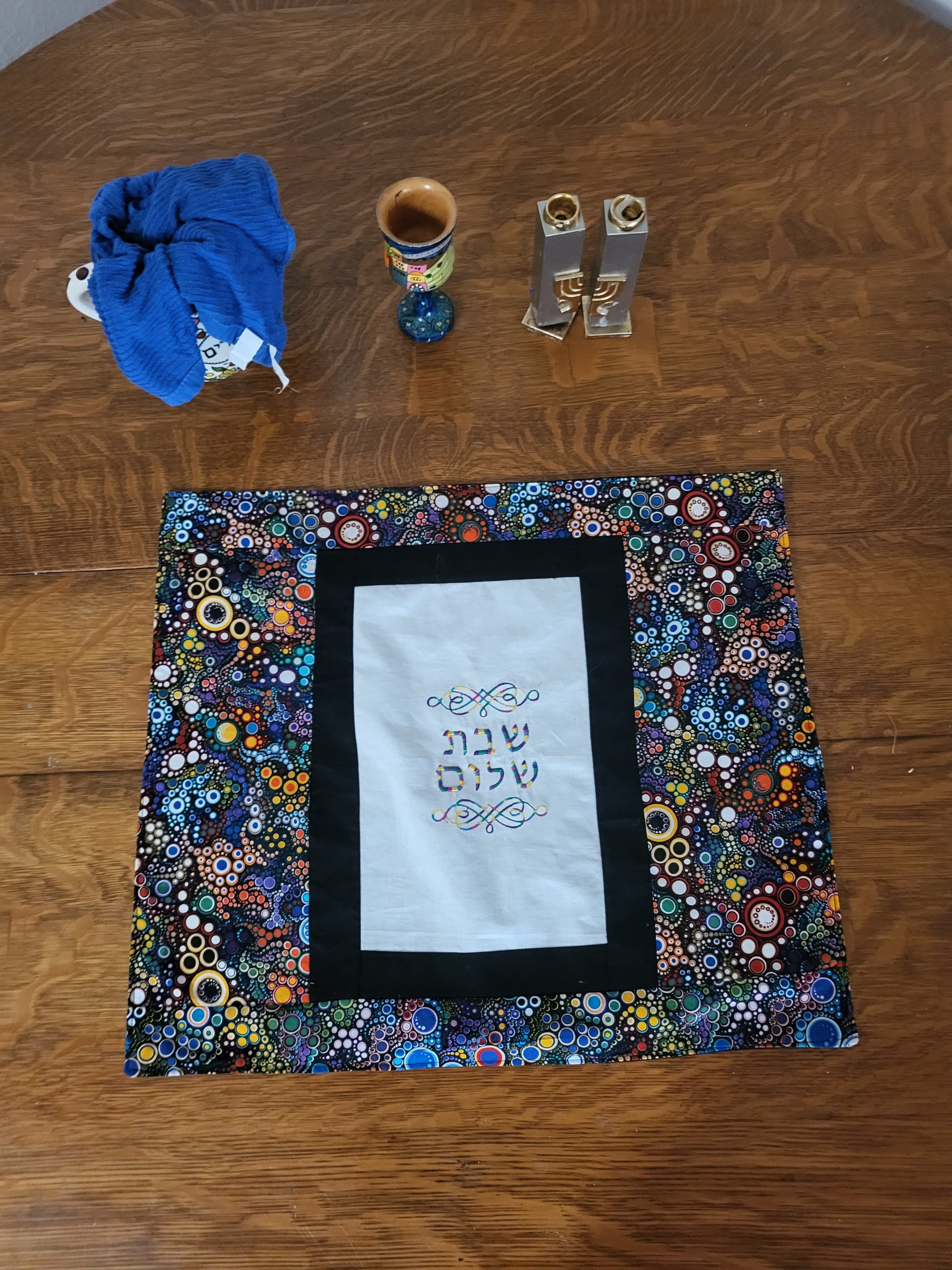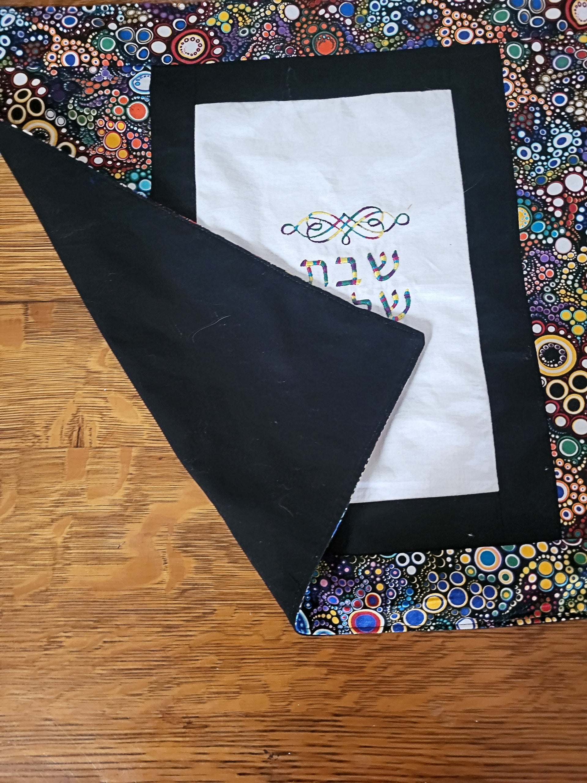 Modern colorful Challah cover effervescence design, Multicolored thread, great wedding, anniversary, engagement gift. This modern challah cover or table mat can be used for every Shabbat. I machine embroidered in multi colored thread "Shabbat Shalom" in Hebrew with onto white Kona Cotton. I surrounded this with a black Kona border. The outer vibrant fabric is a wonderful effervescence bubbly design of multiple colors (Robert Kaufman fabric). The reverse side is a Kona cotton black.