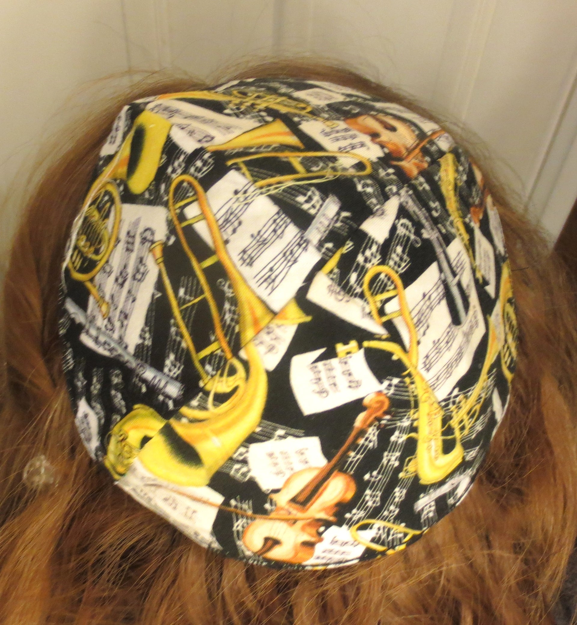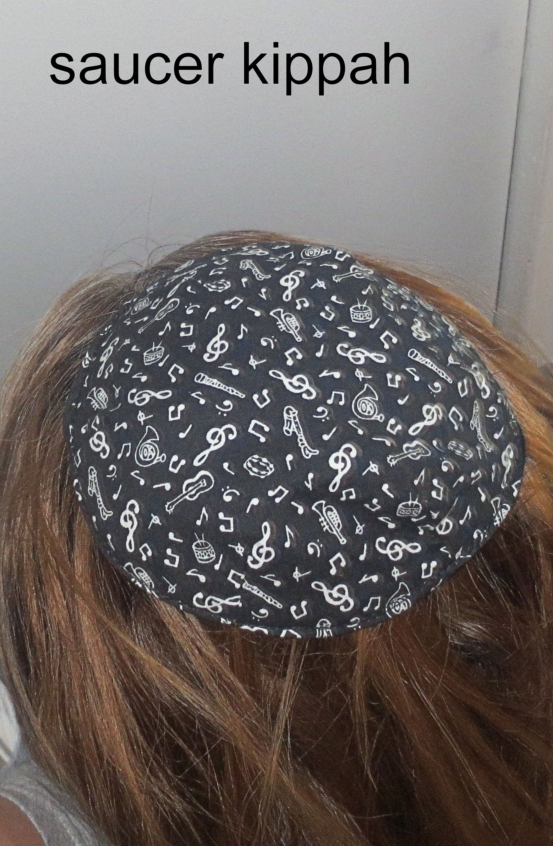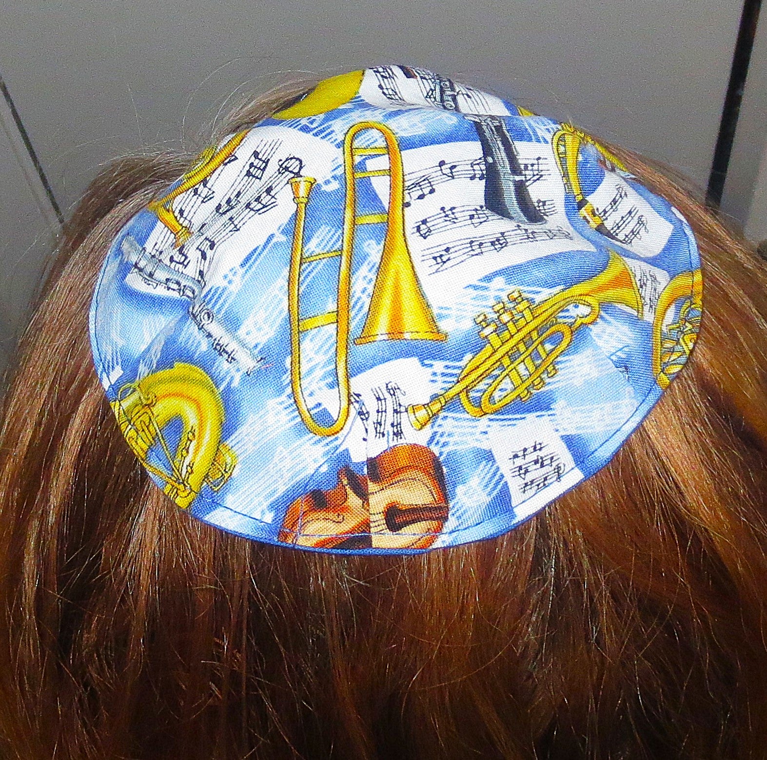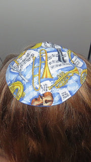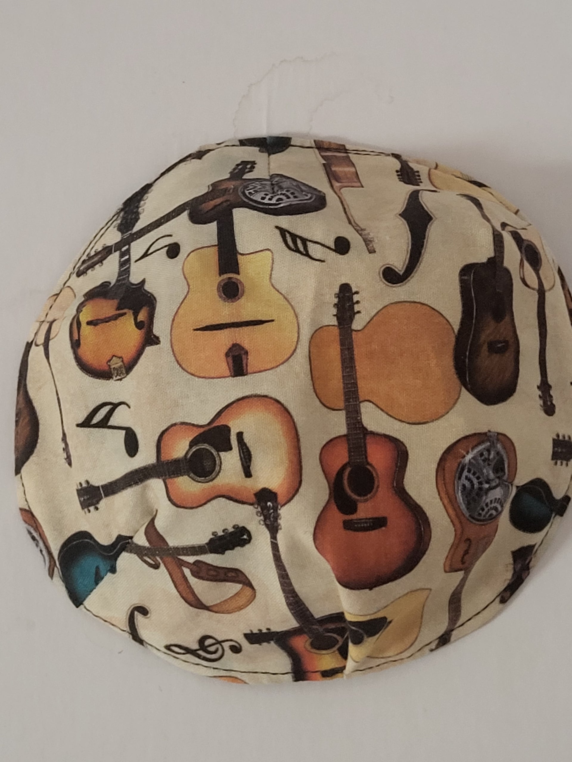 You can select from musical notes, musical instruments, electric guitars, piano print, The Beatles, Kiss, The Who, AC DC, Woodstock, The Grateful Dead, jazz, orchestral, klezmer, drums, horns and more. Your kippah may vary from the stock pictures as we make several at a time.