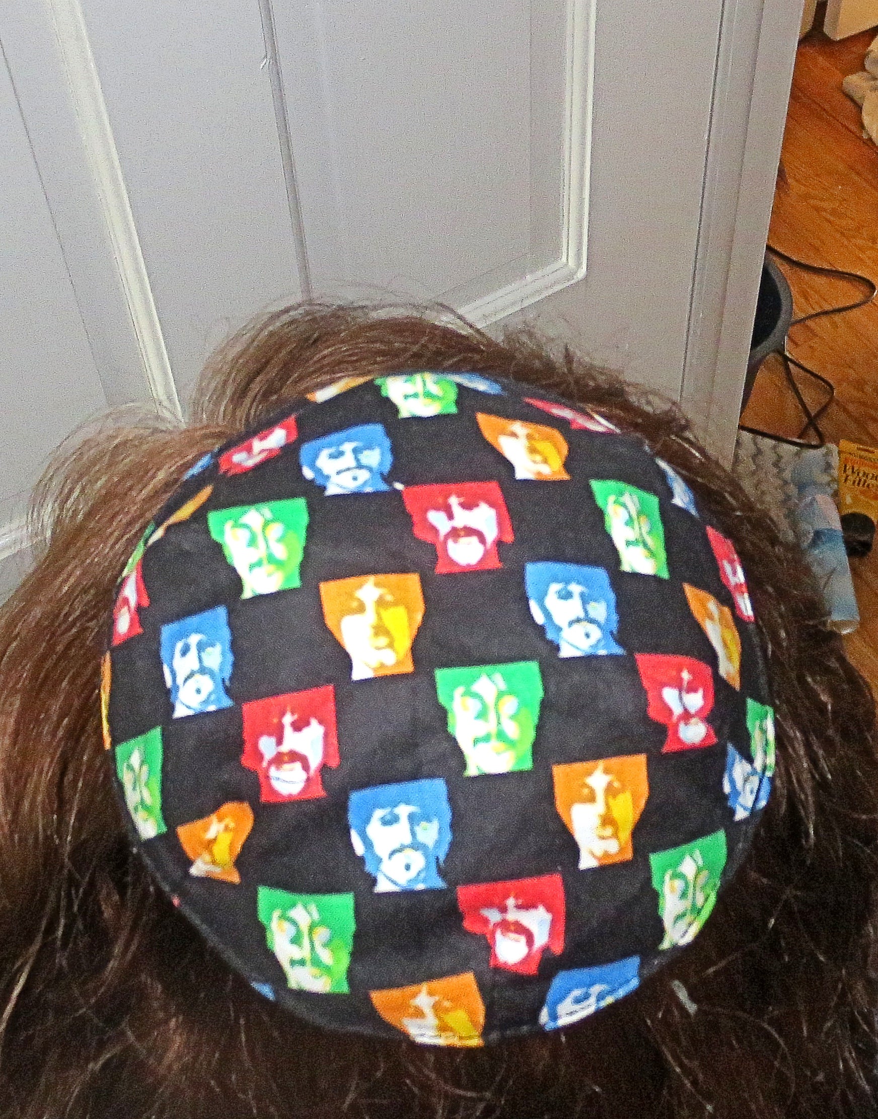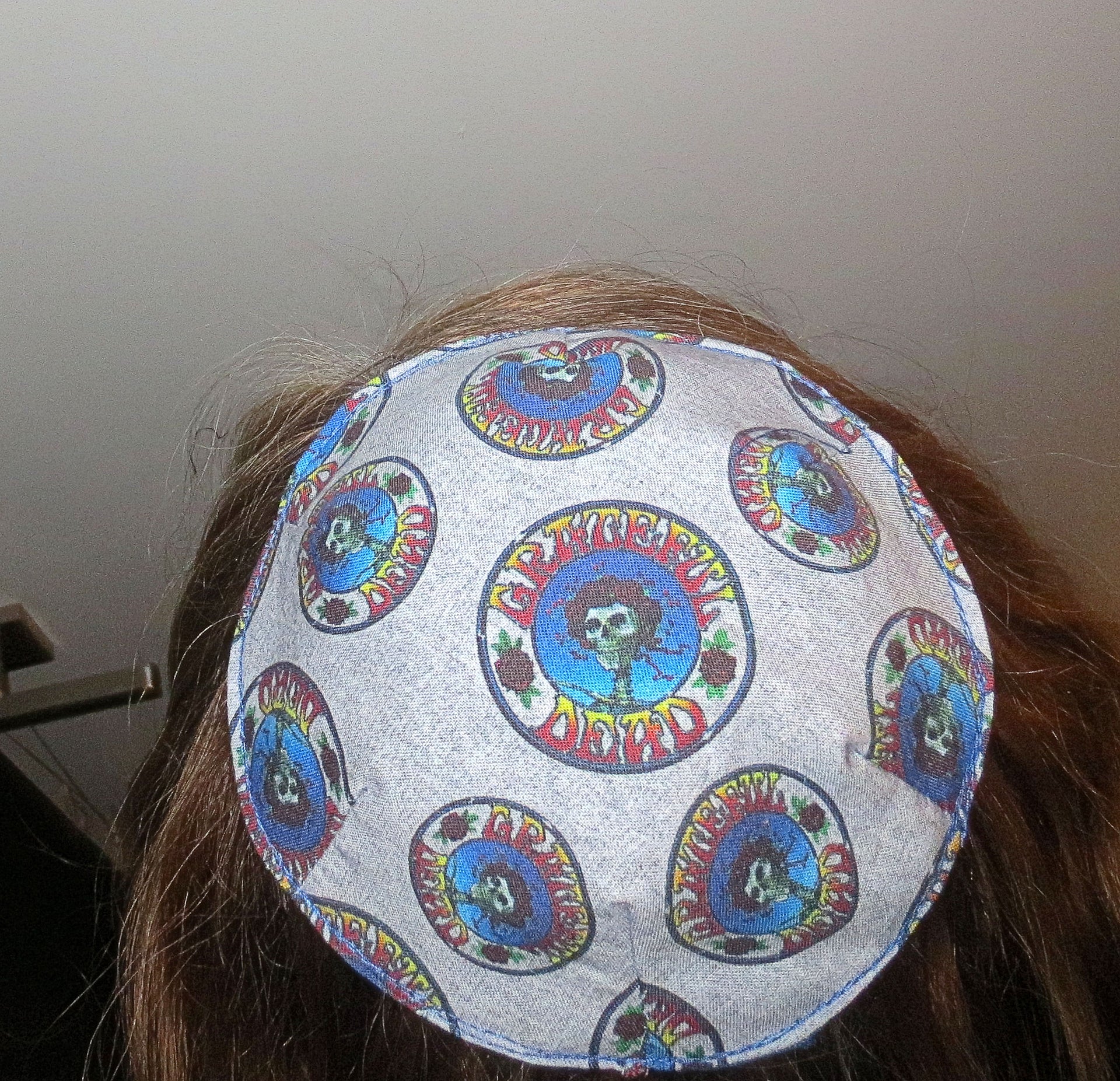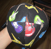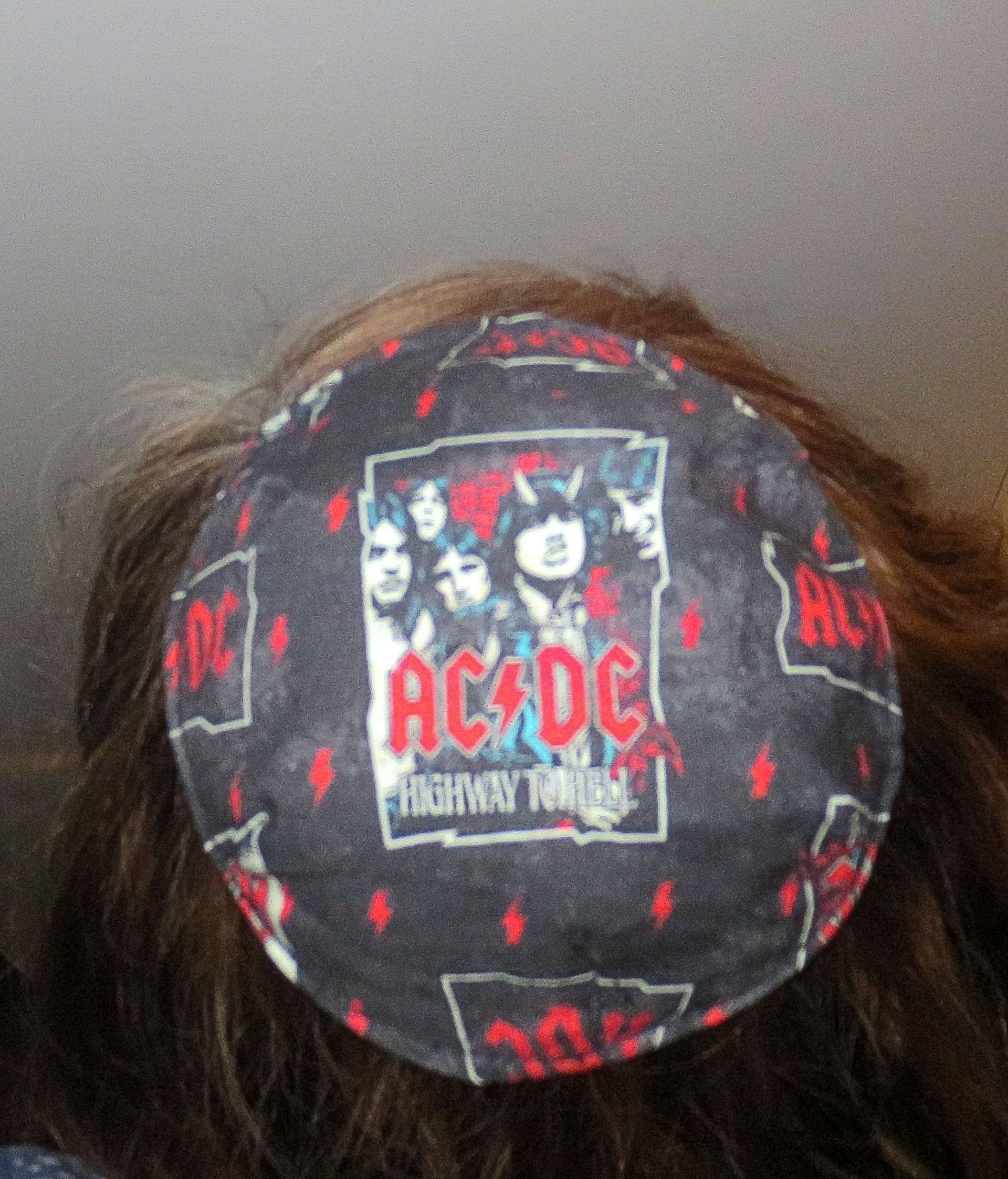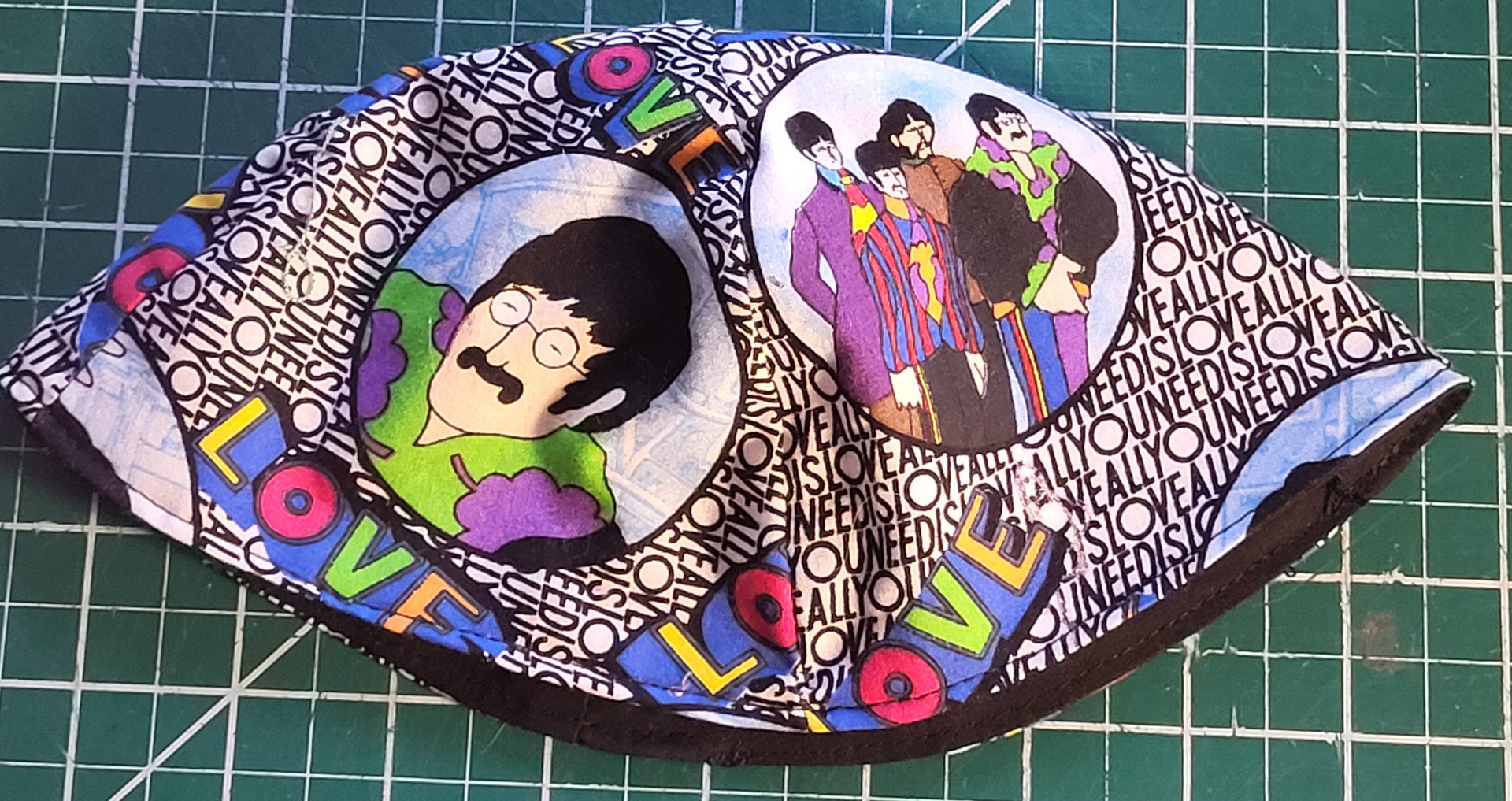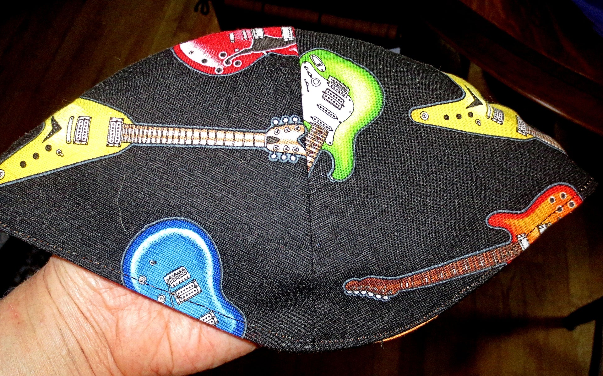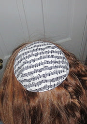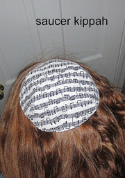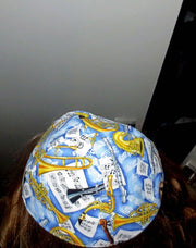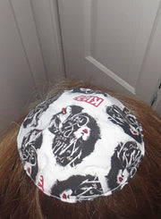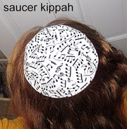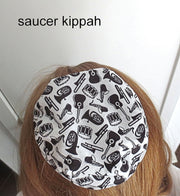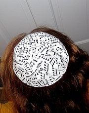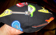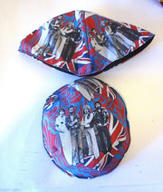 Music kippah or musical yarmulke, instruments, musical notes, the Grateful Dead, the Beatles, Kiss, ACDC, The Who, All you need is Love, the Beatles. These wonderful kippot are available in my traditional 4 panel styling as well as my saucer/small styling.