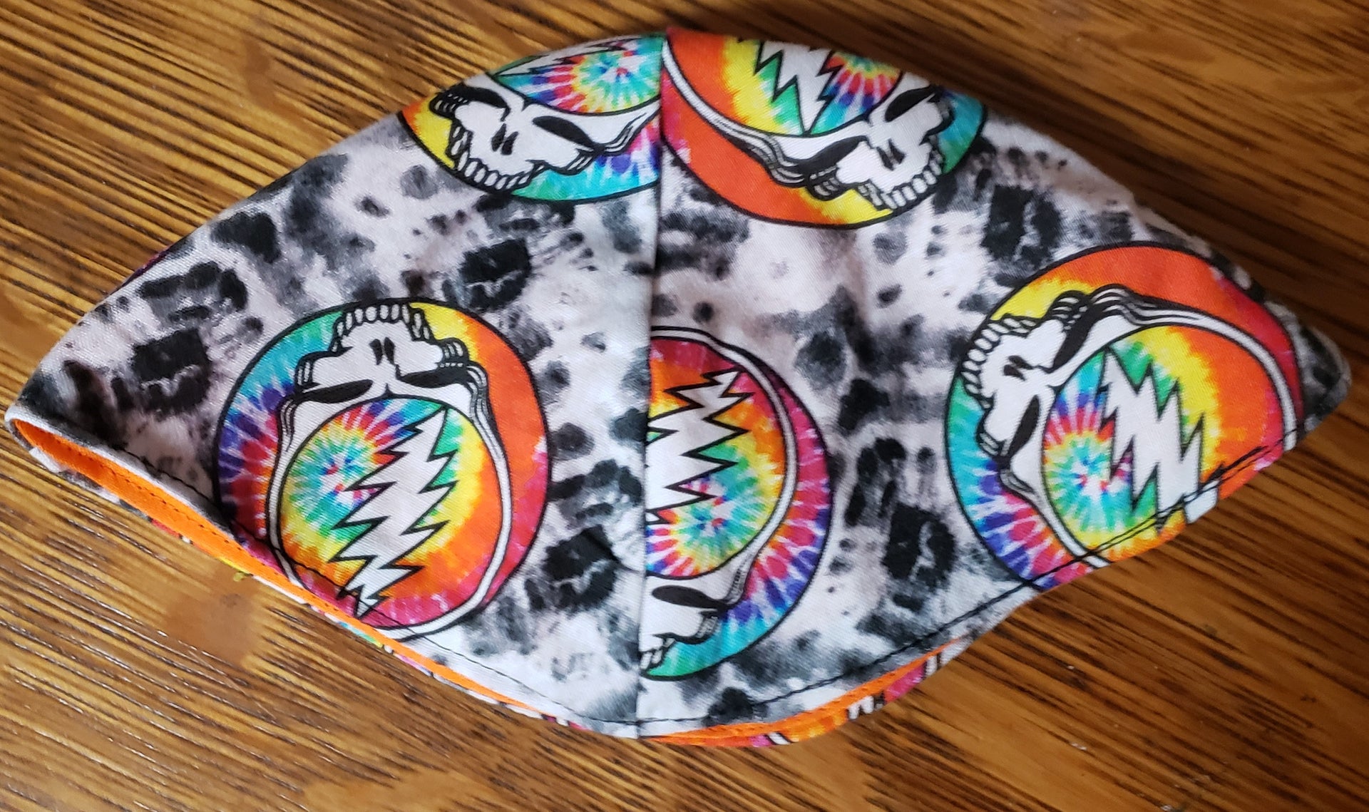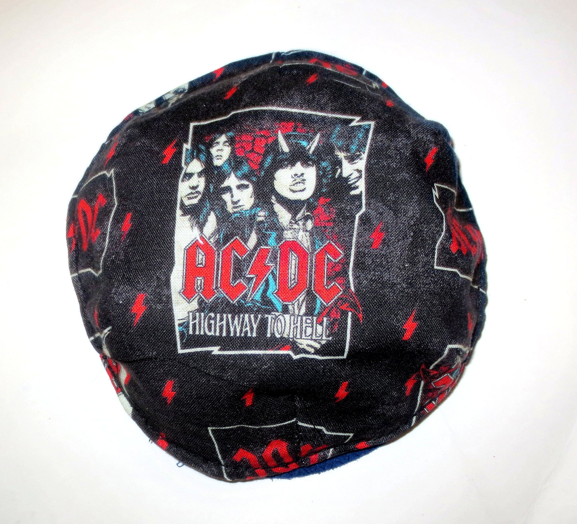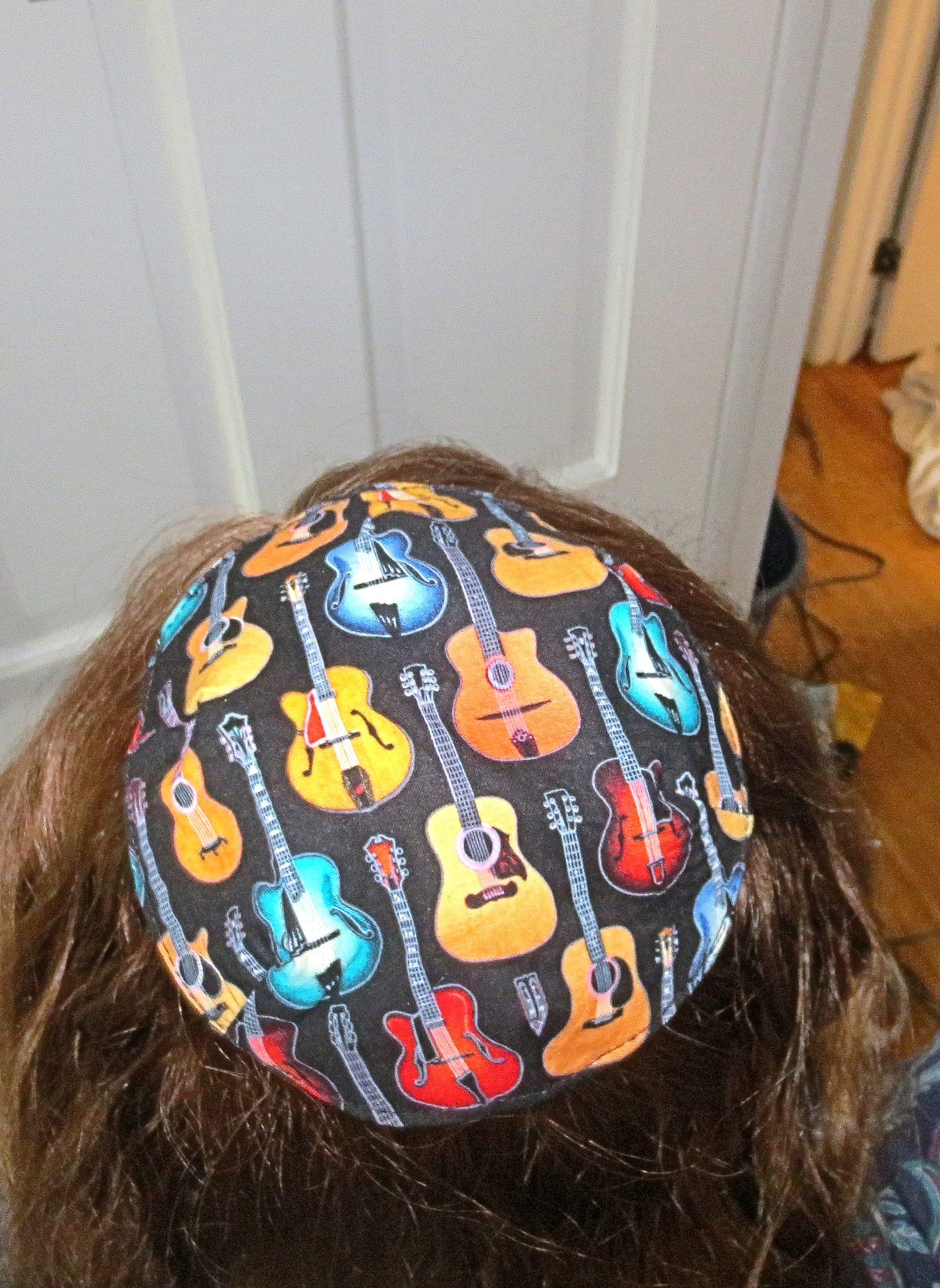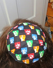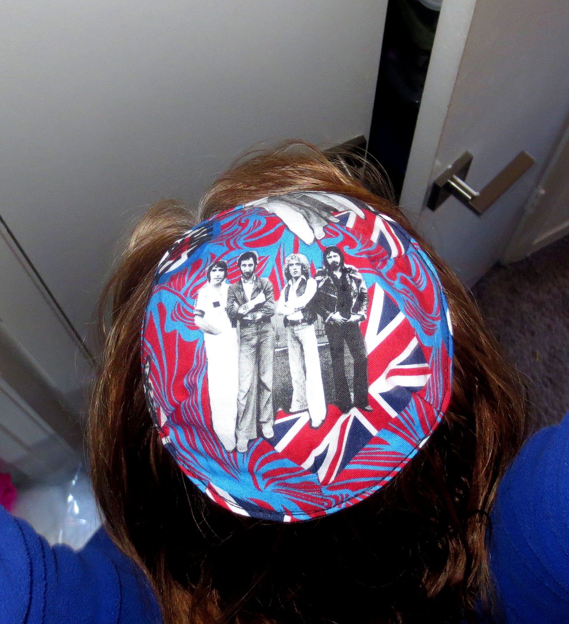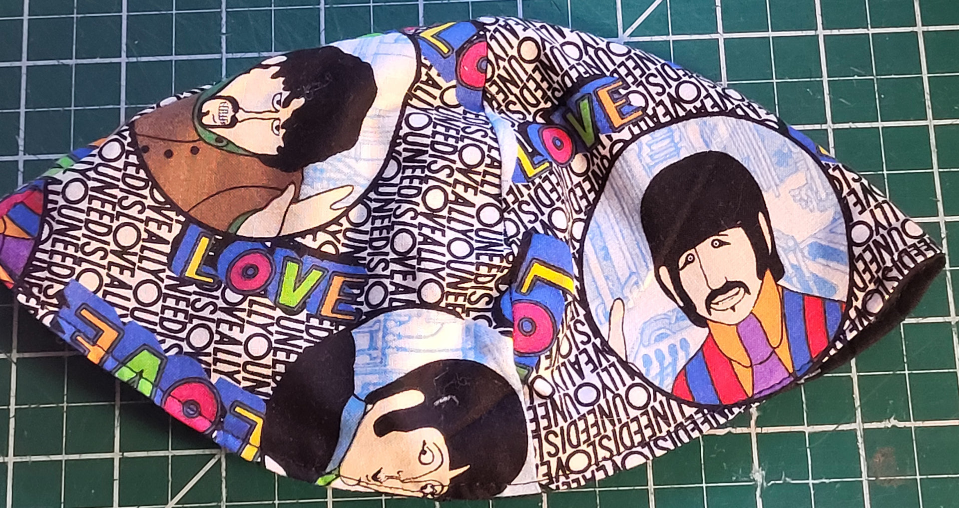 Music kippah or musical yarmulke, instruments, musical notes, the Grateful Dead, the Beatles, Kiss, ACDC, The Who, All you need is Love, the Beatles. These wonderful kippot are available in my traditional 4 panel styling as well as my saucer/small styling.