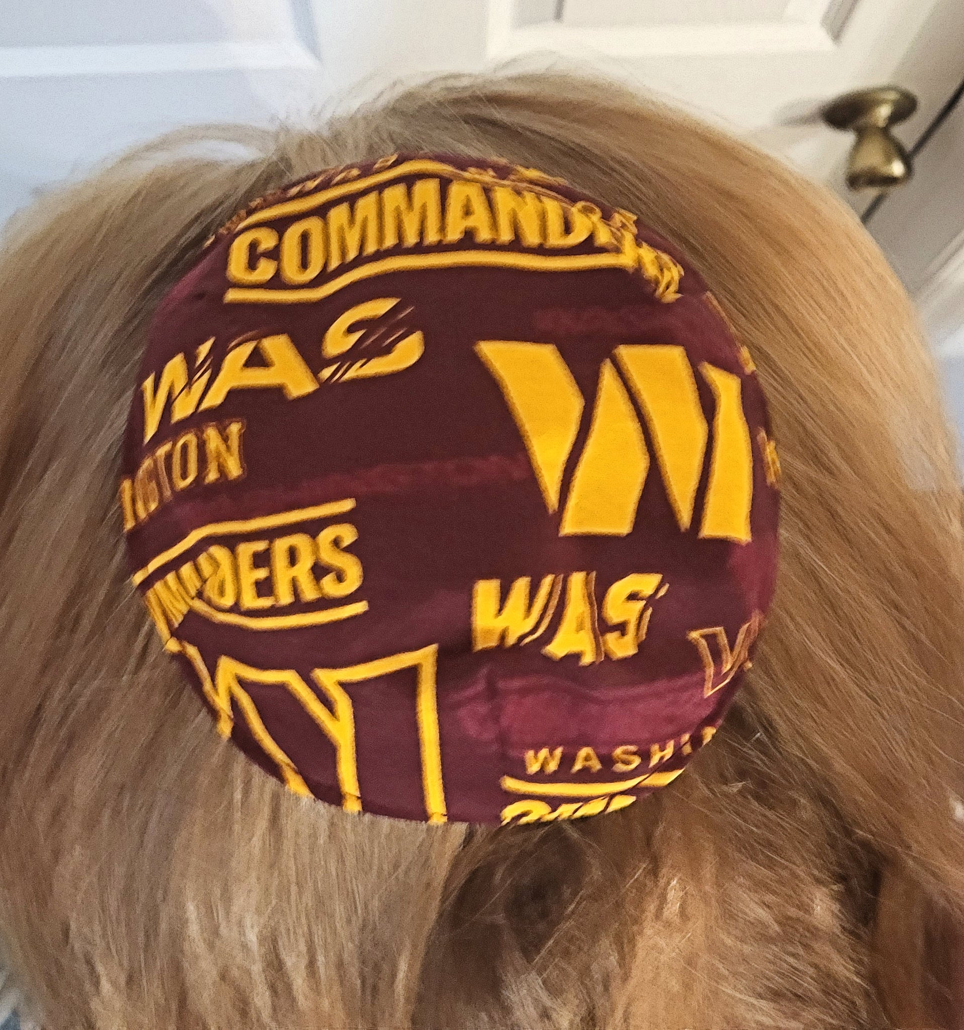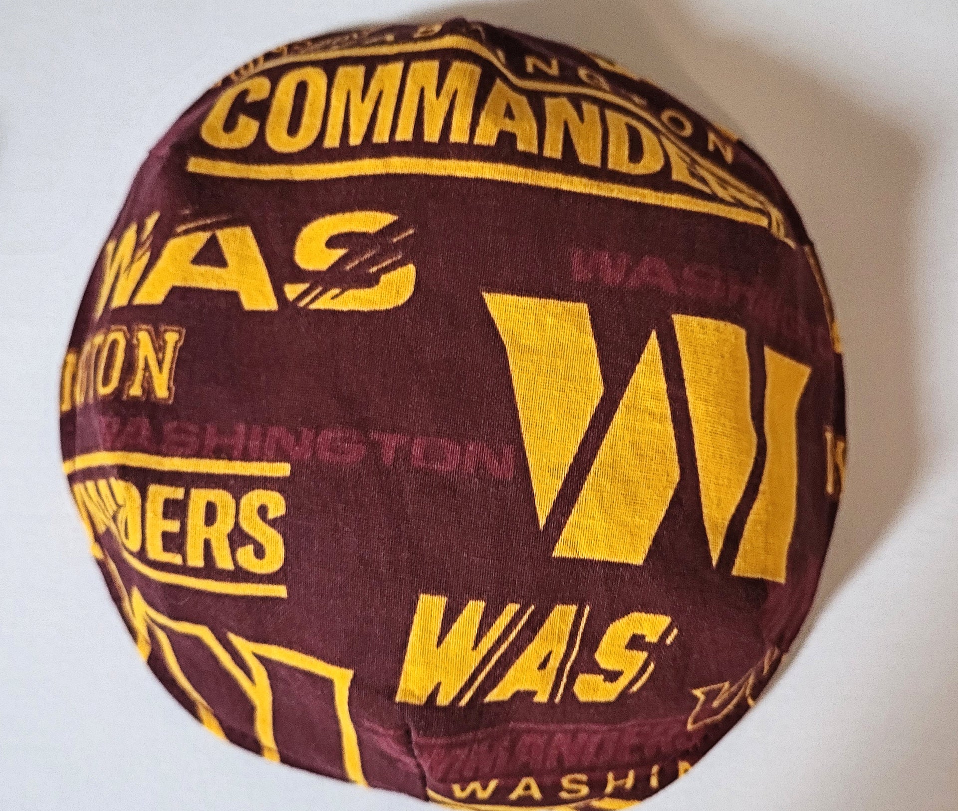 Reversible saucer kippah for your favorite NFL team! This is my saucer kippah which has very clear motifs as there are no seams on the top of the kippah, reversible, and washable! So you get two kippahs for the price of one. Side one is your NFL team, side two is a solid color.