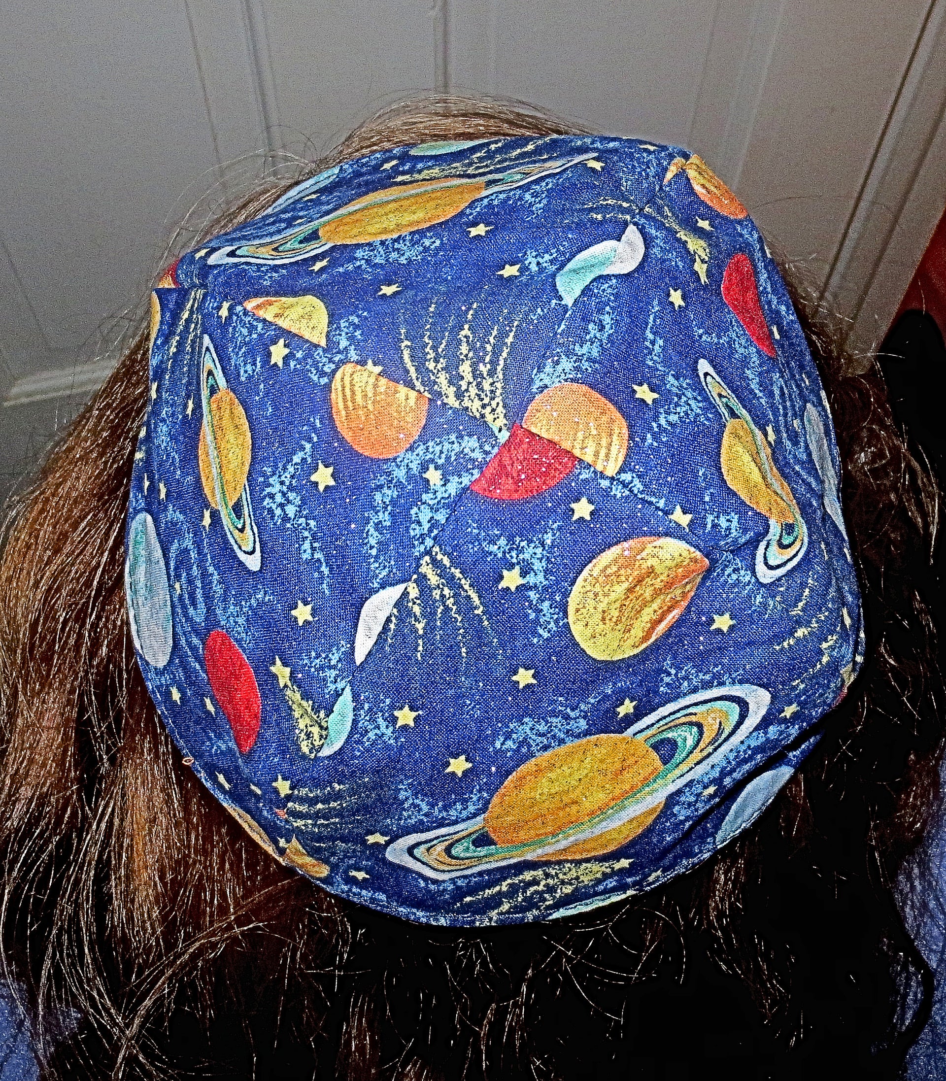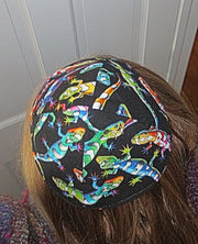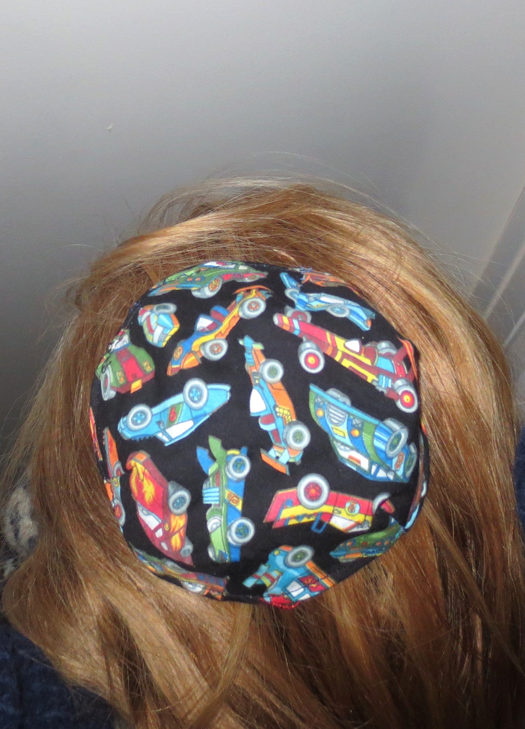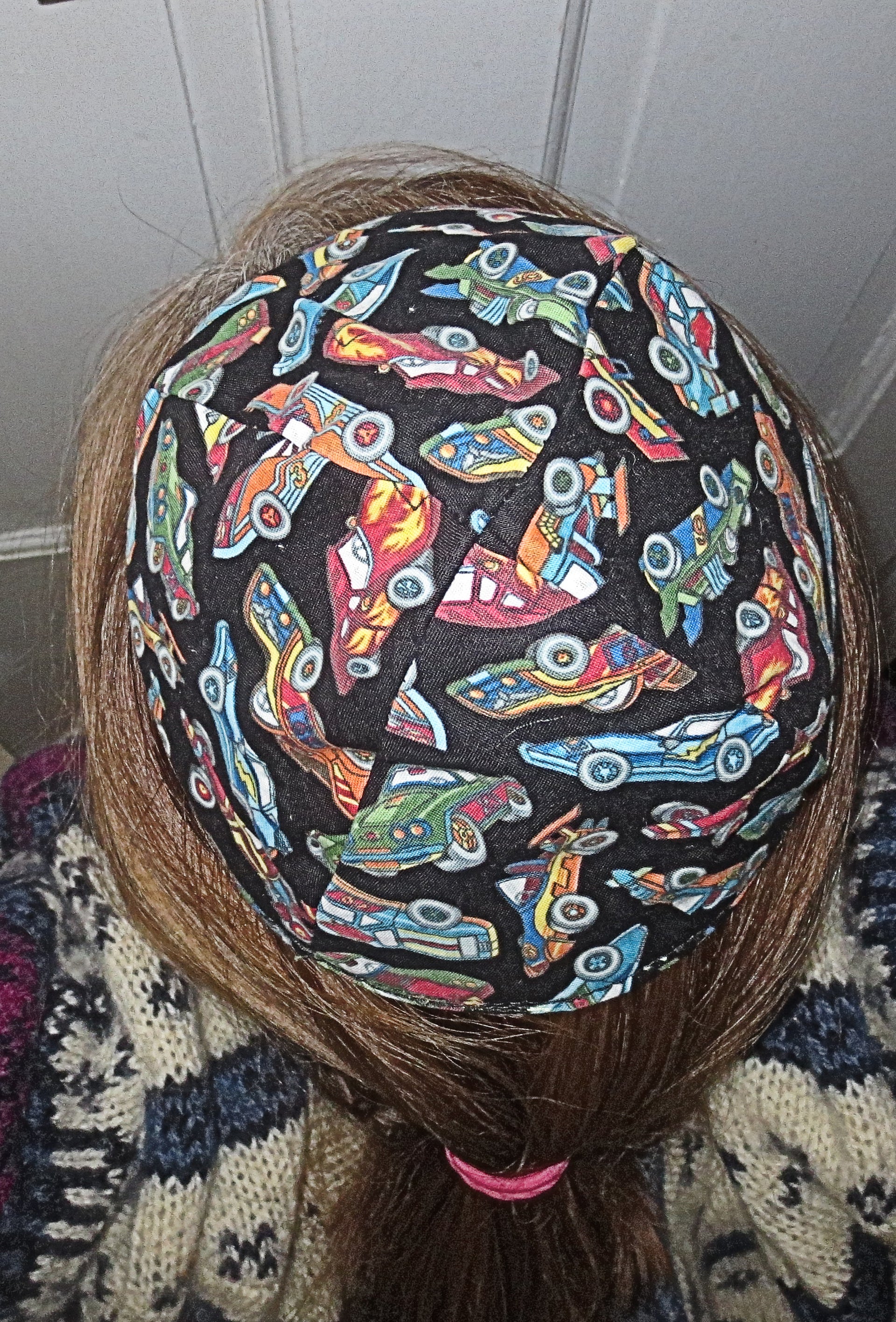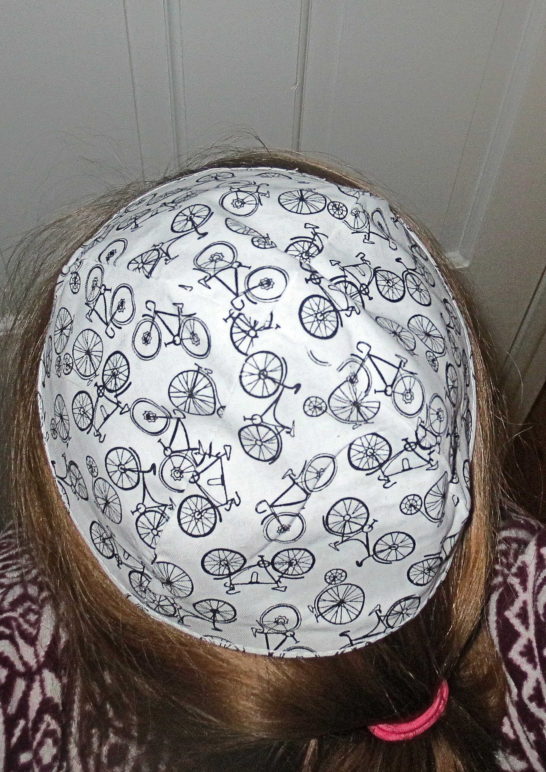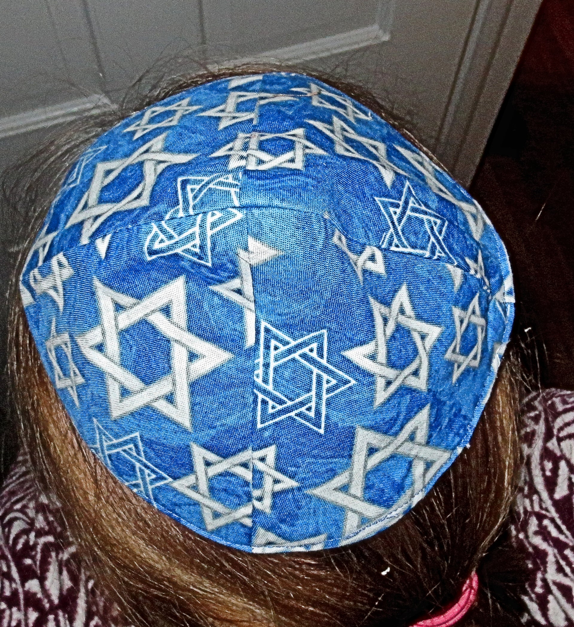 Our regular sized kippahs are 7.5" in diameter or 11" from one side over the top to the other side.  They fit nicely, molding to your head without clips, for most people aged 3 and up.  Please measure your head, especially for children, as age generally does not always correlate with head size (some kids have bigger than average heads while some have smaller than average).  Also please consider your hair style (thick, thin, bald, etc.) when selecting this style.  You may need clips.