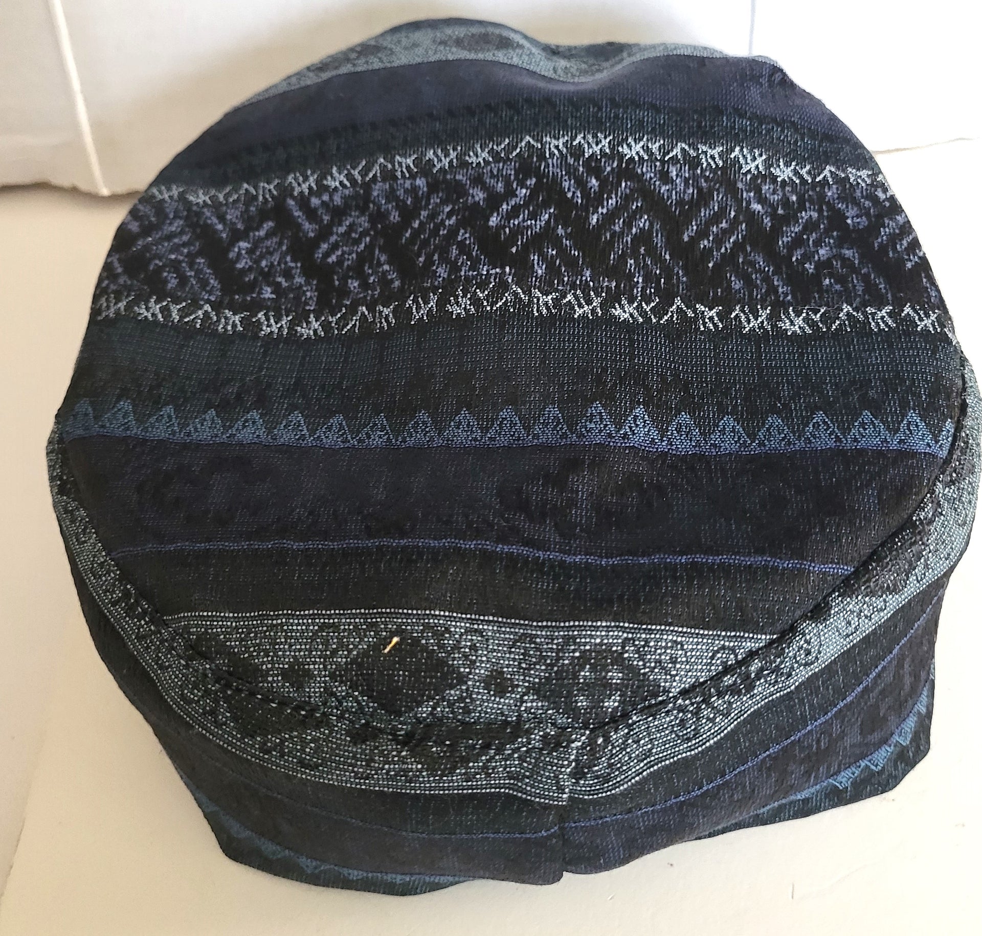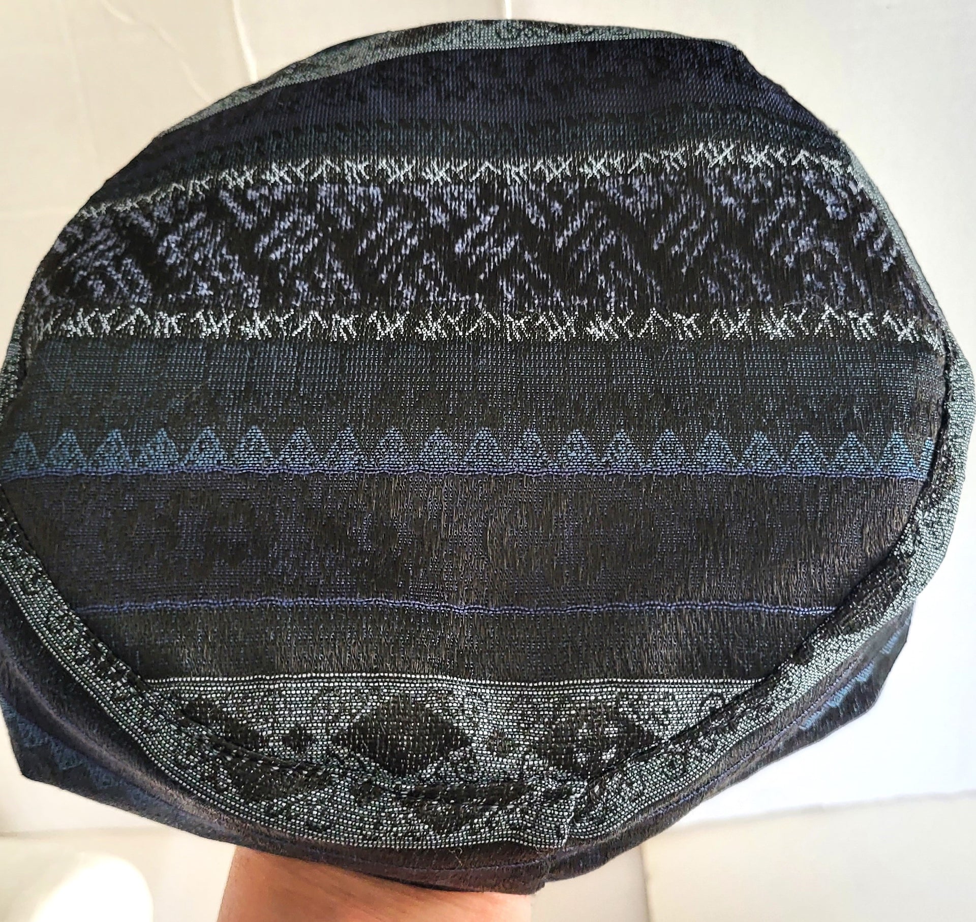 All of these beautiful Sephardic hat style yarmulkes are made from high quality tapestry fabrics (cotton blends), the band is double the tapestry fabric and it is lined as well.  Dry clean only.
