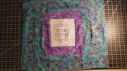 I made this beautiful and colorful challah cover with a beautiful watermark grape batik and an abstract peacock design (purple, metallic gold, black, teal, turquoise) cotton fabric. These fabrics make this Shabbos challah cover absolutely stunning!