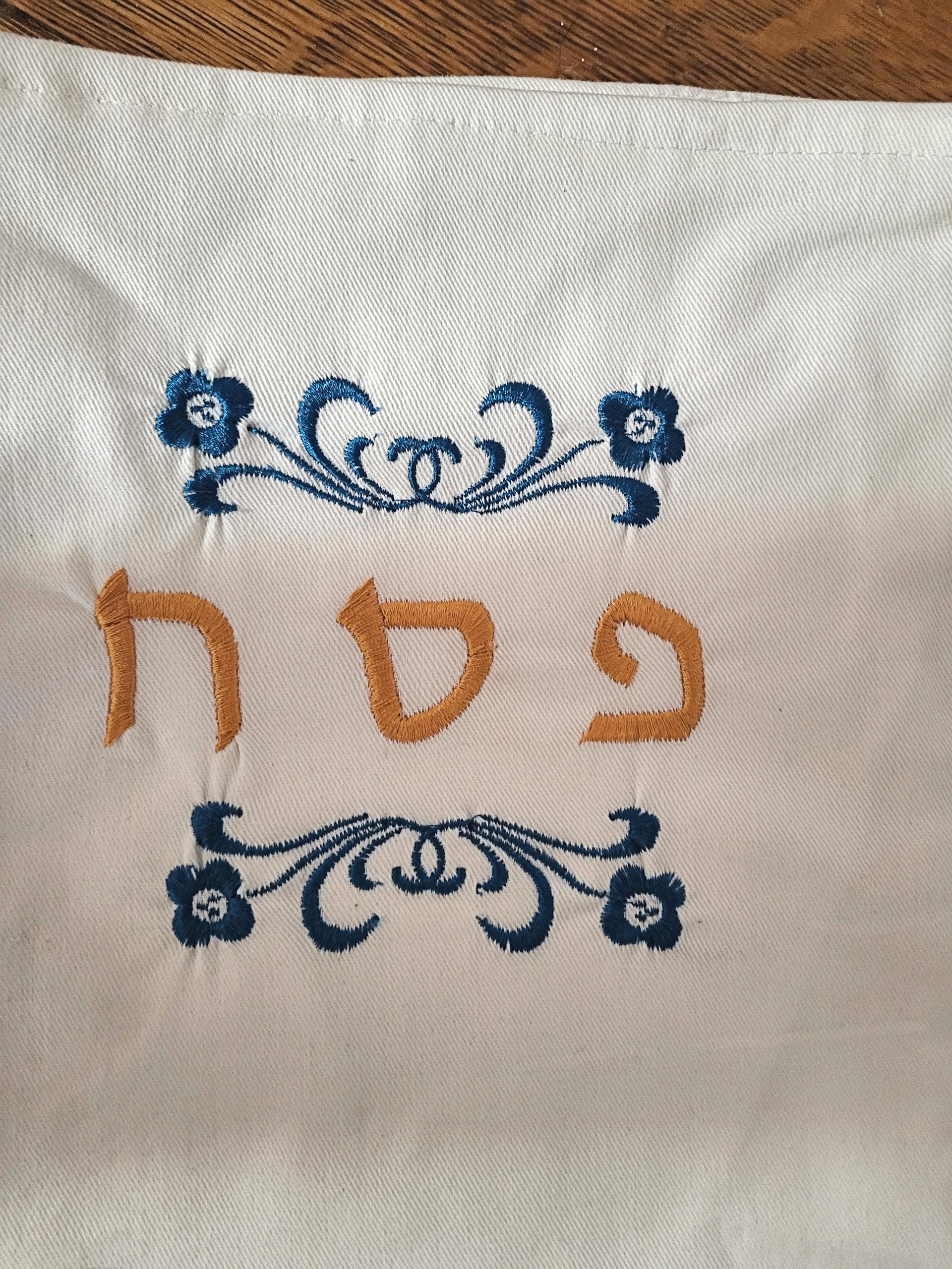 I have embroidered the word "Passover" or Pesach in Hebrew surrounded by beautiful scroll work.