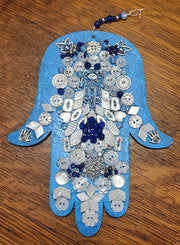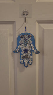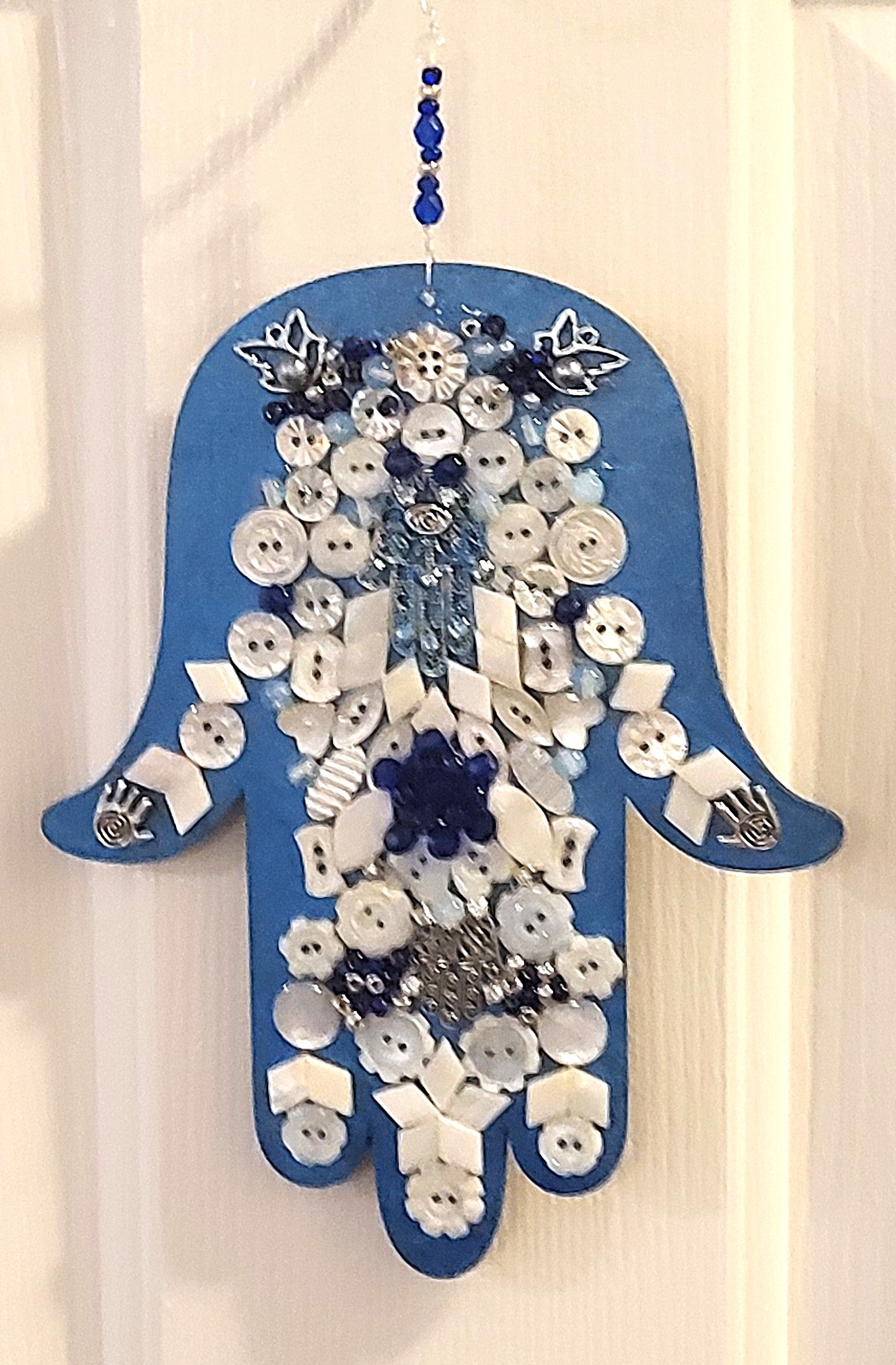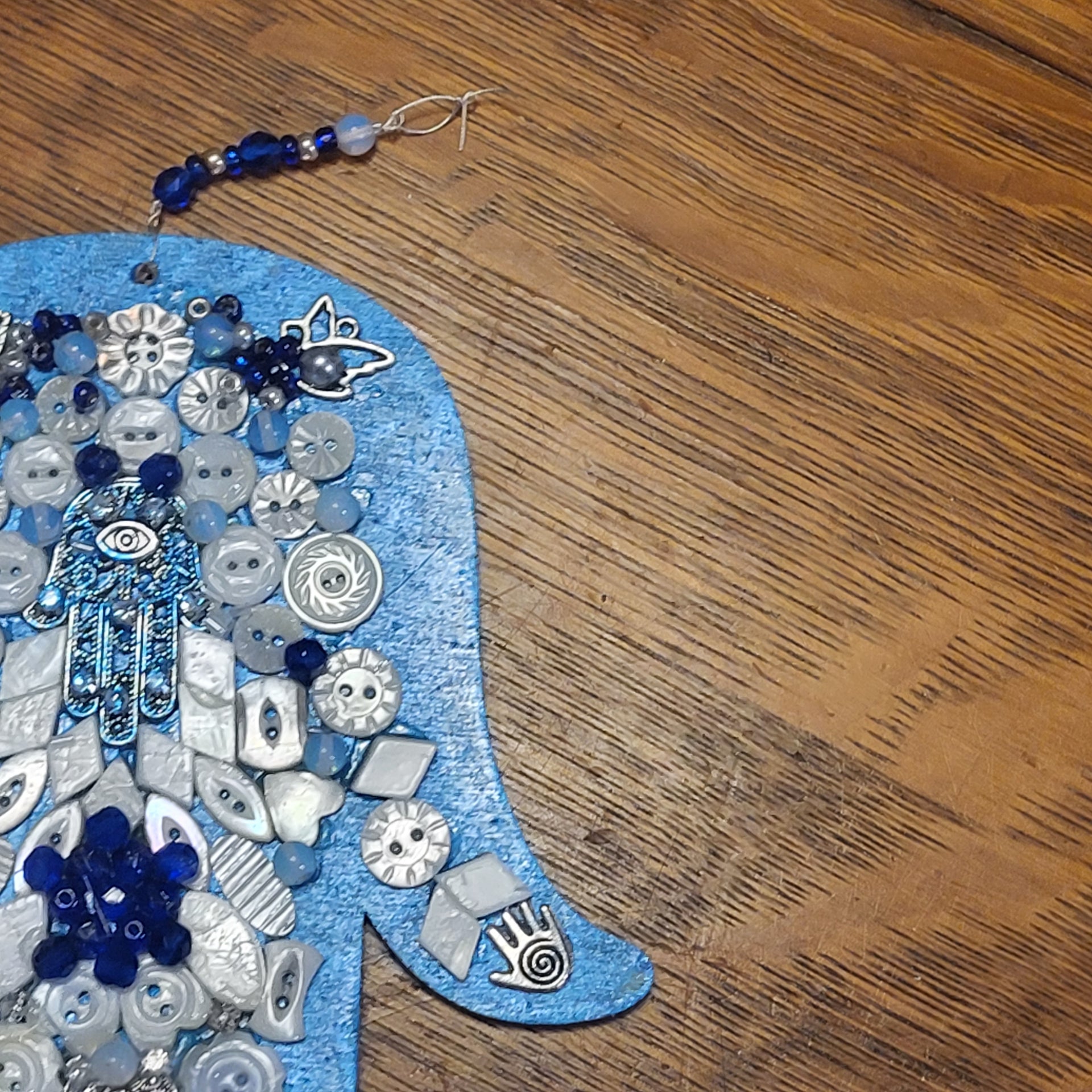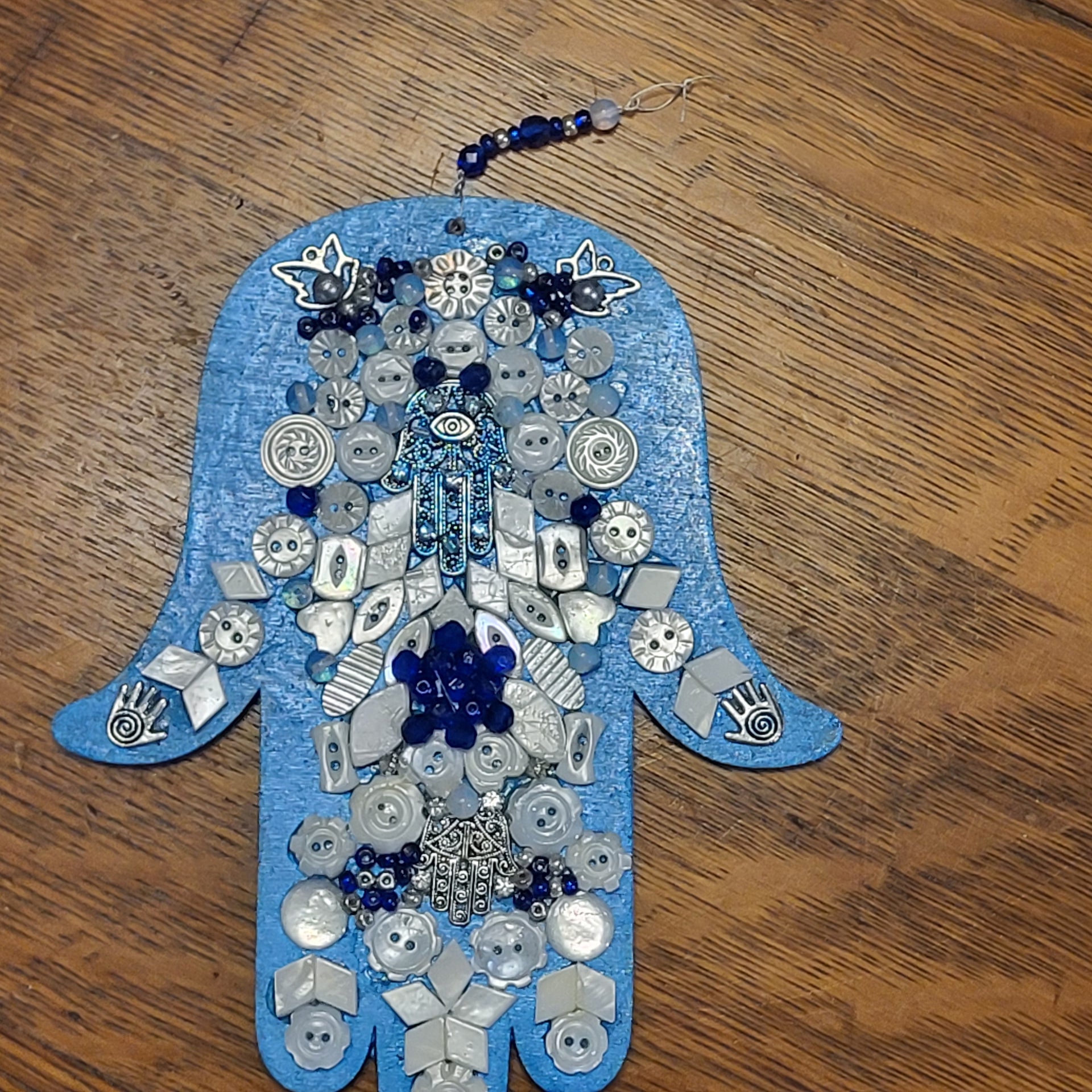 I created this Hamsa by painting a pearl medium blue to the wooden hand. I incorporated vintage and antique Mother of Pearl buttons, diamond , heart, round, and oval shaped Mother of Pearls. I included 4 nonlead silver plated of G-d charms and 2 bird charms. I accented the piece with vintage rhinestones, Czech round glass beads, and Czech glass seed beads. I applied a protective water-proof sealant to the front of the Hamsa. You will hang this unusual wall art hangs the the beaded top attachment.
