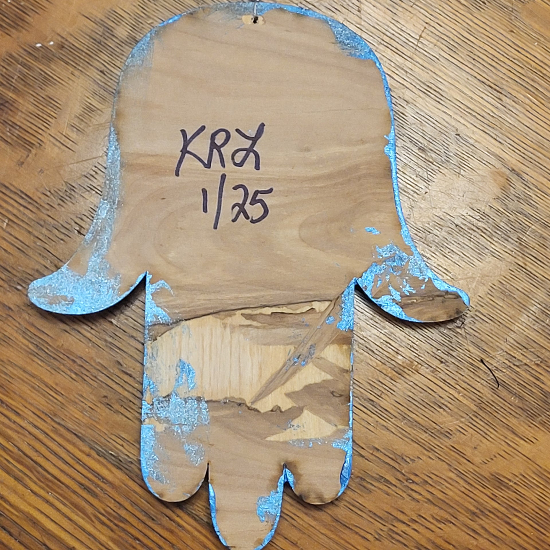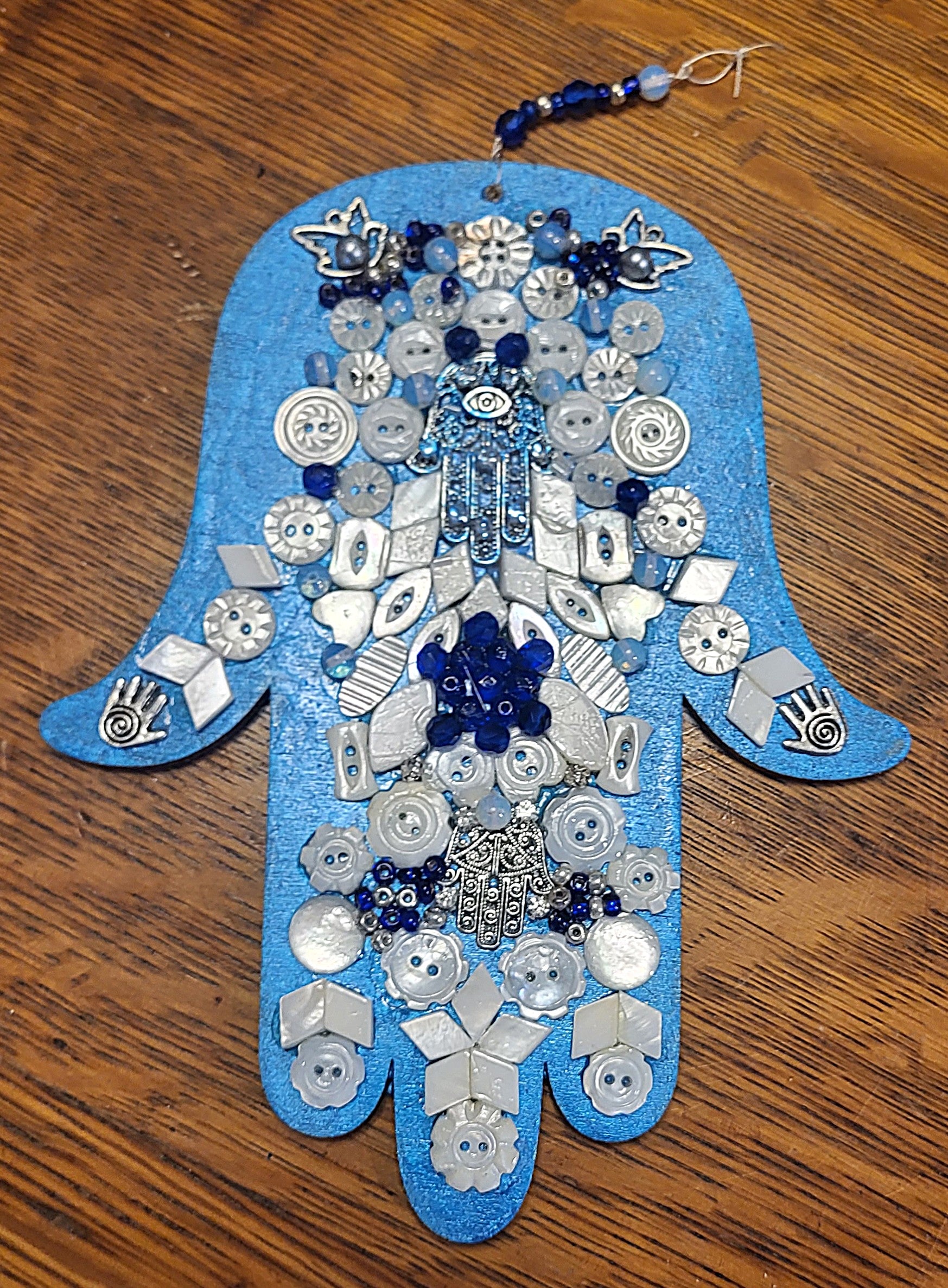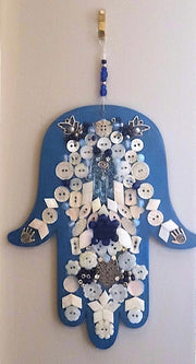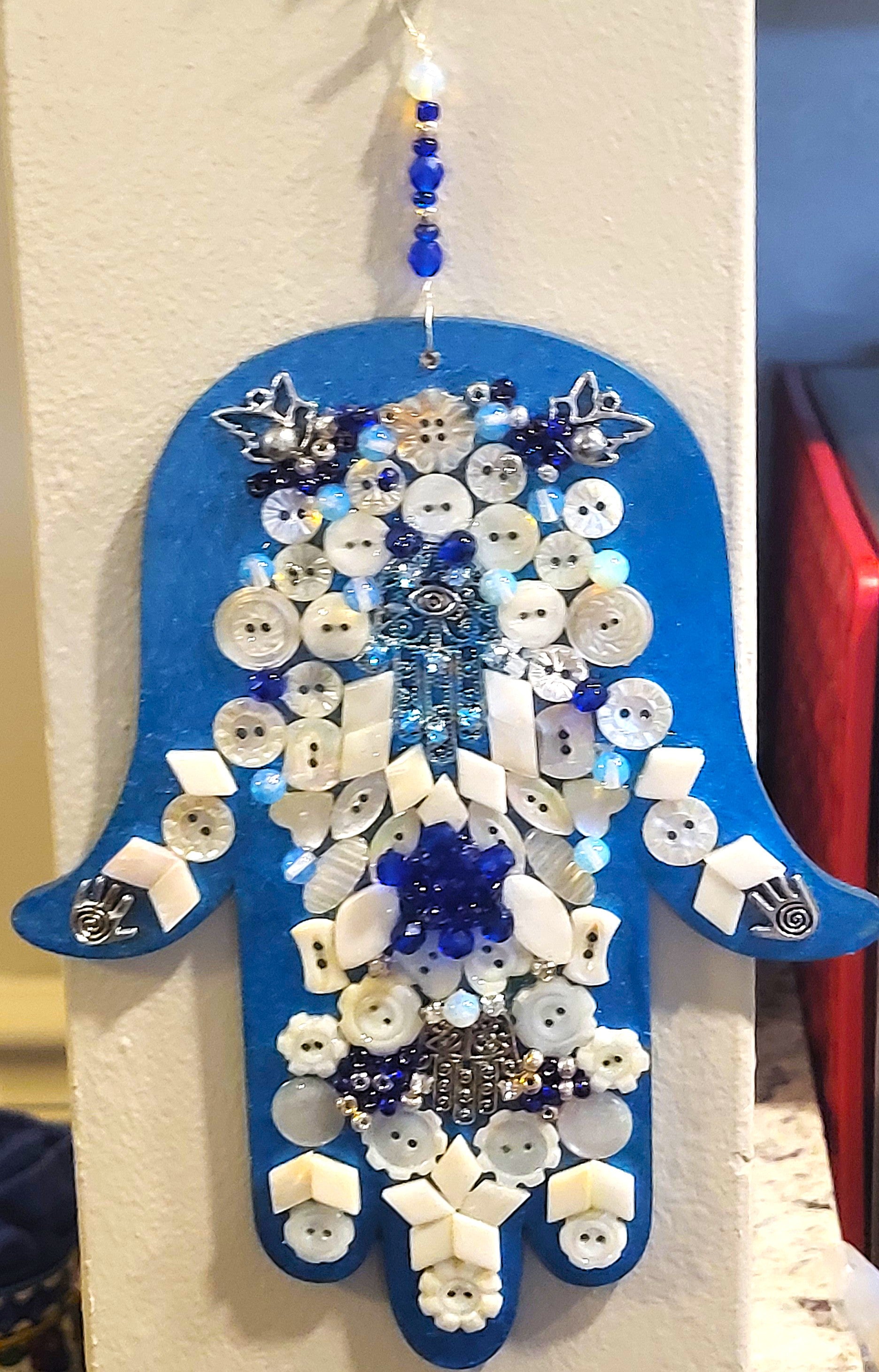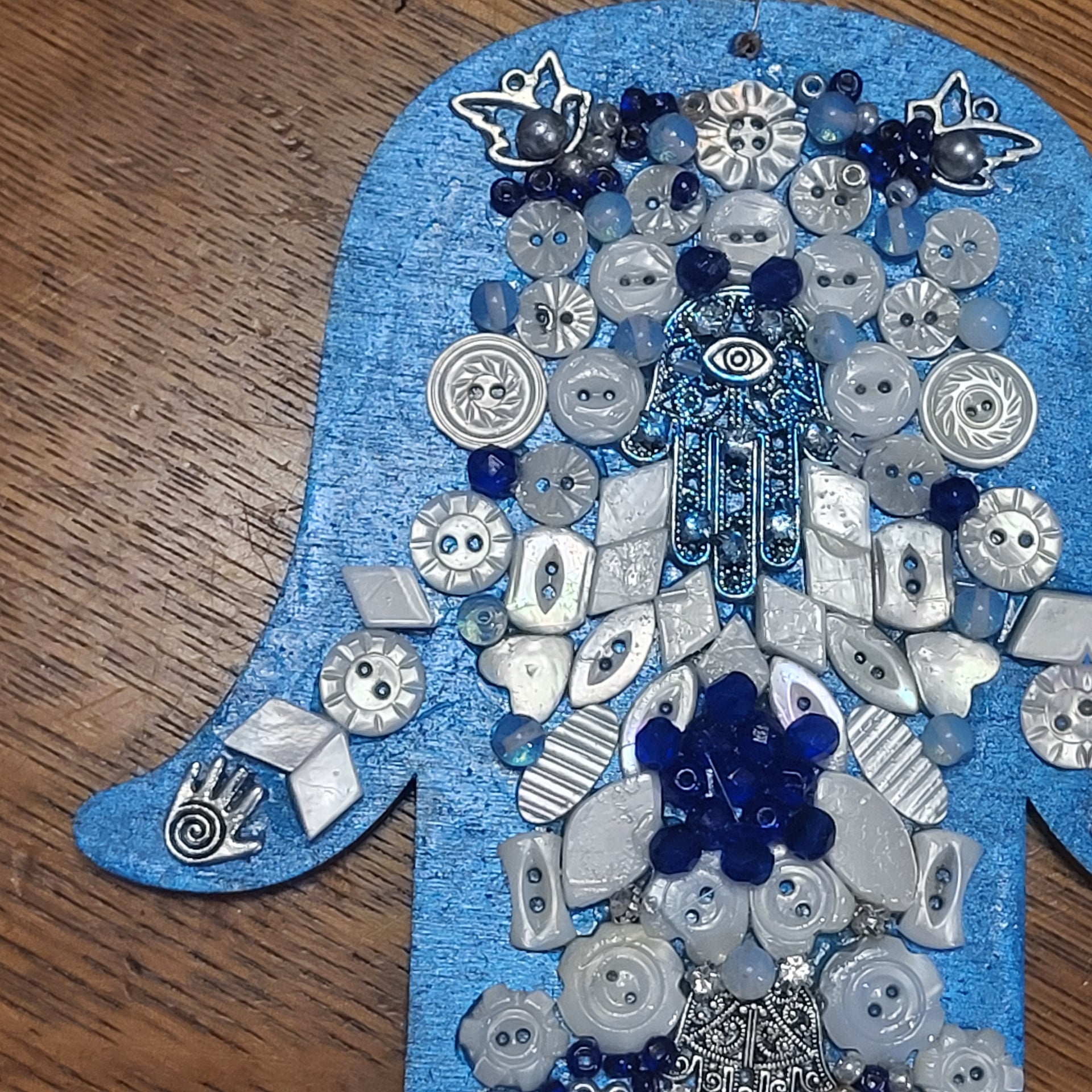 I created this Hamsa by painting a pearl medium blue to the wooden hand. I incorporated vintage and antique Mother of Pearl buttons, diamond , heart, round, and oval shaped Mother of Pearls. I included 4 nonlead silver plated of G-d charms and 2 bird charms. I accented the piece with vintage rhinestones, Czech round glass beads, and Czech glass seed beads. I applied a protective water-proof sealant to the front of the Hamsa. You will hang this unusual wall art hangs the the beaded top attachment.