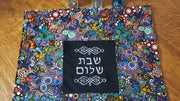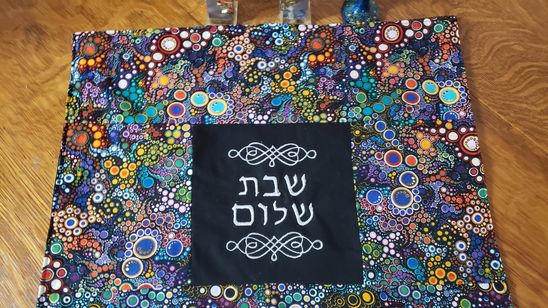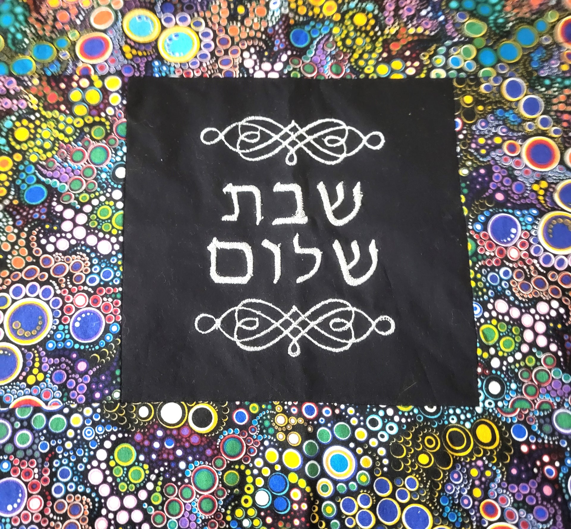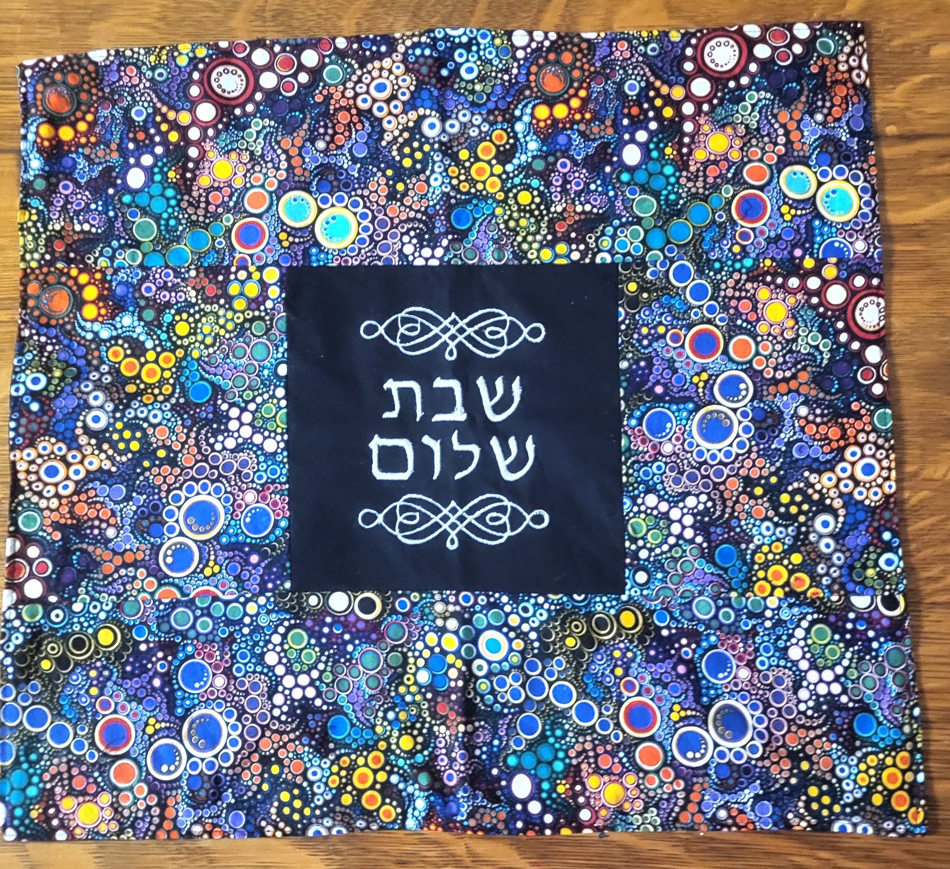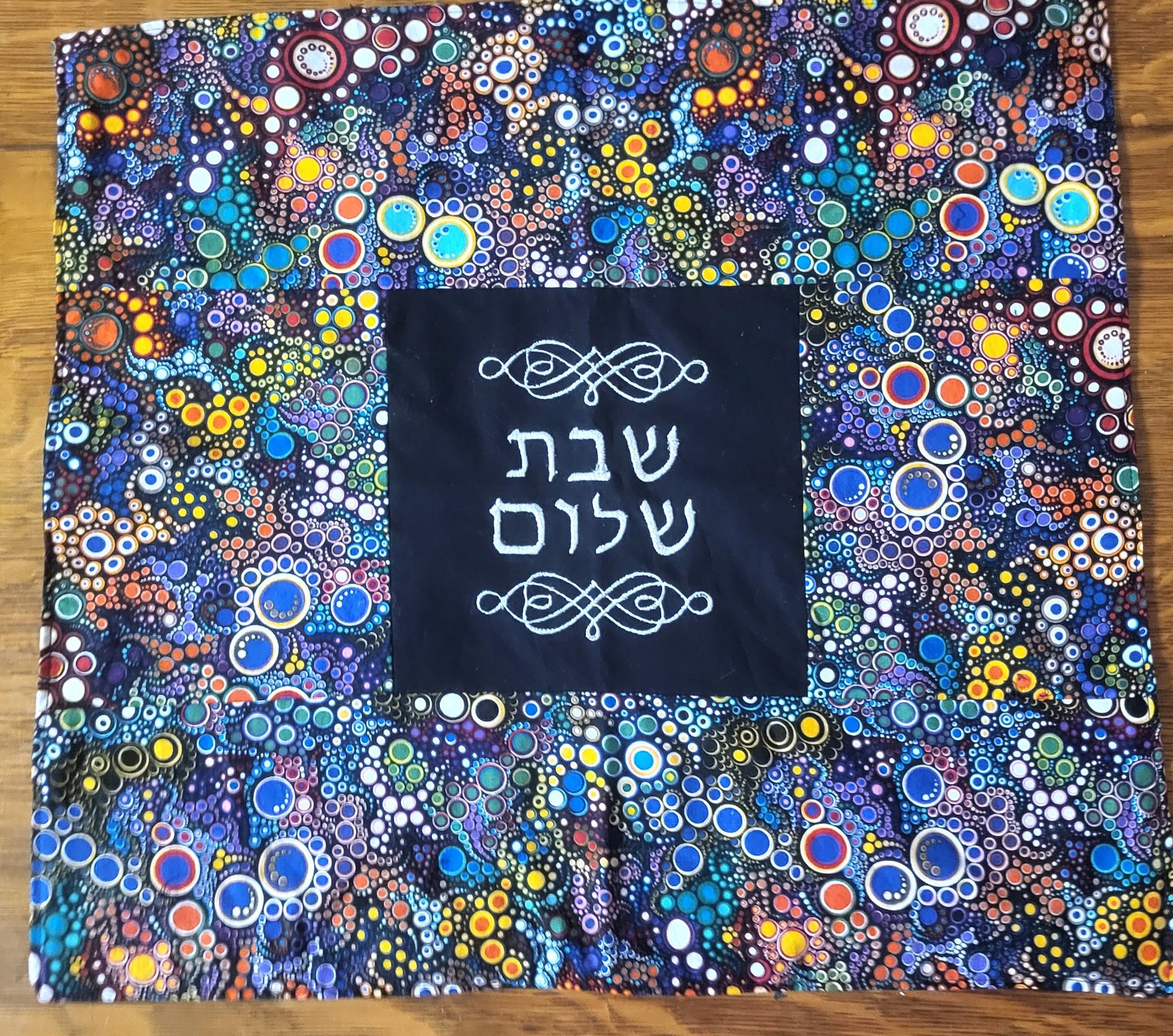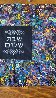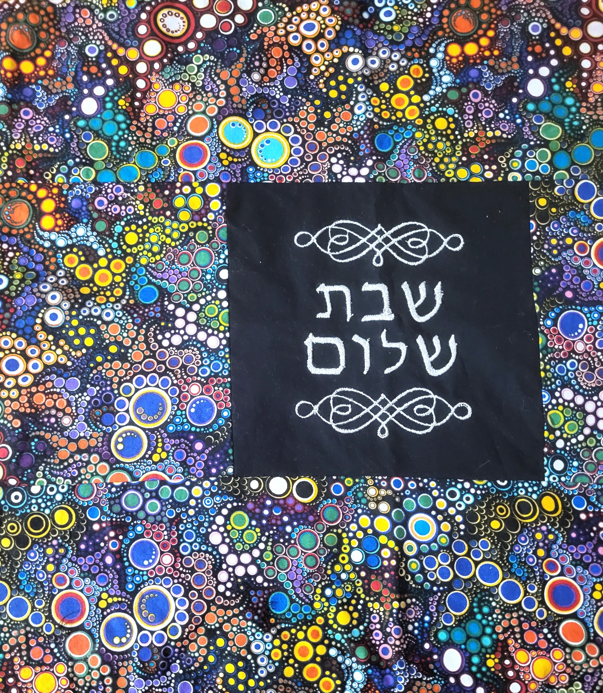 This stunning challah cover makes a great wedding, anniversary, engagement gift. This modern challah cover or table mat can be used for every Shabbat. I machine embroidered in white "Shabbat Shalom" in Hebrew onto Black Kona Cotton. The outer vibrant fabric is a wonderful effervescence bubbly design of multiple colors (Robert Kaufman fabric). The reverse side is a Kona cotton black.