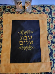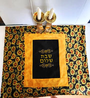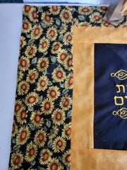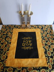 Sunflowers embroidered Challah cover modern  design, Shabbat Shalom in Hebrew great wedding, anniversary, engagement gift. This modern challah cover or table mat can be used for every Shabbat. I machine embroidered in gold colored thread "Shabbat Shalom" in Hebrew with  onto black Kona Cotton.
