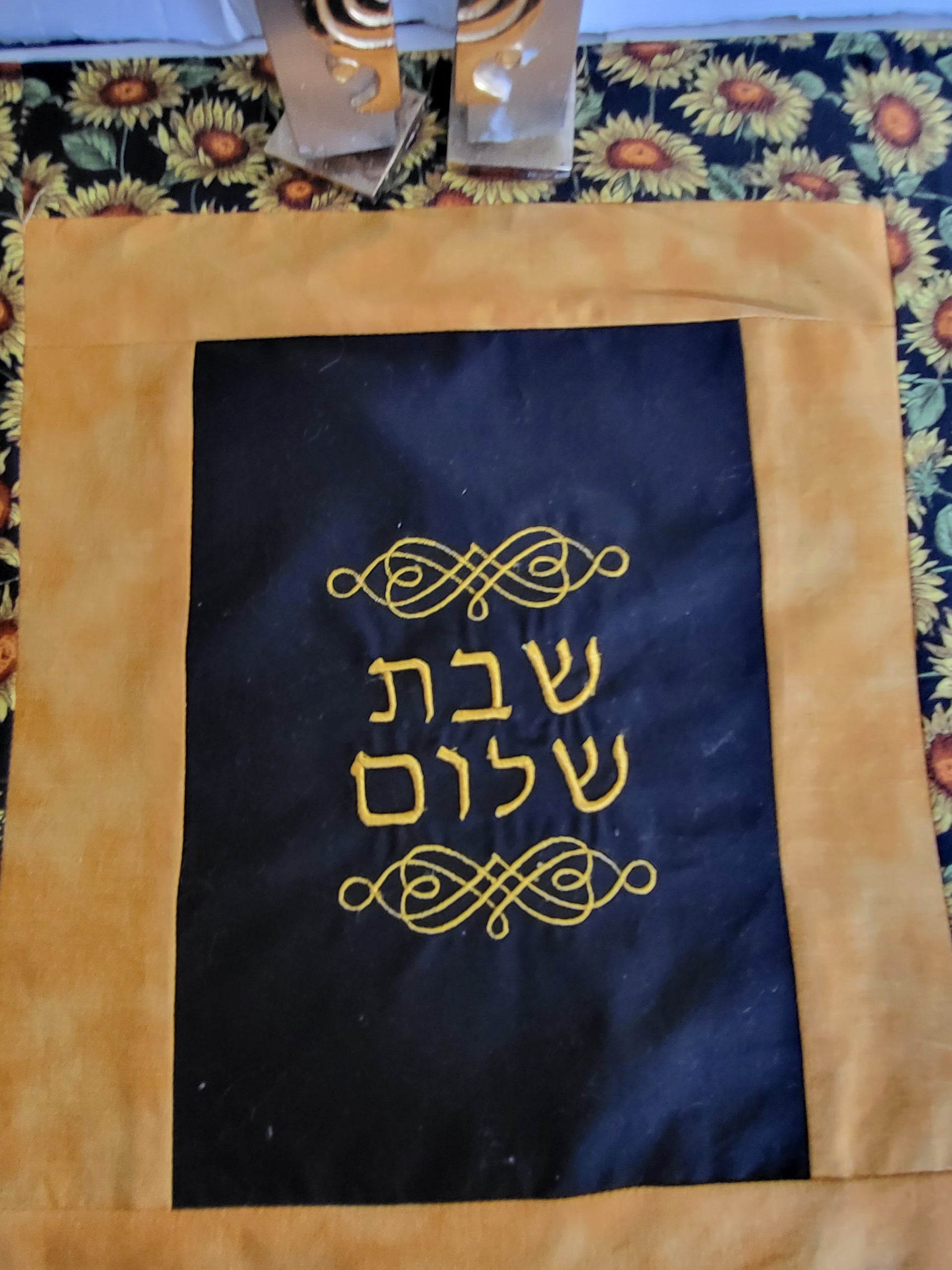 This gorgeous reversible Judaica mat makes an awesome centerpiece for any simcha (hostess, housewarming, engagement, wedding) and every Shabbat, and certainly is large  enough to cover 2 loaves of challah. Get matching kippahs in my kippah store. Machine wash and dry (cold recommended, no bleach of any kind), light ironing may be needed.