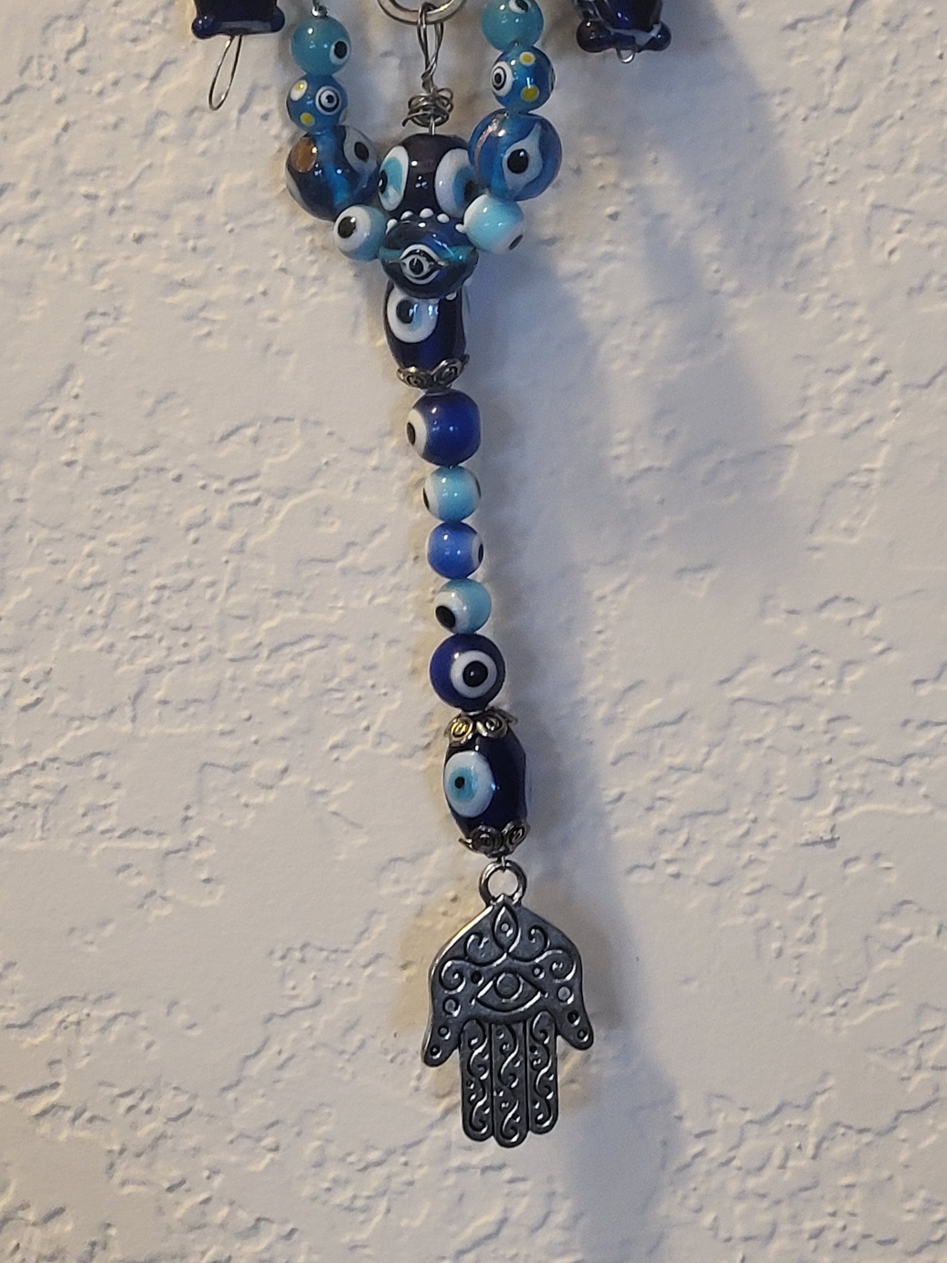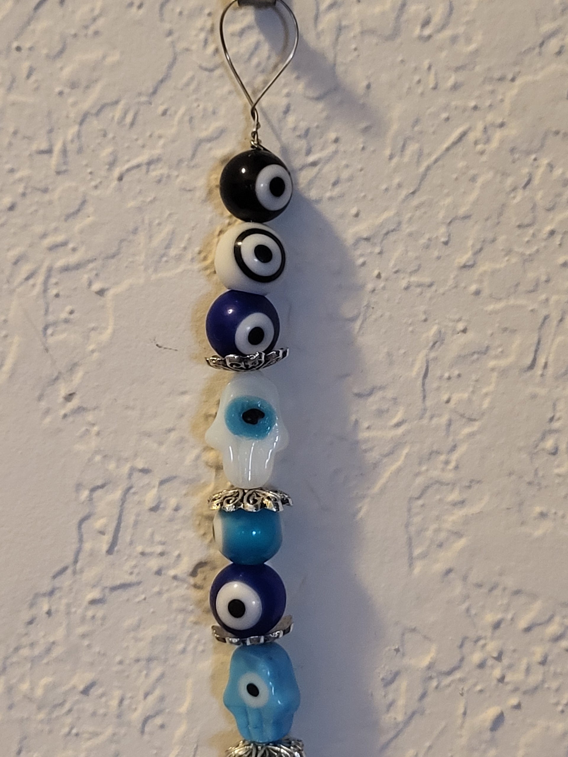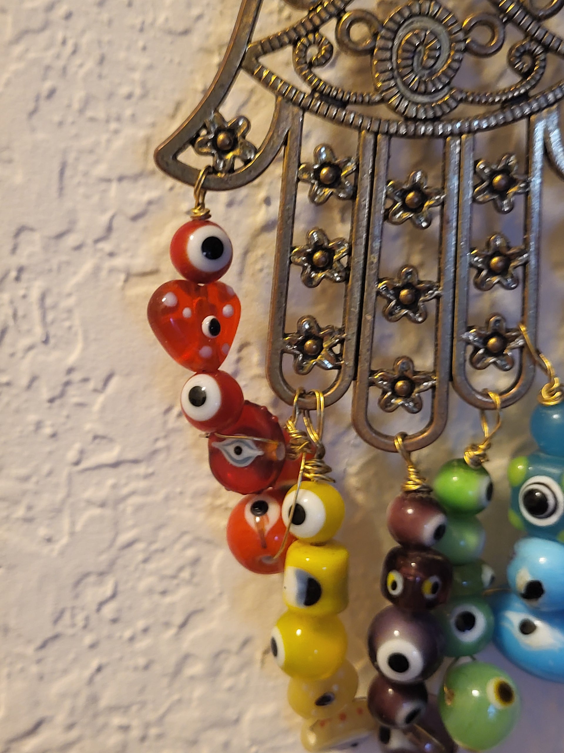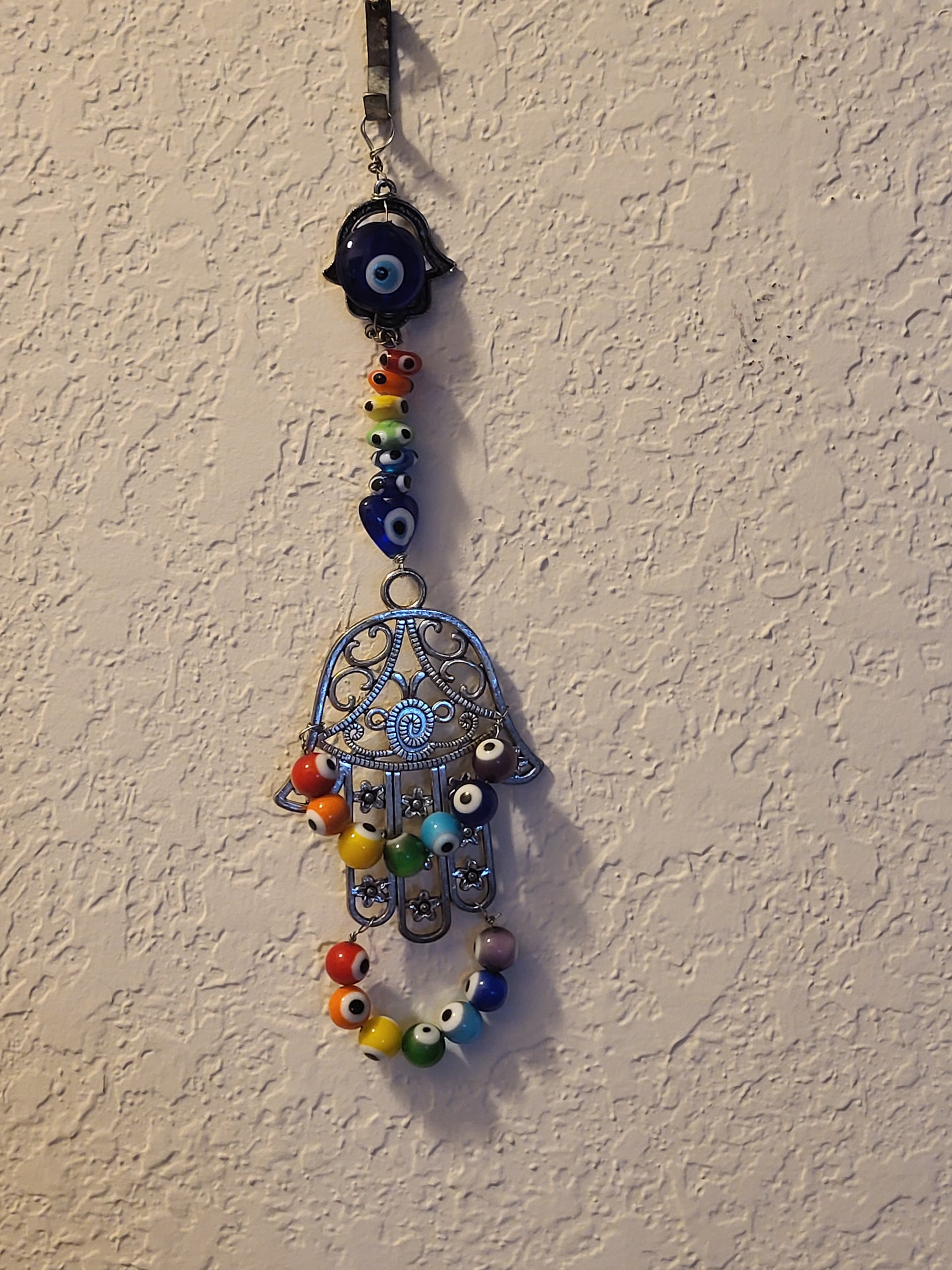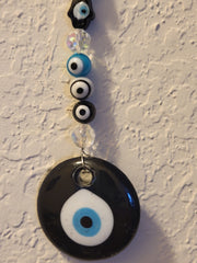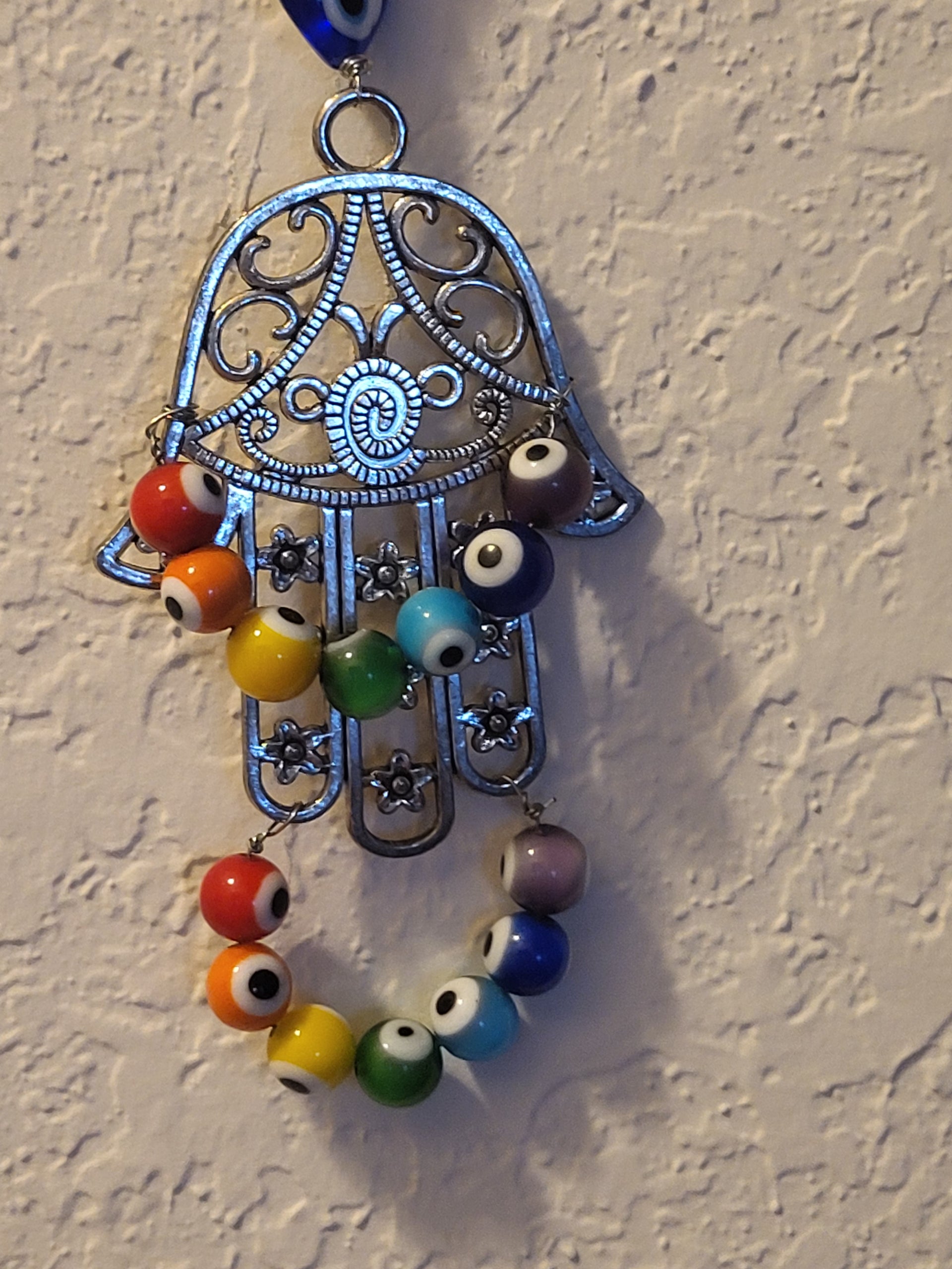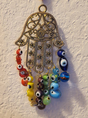 I have created a nice variety of Evil eye themed beaded wall hangings, with and without a Hamsa. According to legend evil eye symbols and amulets protects one from the evil eye.