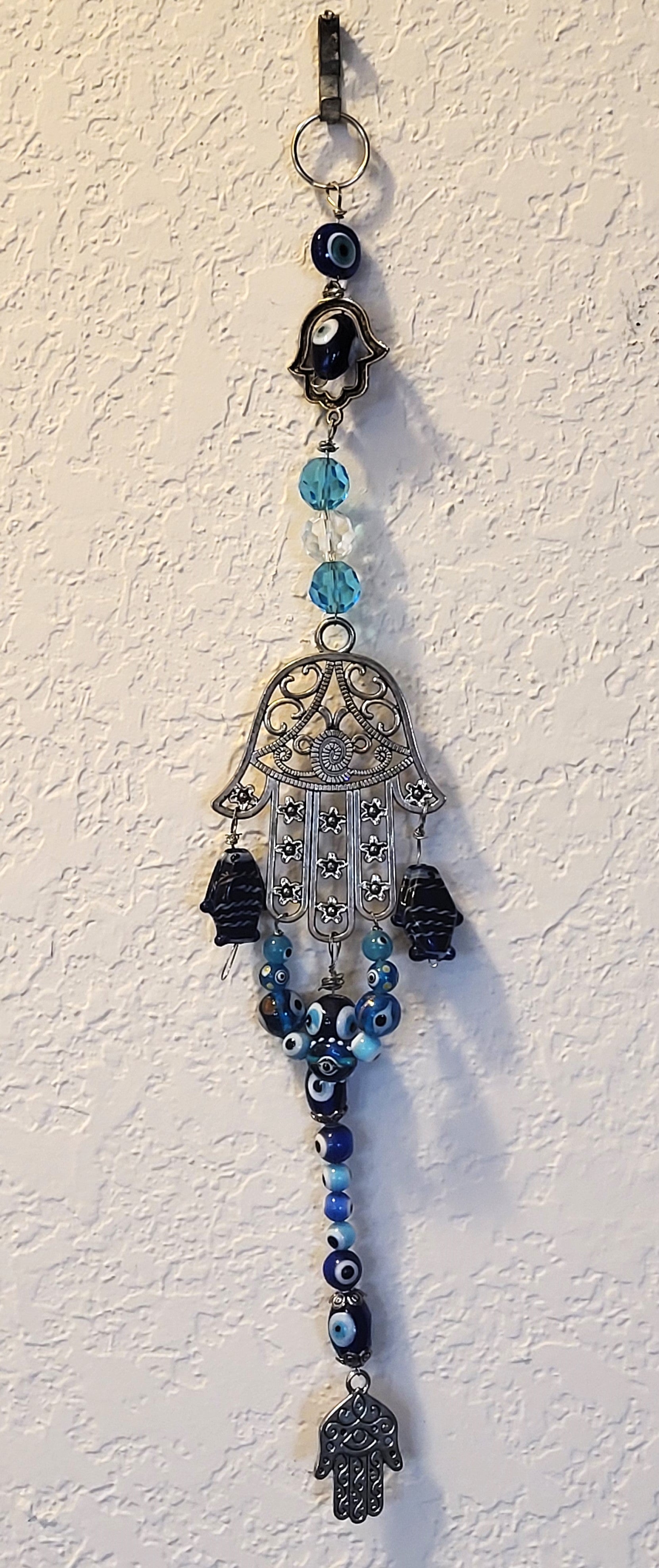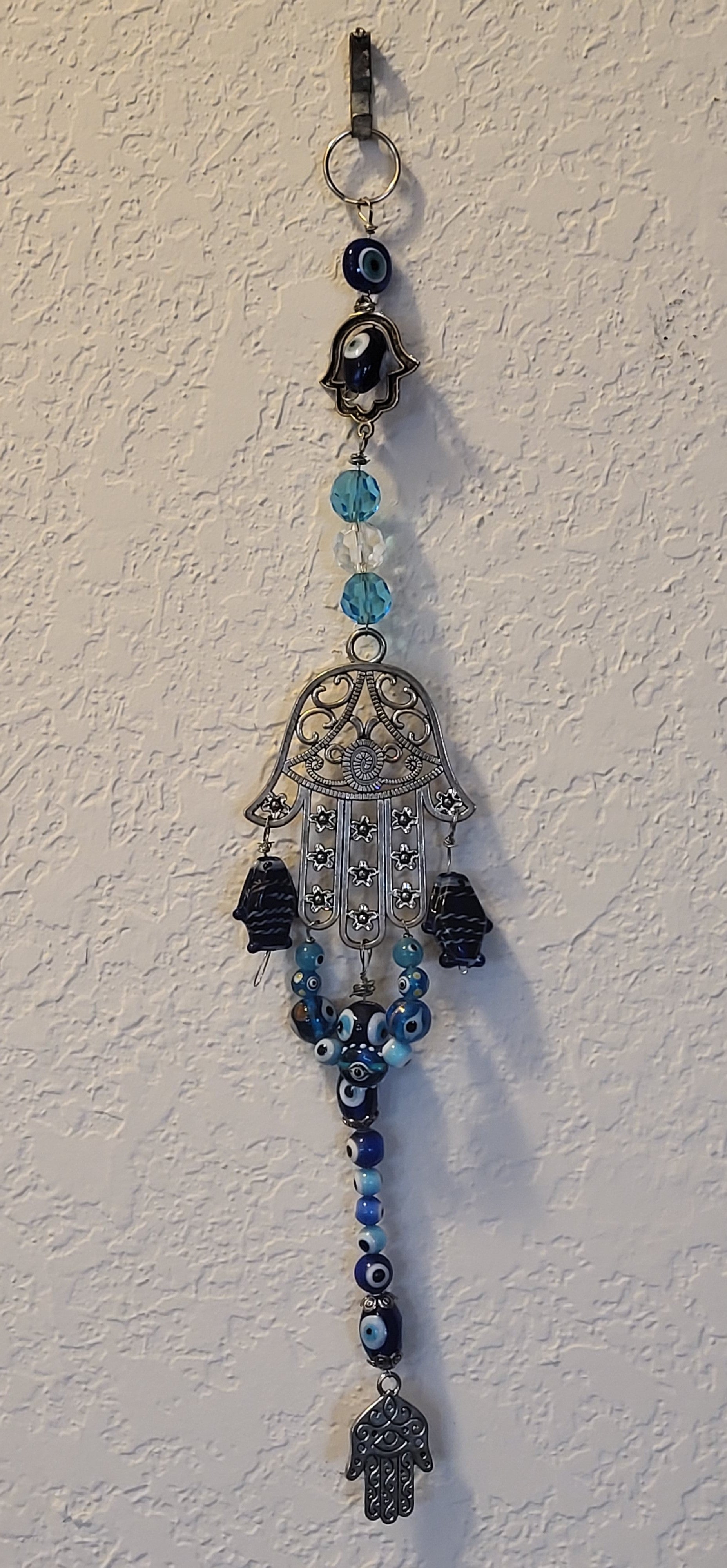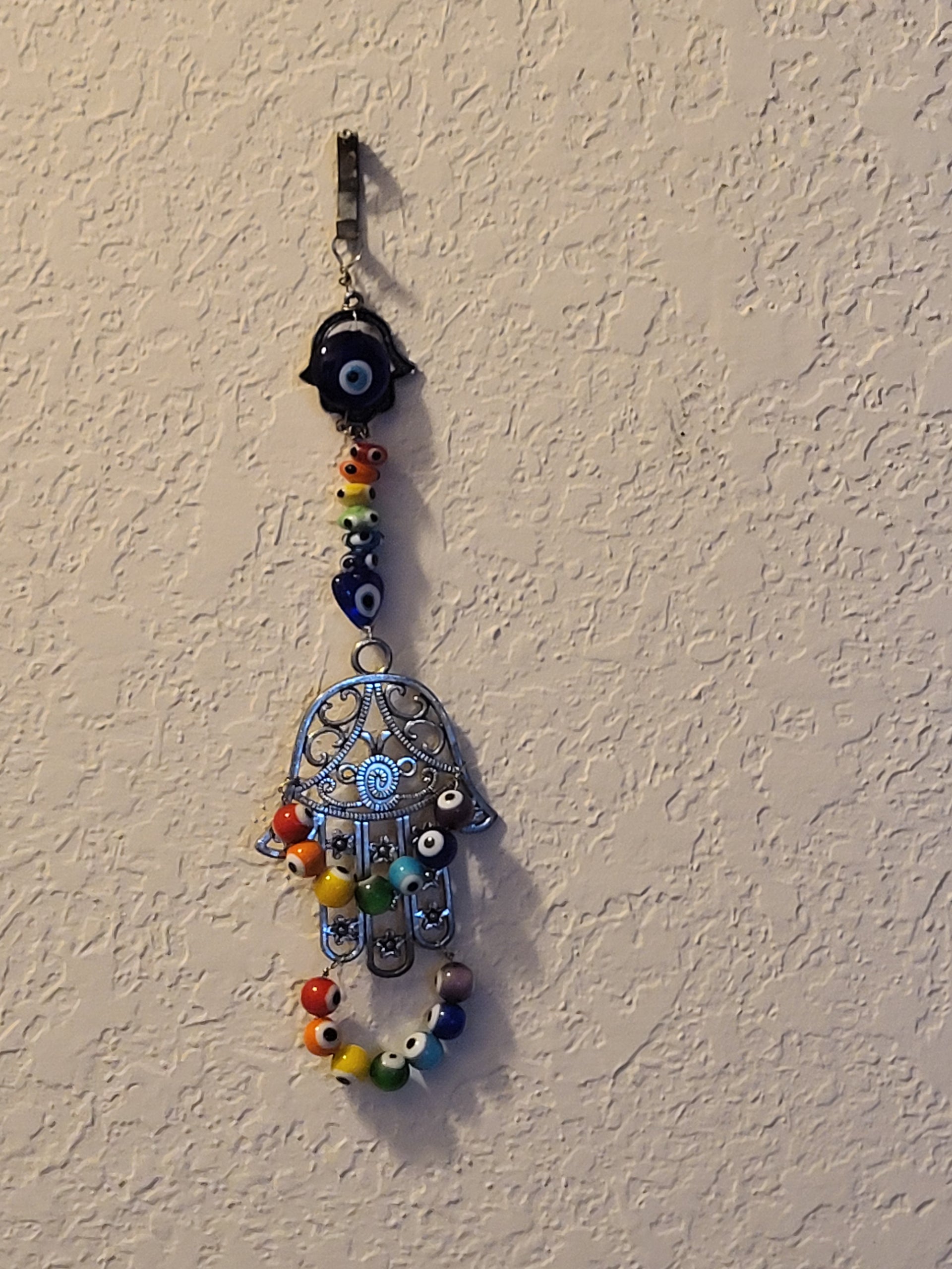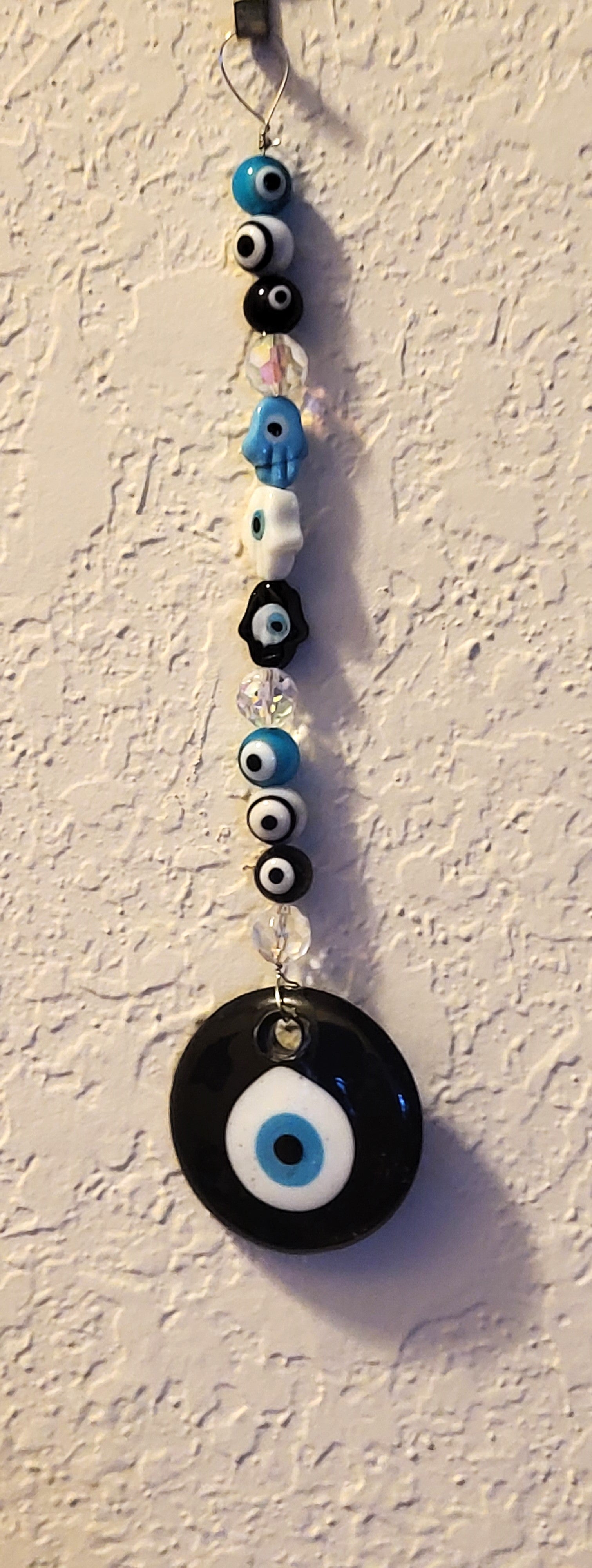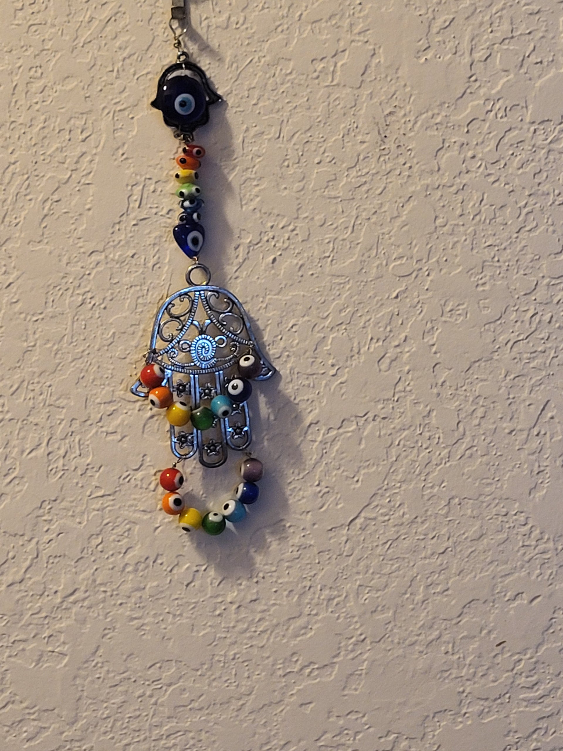 I have created a nice variety of Evil eye themed beaded wall hangings, with and without a Hamsa. According to legend evil eye symbols and amulets protects one from the evil eye.