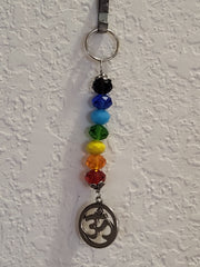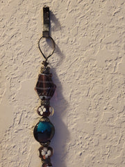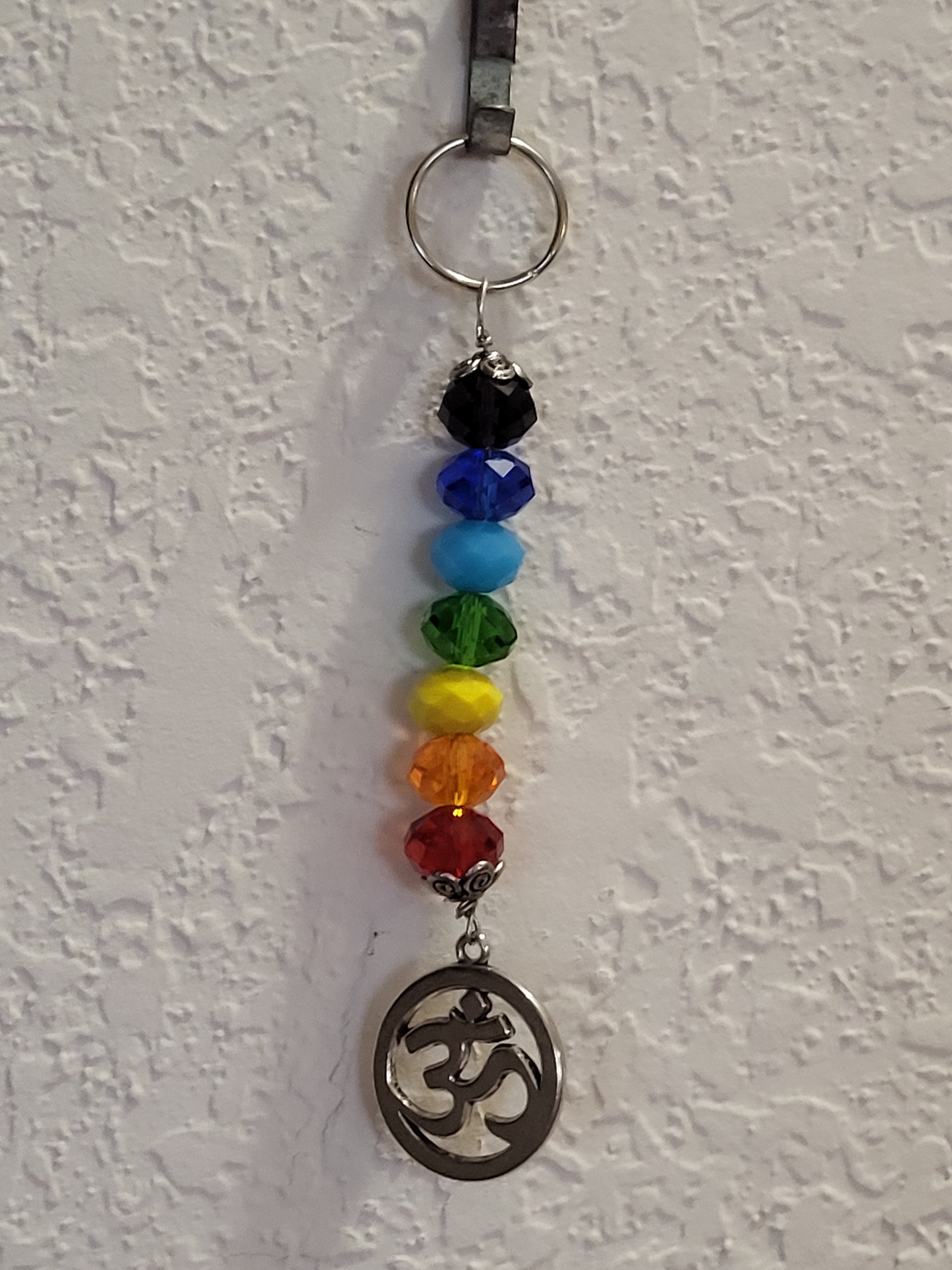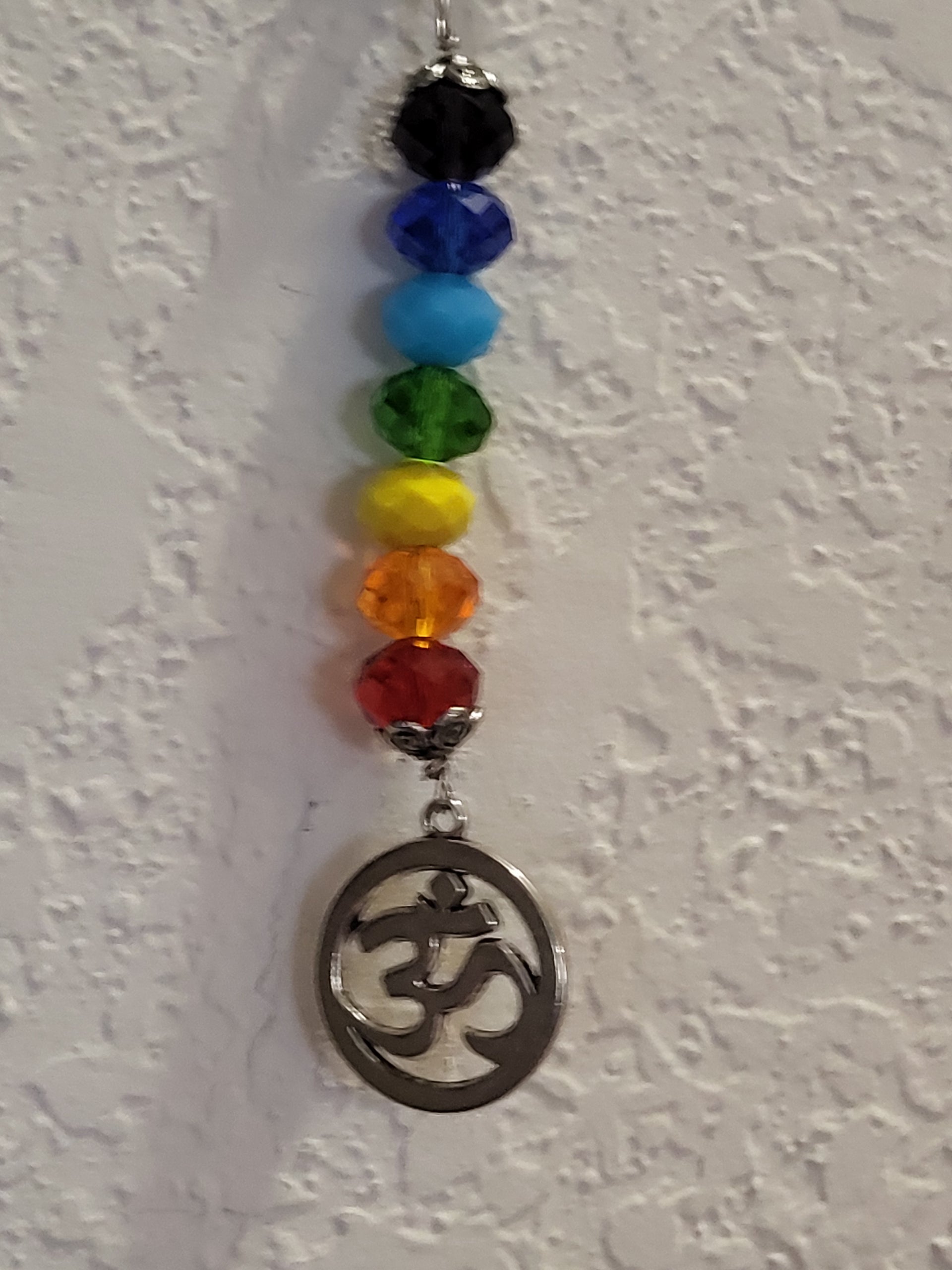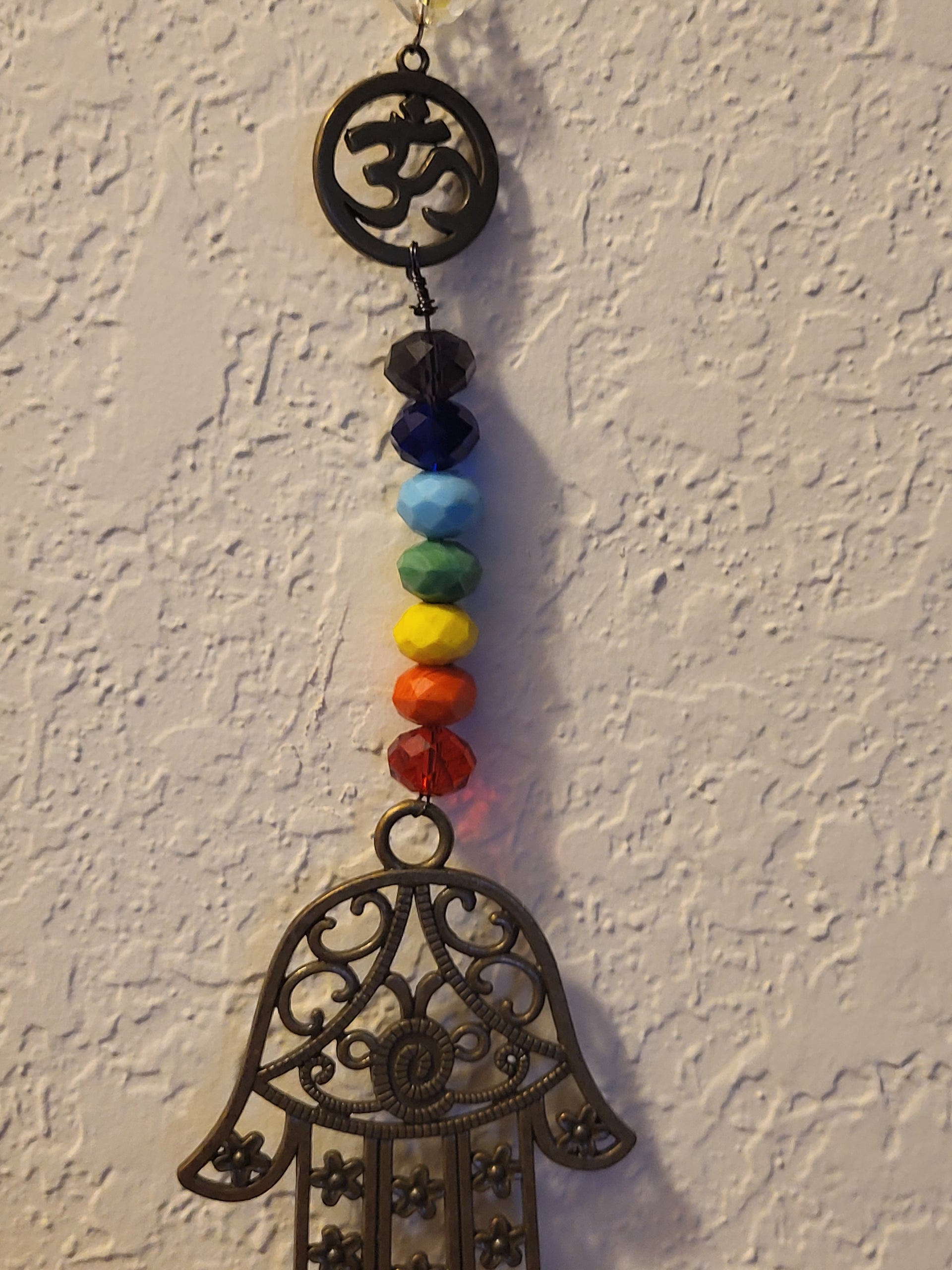 Chakra crystals Ohm amulet 5" long x 1" wide; Black evil eye purple fish amulet 8" long x 1.75" wide.