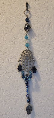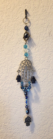 Left to right (as named in the cart): Triple evil eyes amulet 14" long x 2.5" wide; Evil eye hamsas beaded amulet 8" long x 1.5" wide; Fancy Hamsa fish evil eyes amulet 14" long x 2.5 wide; Double Chakra double hamsa amulet 9" long x 2.5" wide.