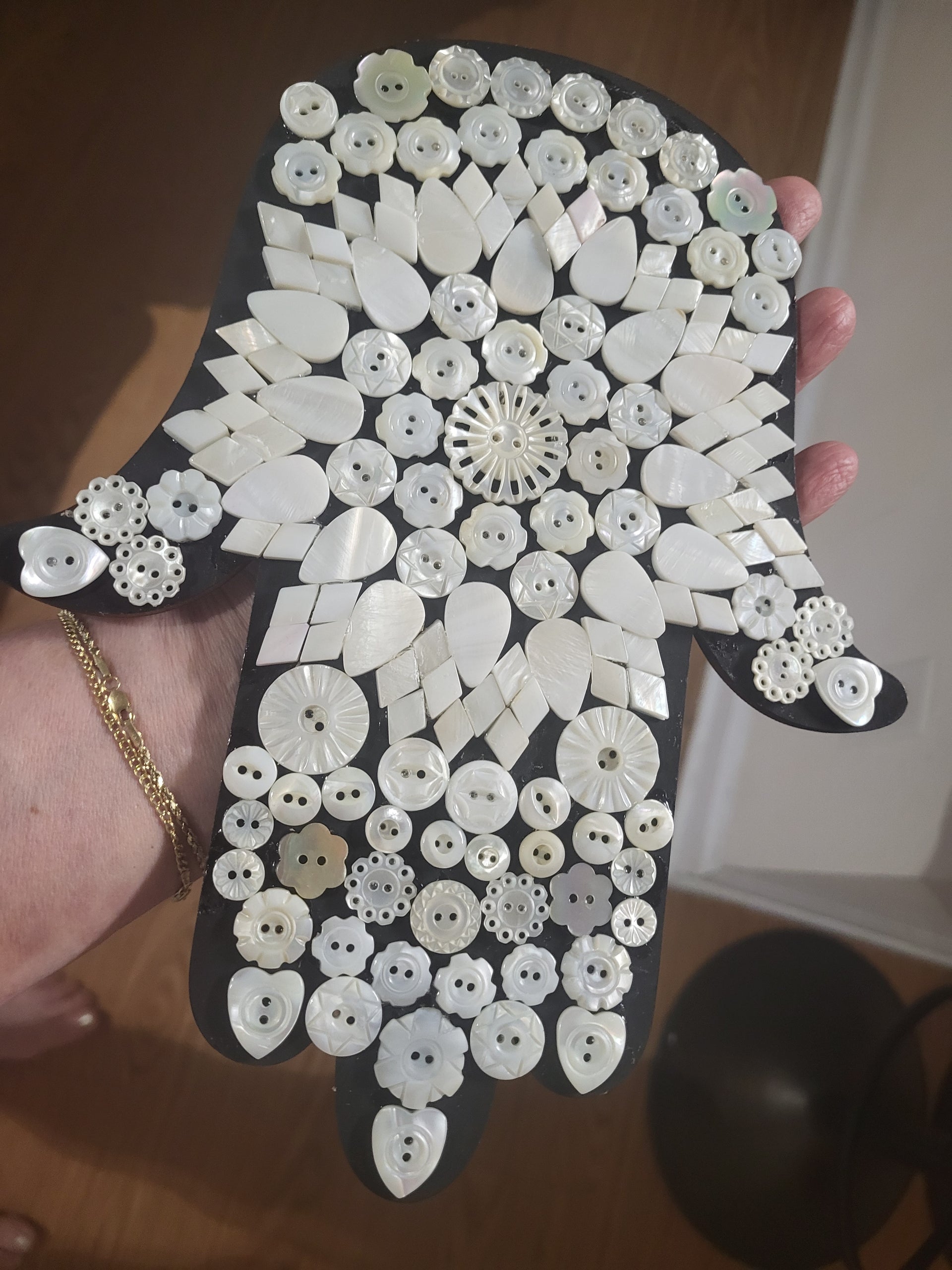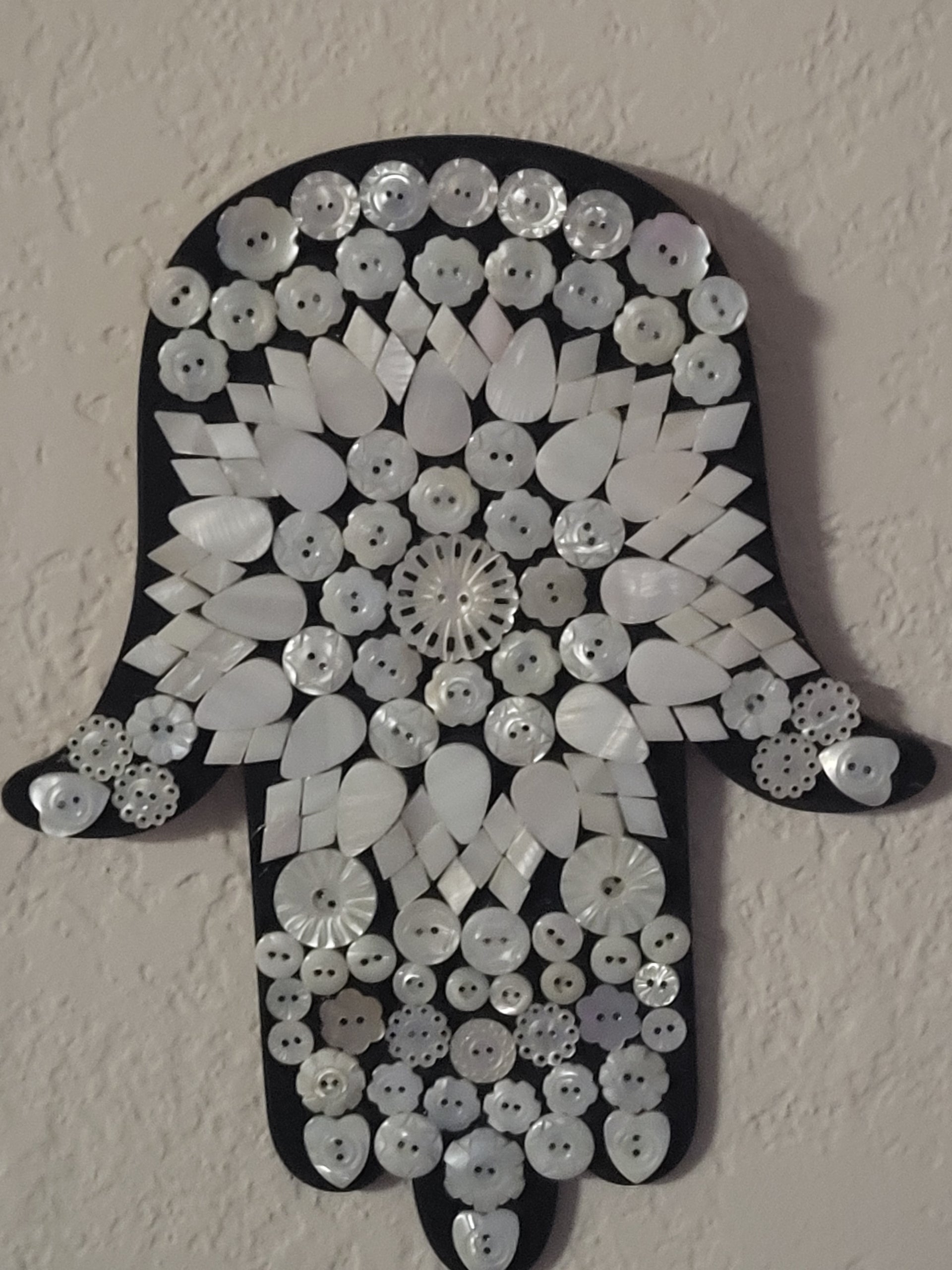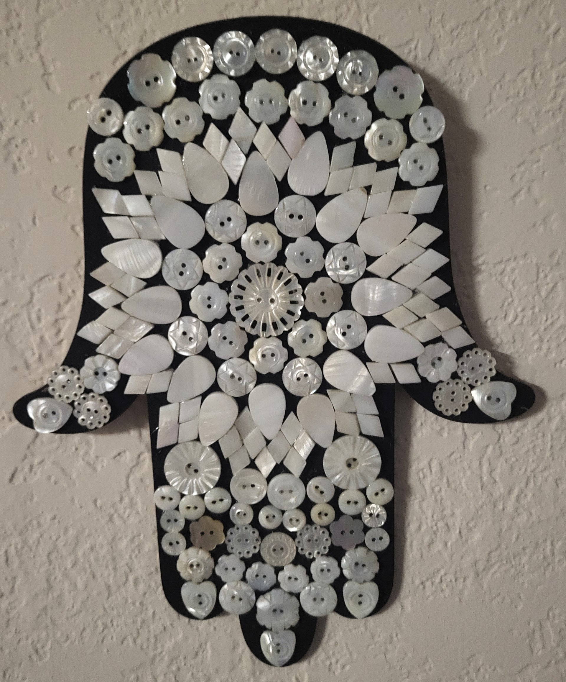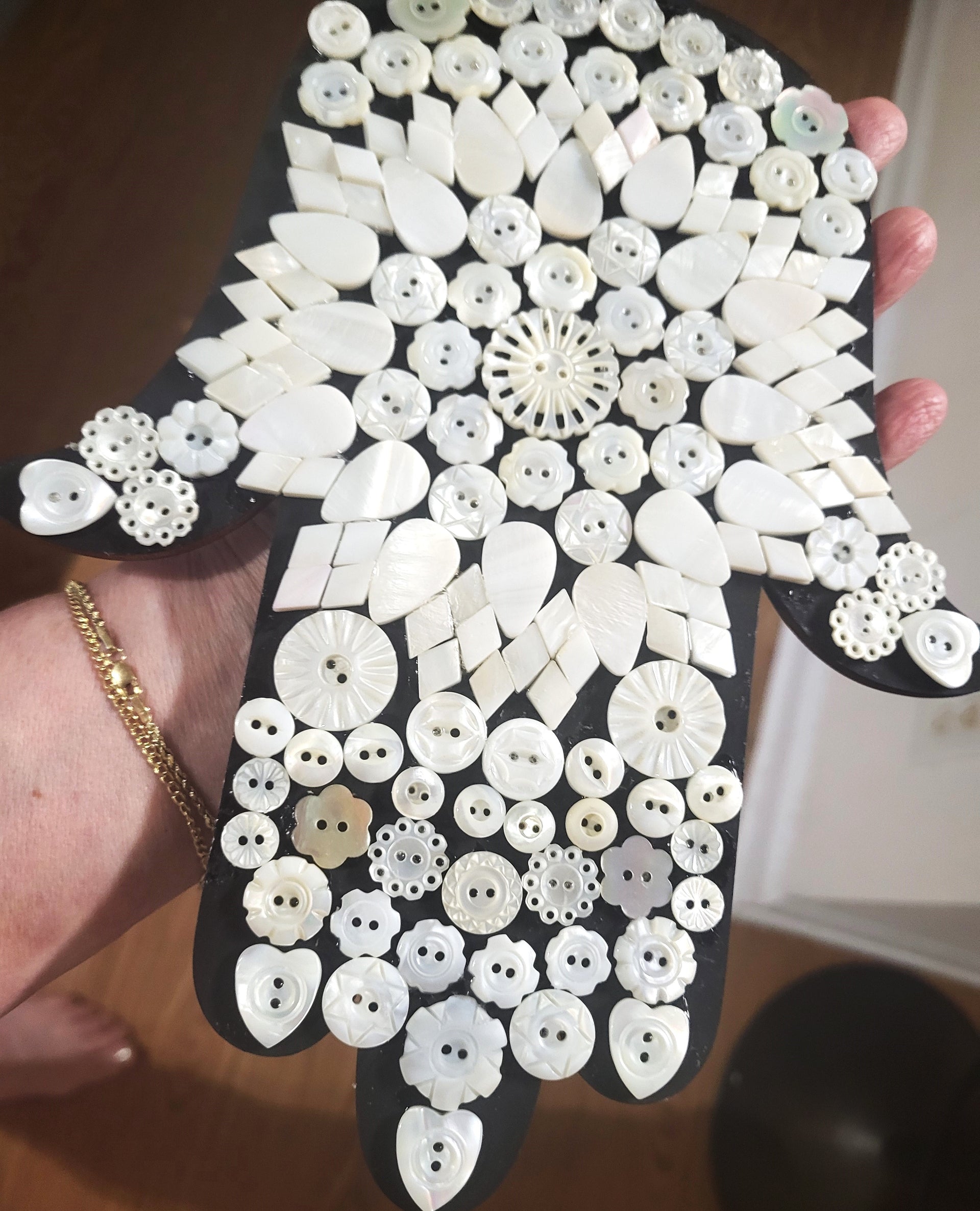 I used a wooden Hamsa blank, painted it in black and then added a variety of antique and vintage Mother of Pearl buttons. There are many Star of David MOP buttons.  I also used many beautiful shaped MOP beads and cocobon beads.