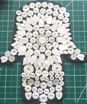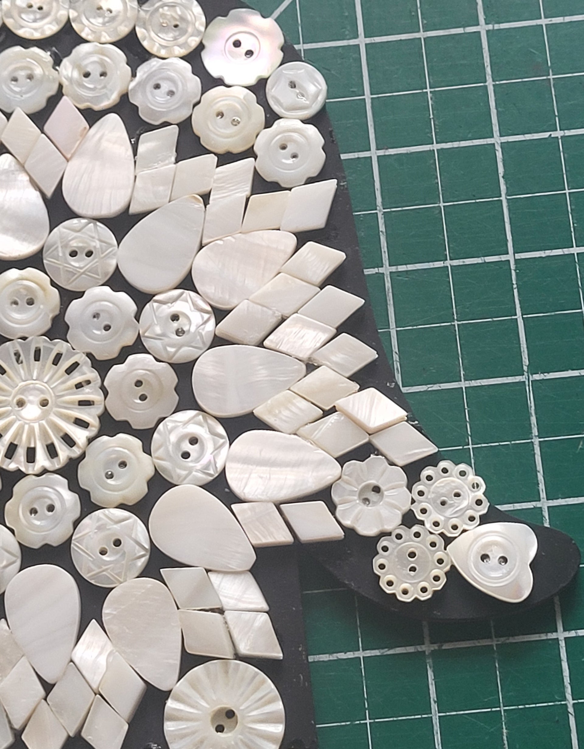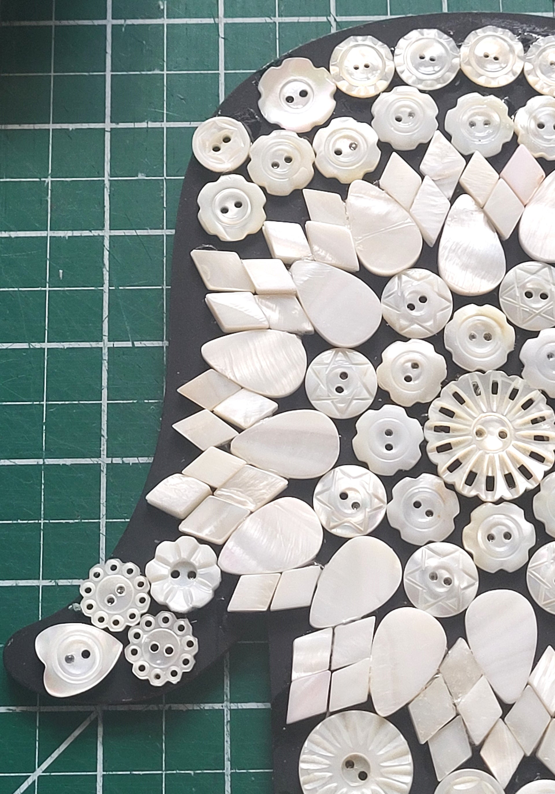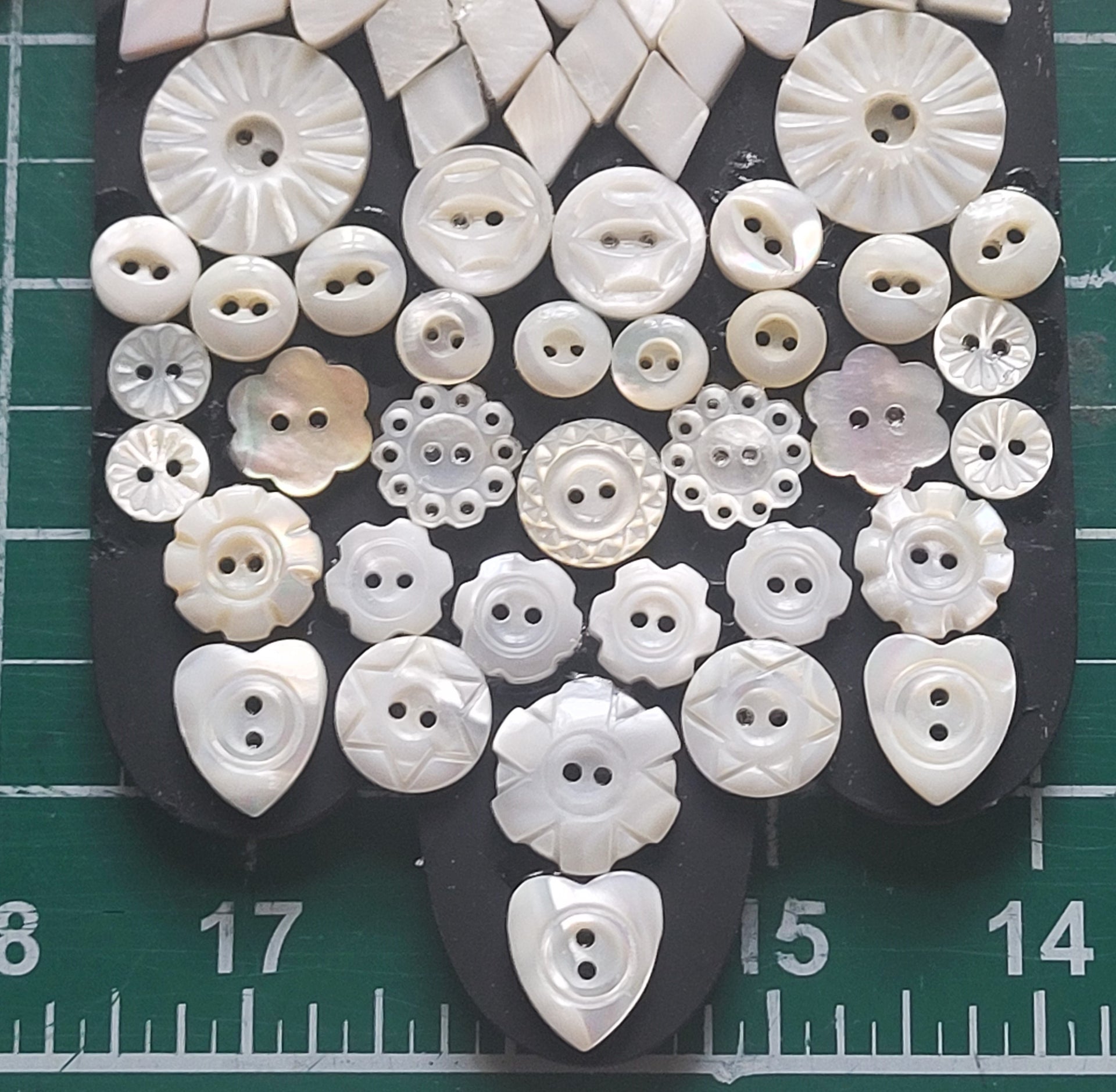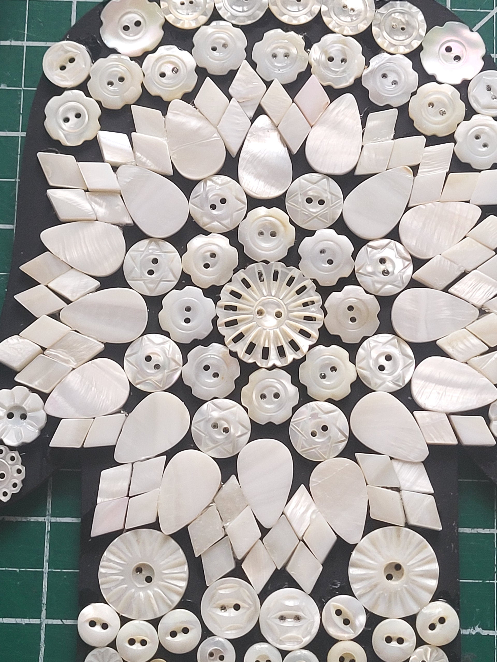 I used a wooden Hamsa blank, painted it in black and then added a variety of antique and vintage Mother of Pearl buttons. There are many Star of David MOP buttons.  I also used many beautiful shaped MOP beads and cocobon beads.