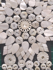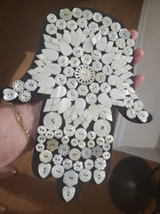 I have created this very detailed Mother of Pearl mosaic in the shape of a  Hamsa (Hand of Fatima, Hand of Miriam, Hand of G-d).  This is a wonderful amulet to hang in your home, giving you added protection per legend.