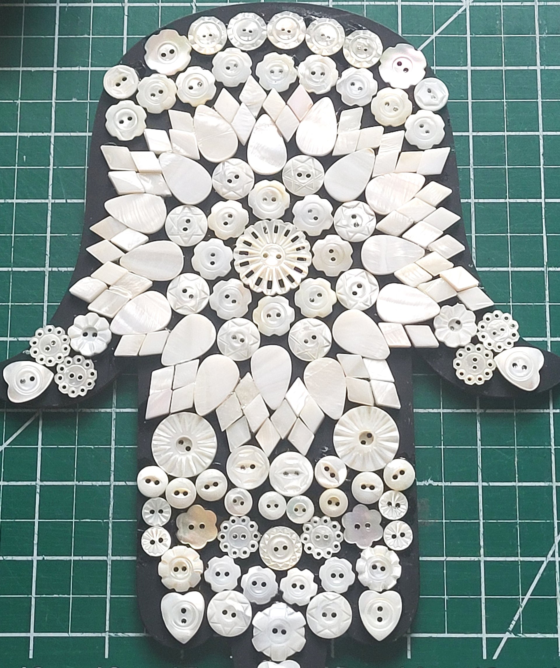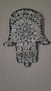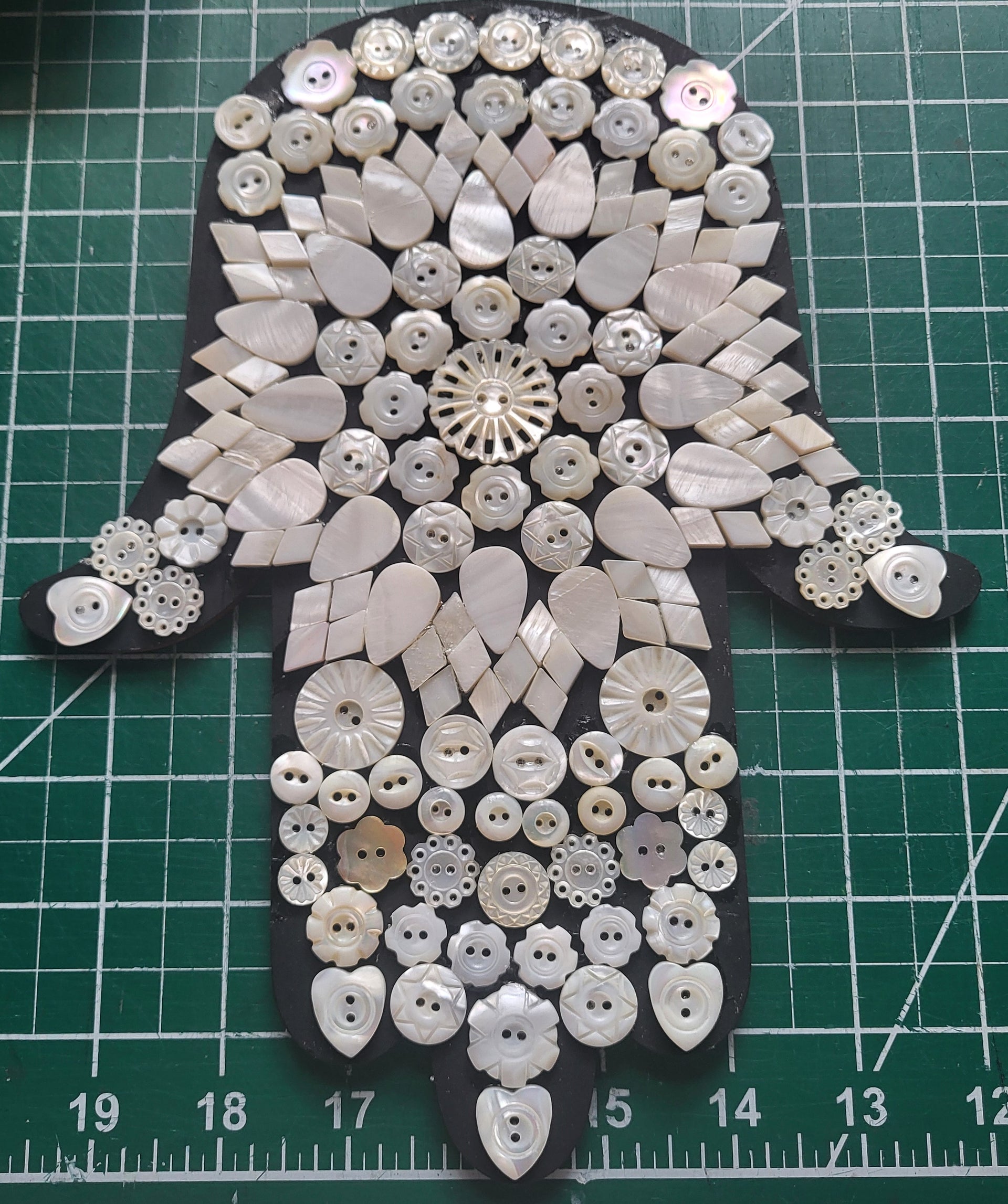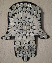 Mother of Pearl Hand of G-d Mosaic Wall art is a one of a kind piece designed and made by Kate Rachel Lozier