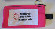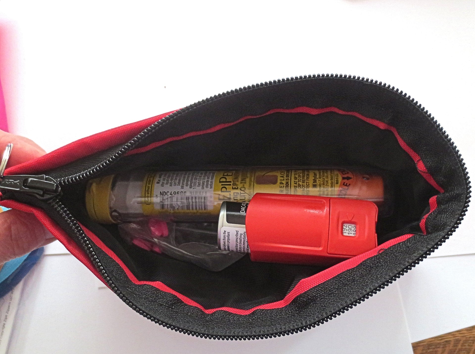 holds: your medical information; 2 epinephrine auto injectors (or one of each) plus a one dose Benadryl pack or small amount of benadryl pills or small benadryl bottle; an inhaler too!