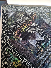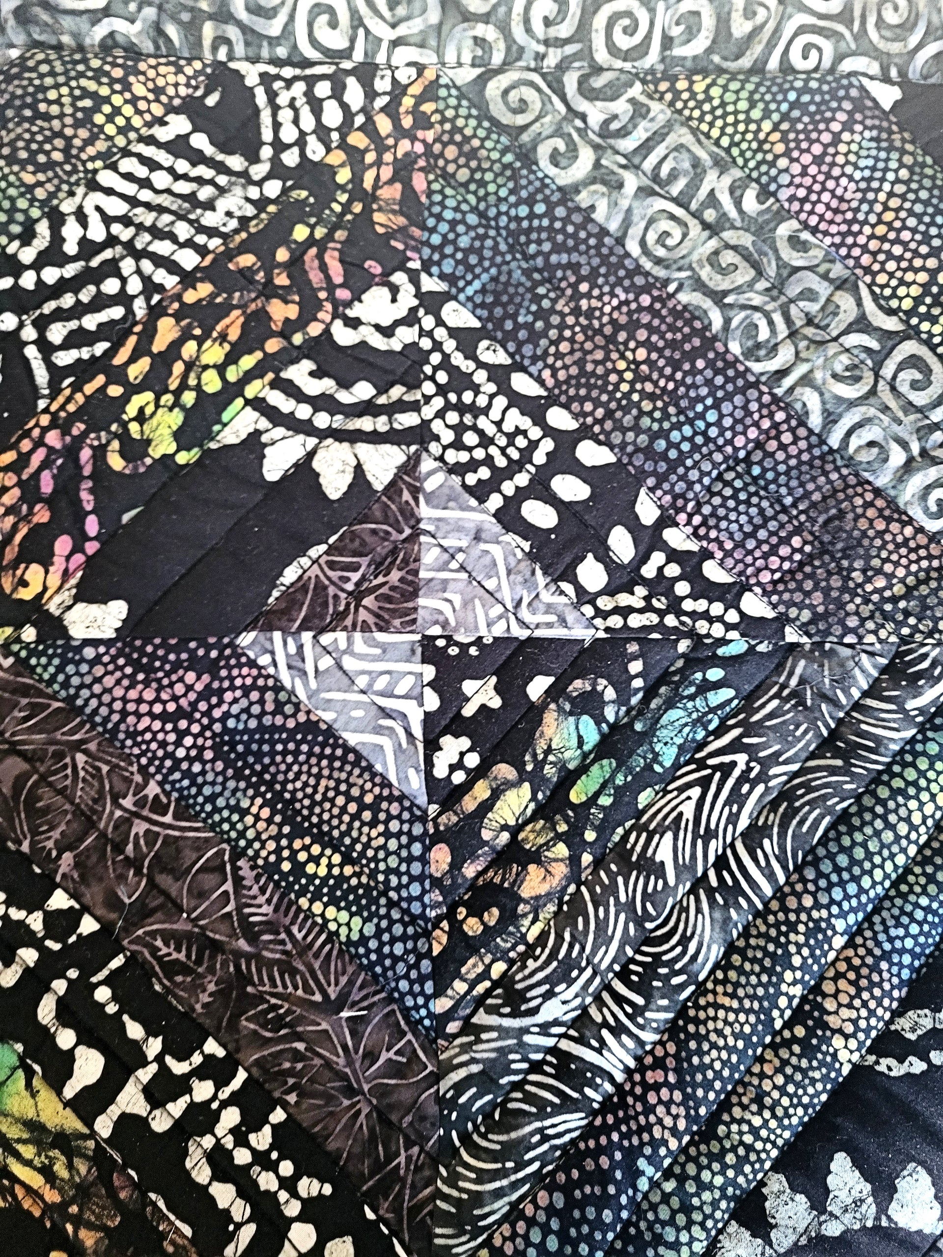 I used a strip quilting method to create these wonderful diamonds, triangles and squares patchwork designs of random beautifully black and multicolored batiks cotton fabric.