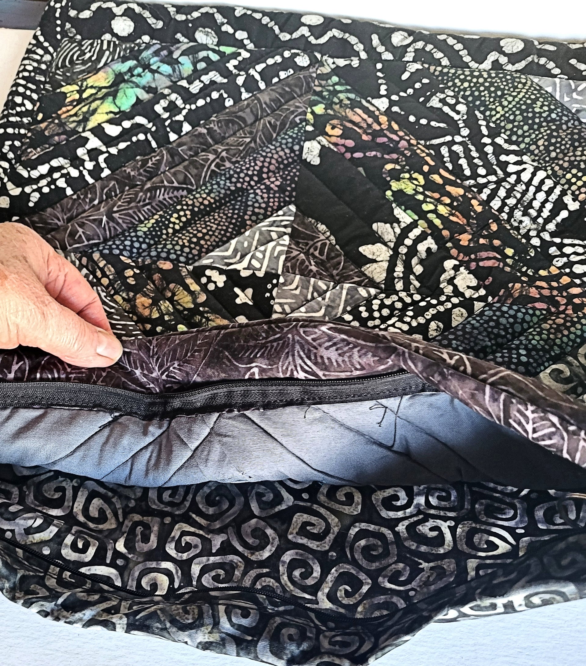 This quilted pillow cover is reversible since the zipper closure (with a flap to hid the zipper) is on the bottom. The back is a gorgeous black and gray swirly squares batik cotton fabric.    All seams including the zipper seams were double stitched and zig zagged for durability.   I quilted this beautiful and unusual pillow cover with cotton quilting black thread.