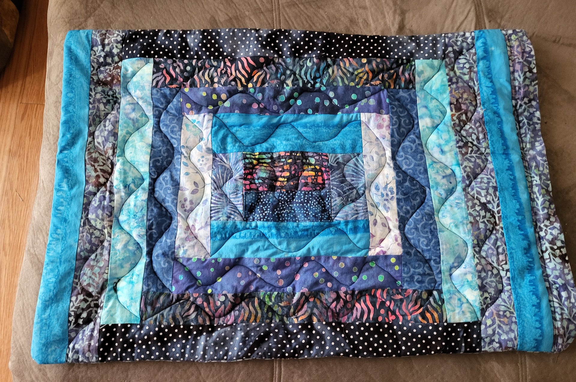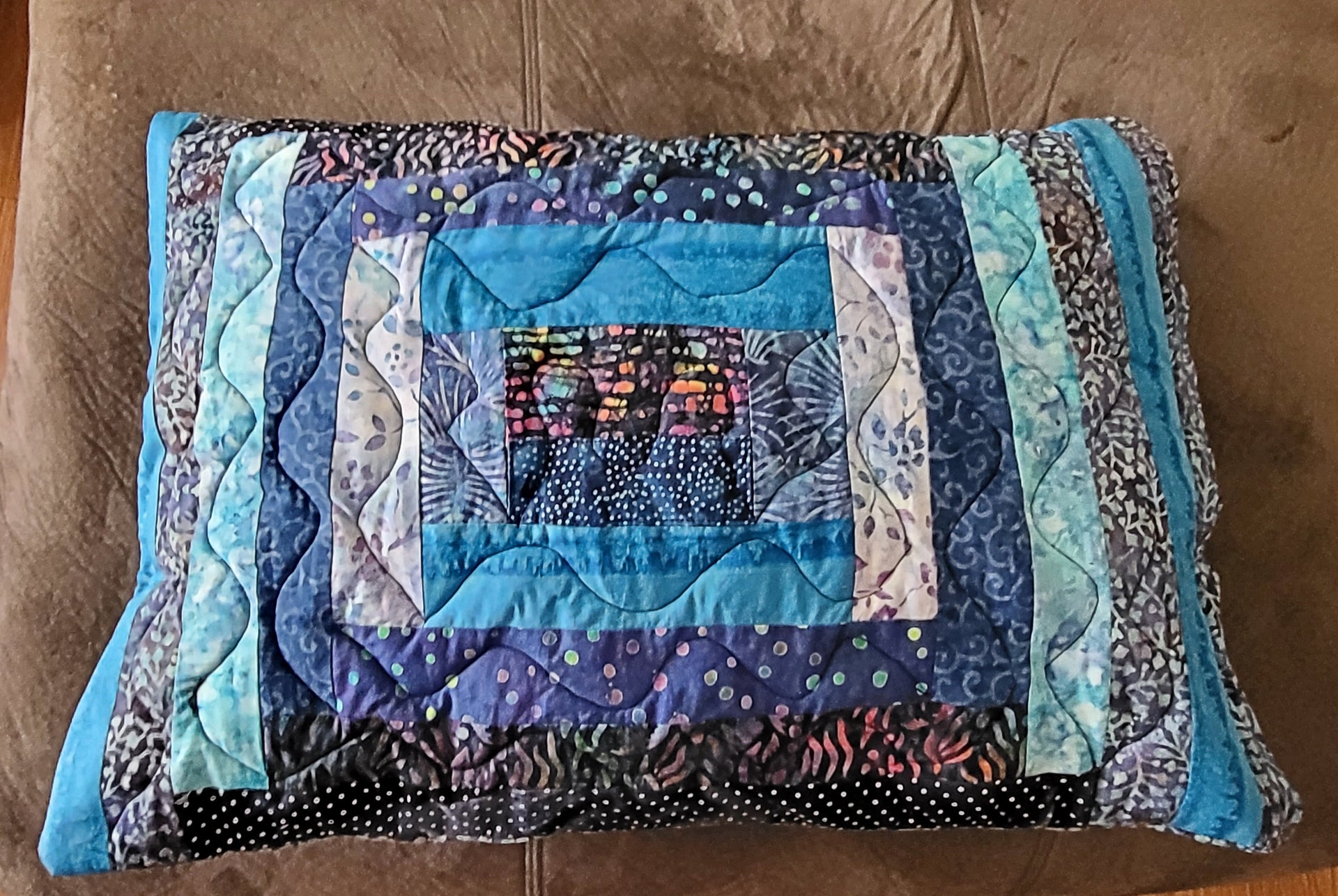 I used a strip quilting method to create these this pretty log cabin style extra large pillow cover.  I used so many beautiful batik fabrics!   This pillow cover reverses to a beautiful medium blue viney batik.