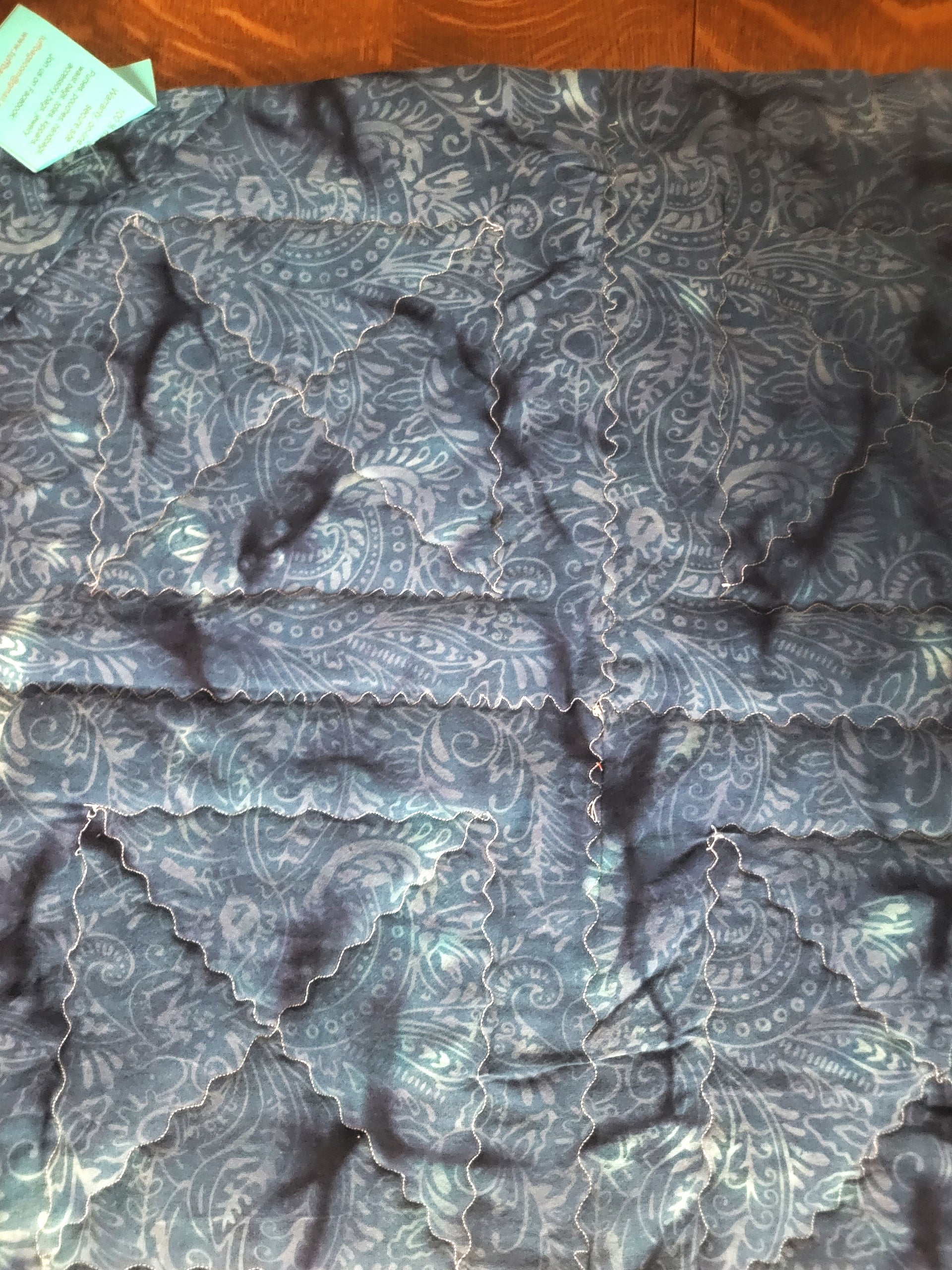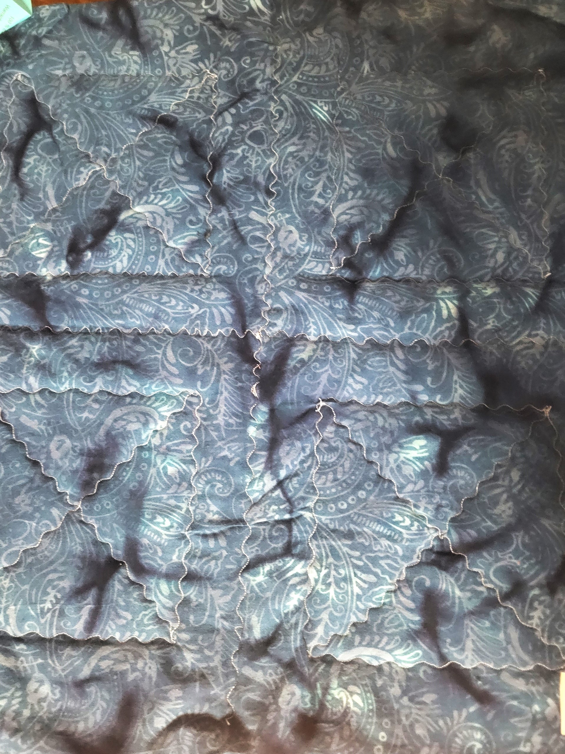 I used a polyester batting and navy blue lining when I quilted this wall hanging. I hand stitched the surrounding edges. The back is the same as the edging, a beautiful multi blue batik with a touch of purple. I have two generous corners for inserting a dowel for hanging (dowel not included).