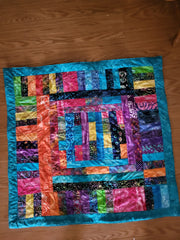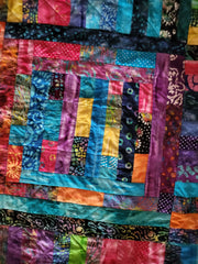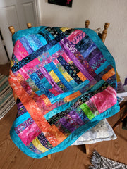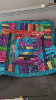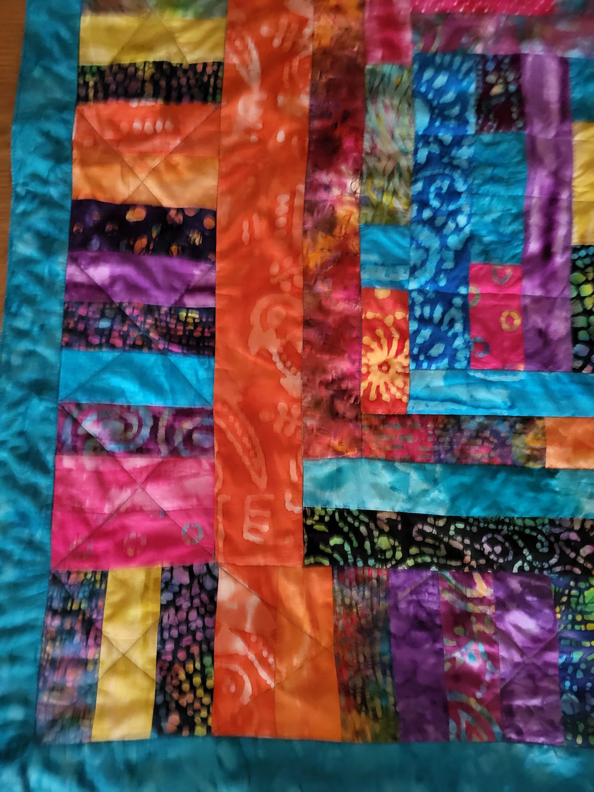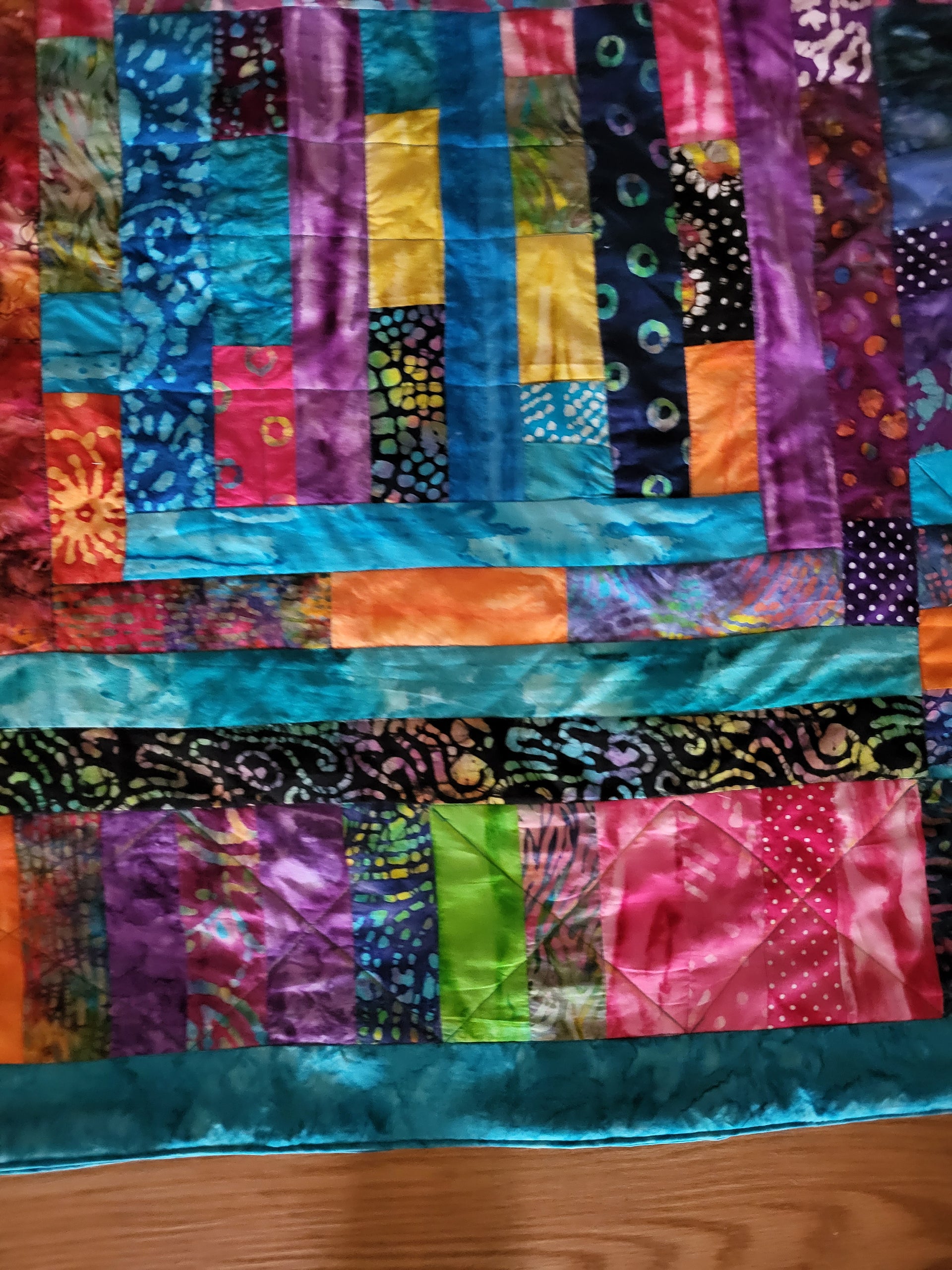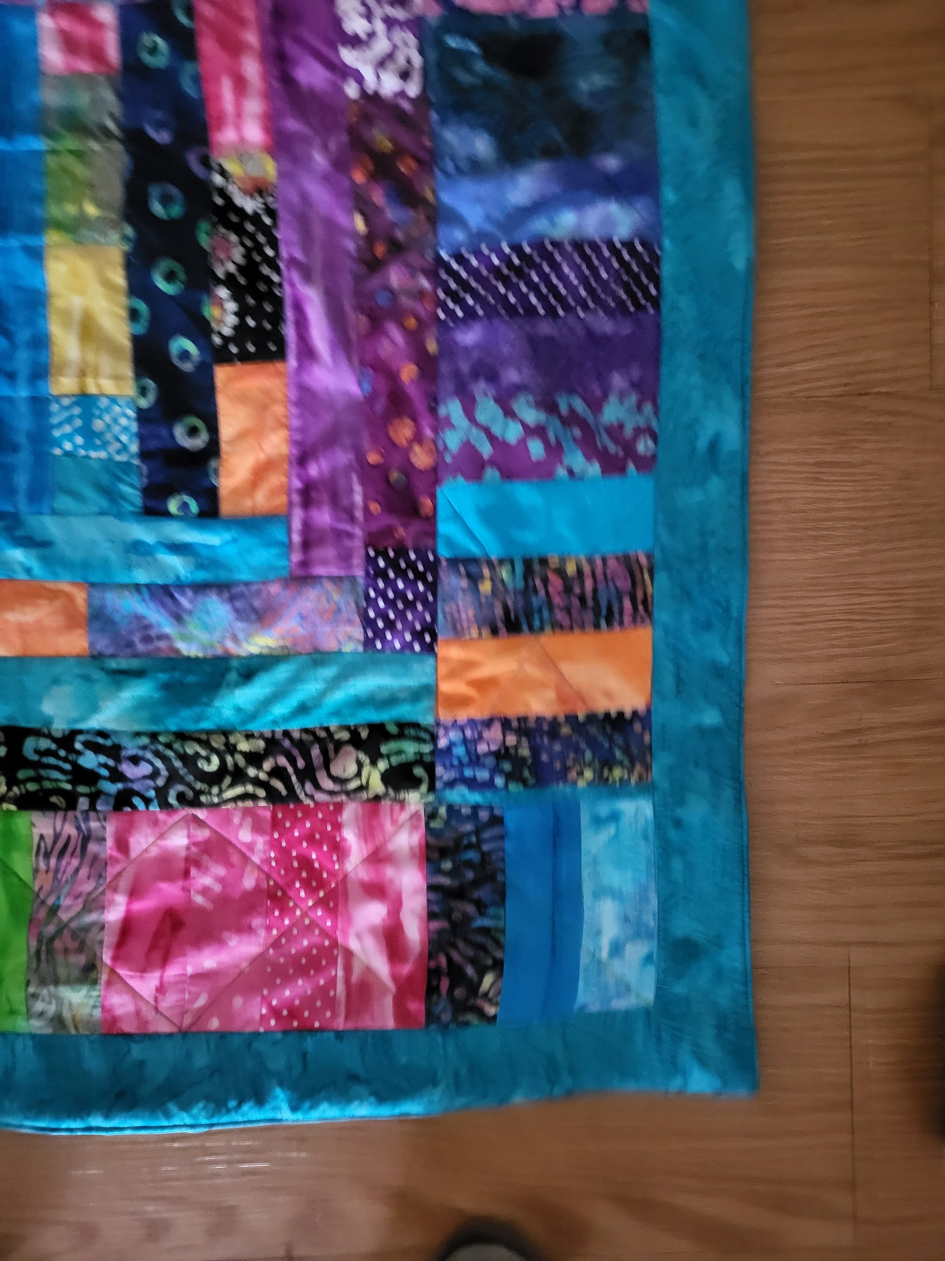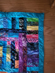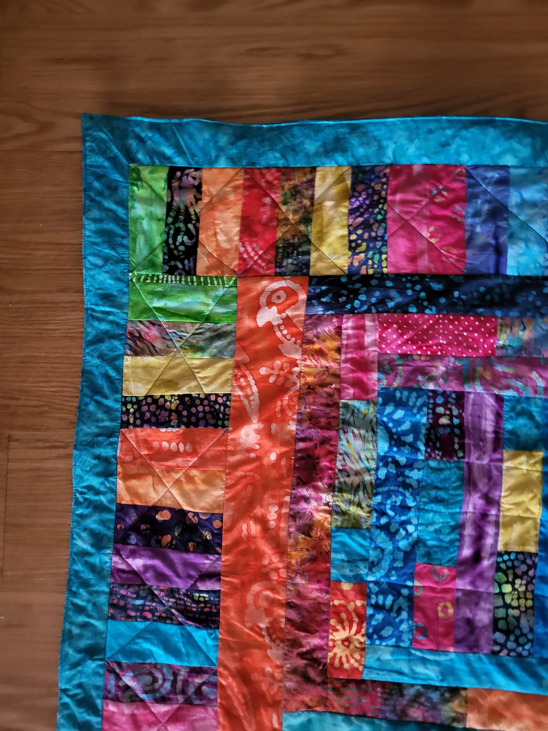 I used a many different colorful with these gorgeous batik variety of many different colors and patterns of hand-dyed cotton batik fabrics. These stunning batik fabrics are beautiful and vibrant.  The reverse side of the quilt is a turquoise batik.  I used Warm and Natural batting which will keep the user warm and comfy.     All seams were double stitched and zig zagged for durability.