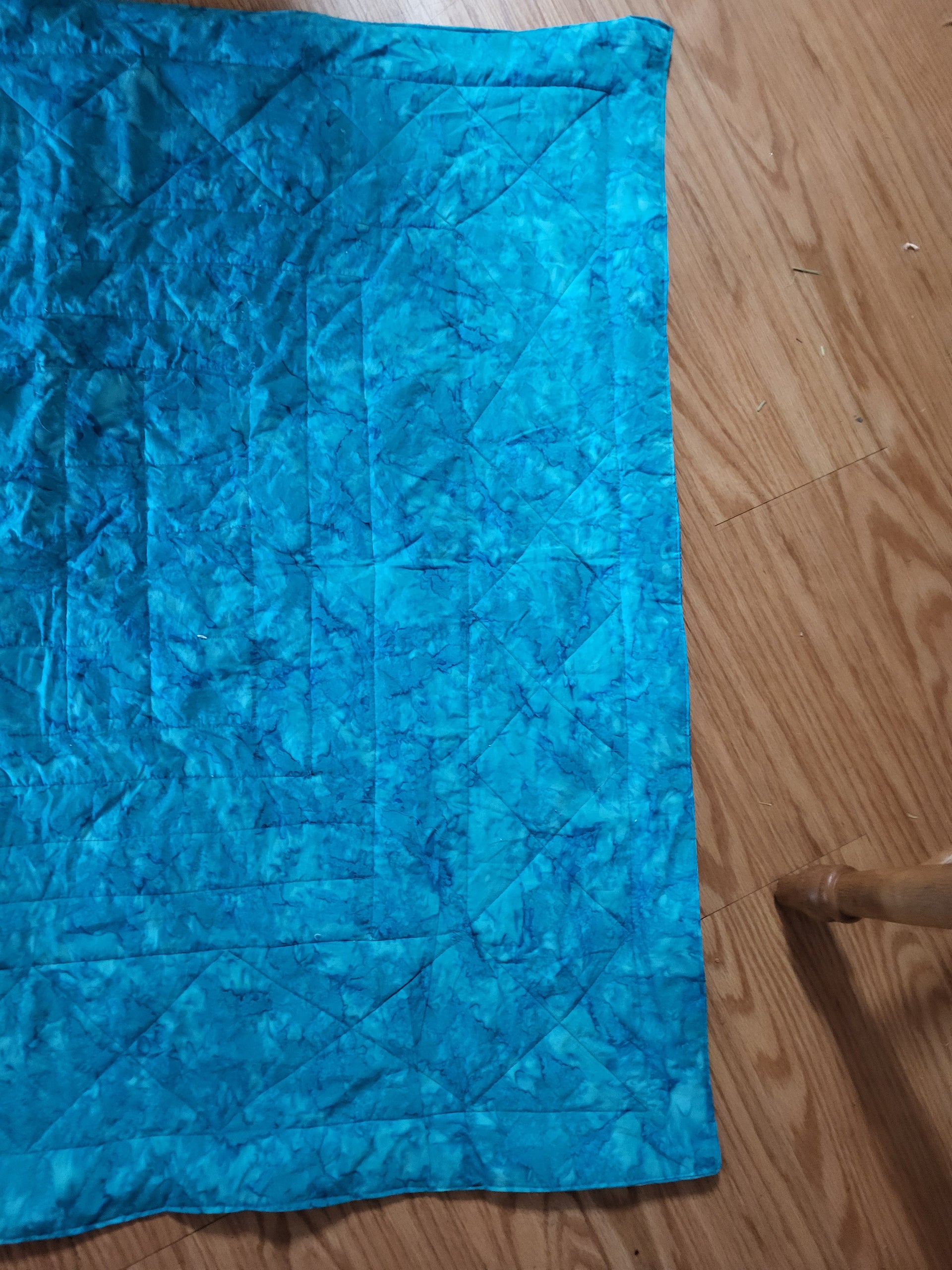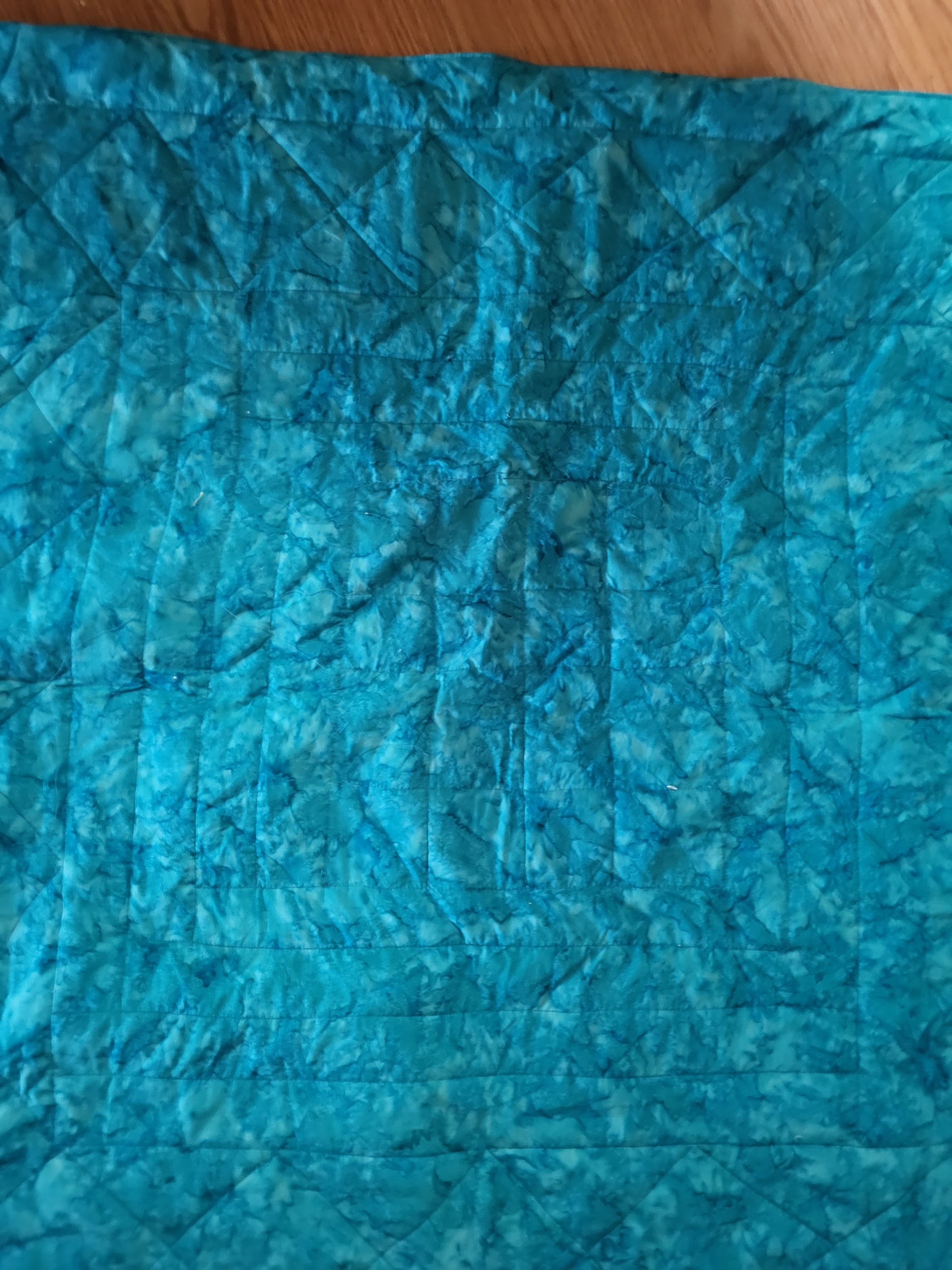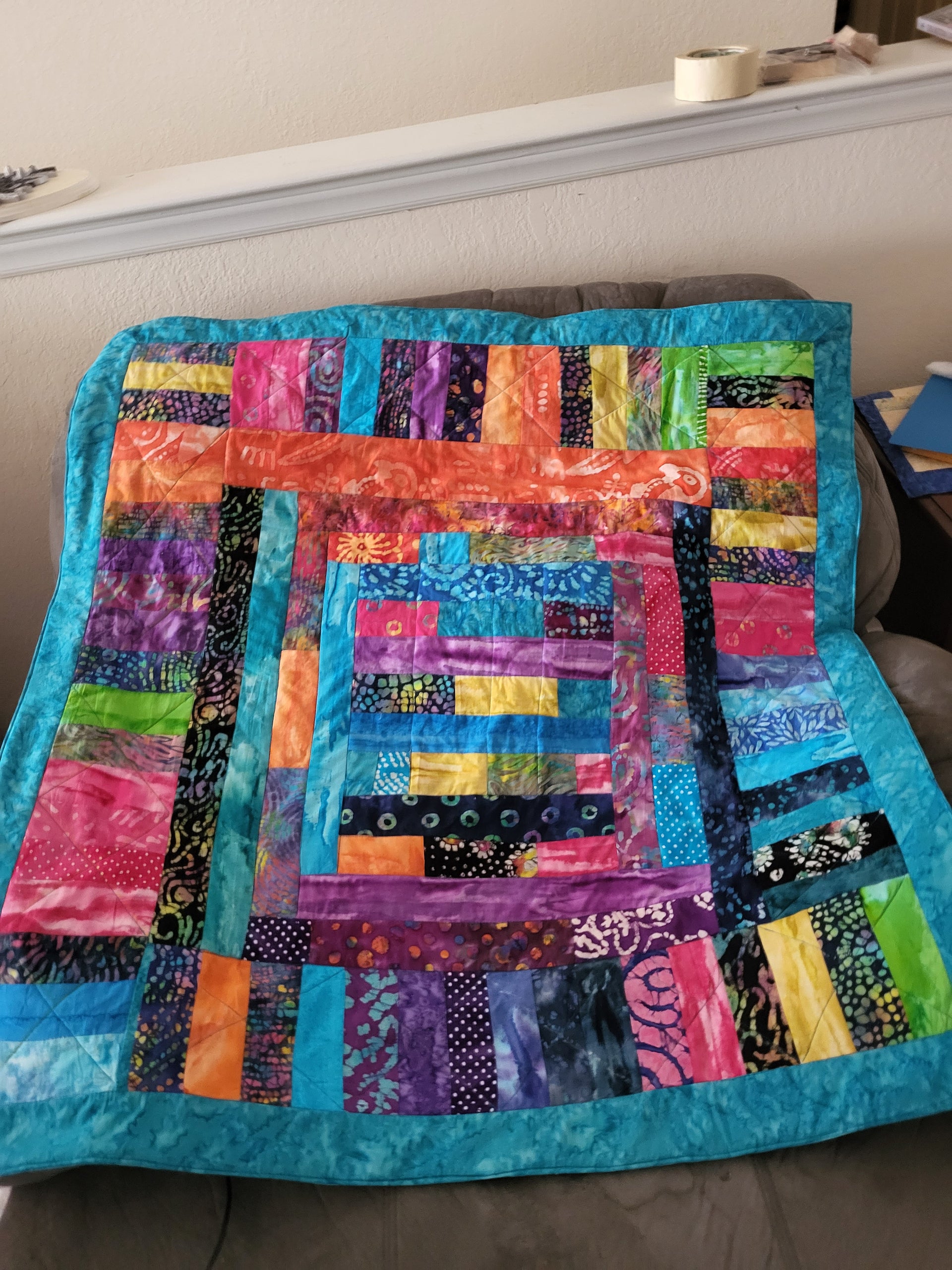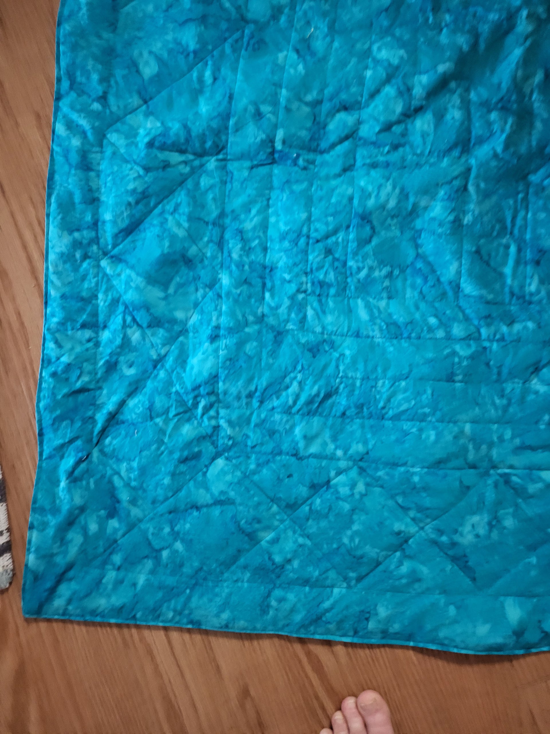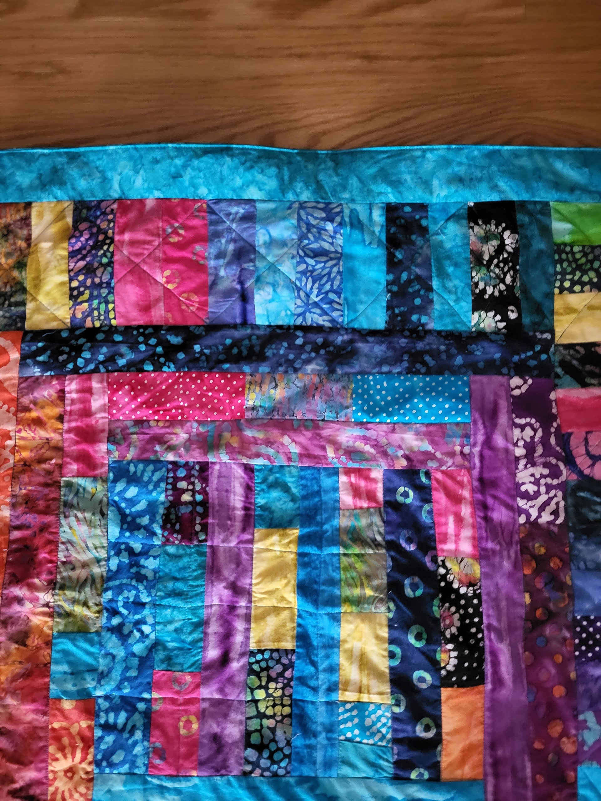 I used a many different colorful with these gorgeous batik variety of many different colors and patterns of hand-dyed cotton batik fabrics. These stunning batik fabrics are beautiful and vibrant.  The reverse side of the quilt is a turquoise batik.  I used Warm and Natural batting which will keep the user warm and comfy.     All seams were double stitched and zig zagged for durability.