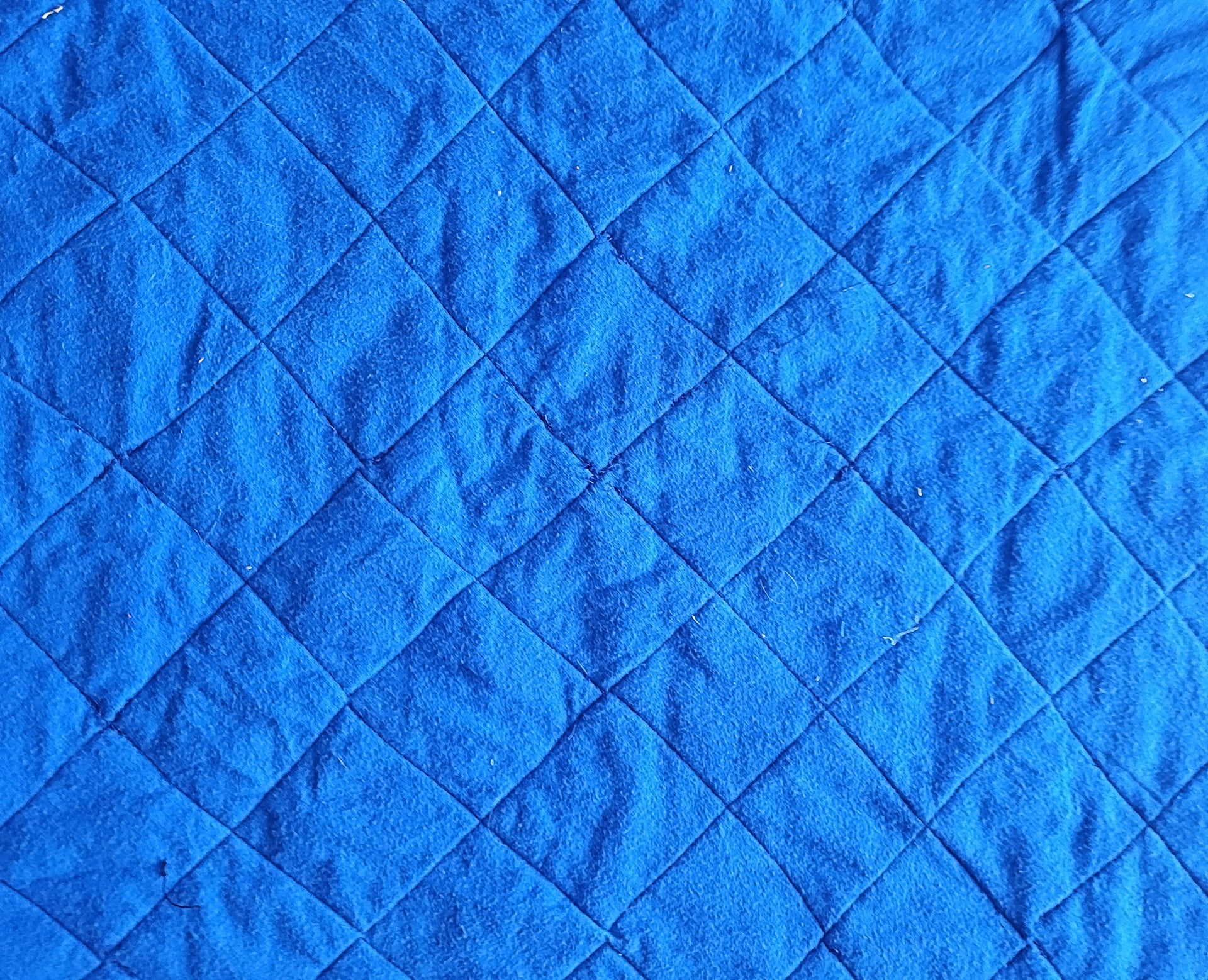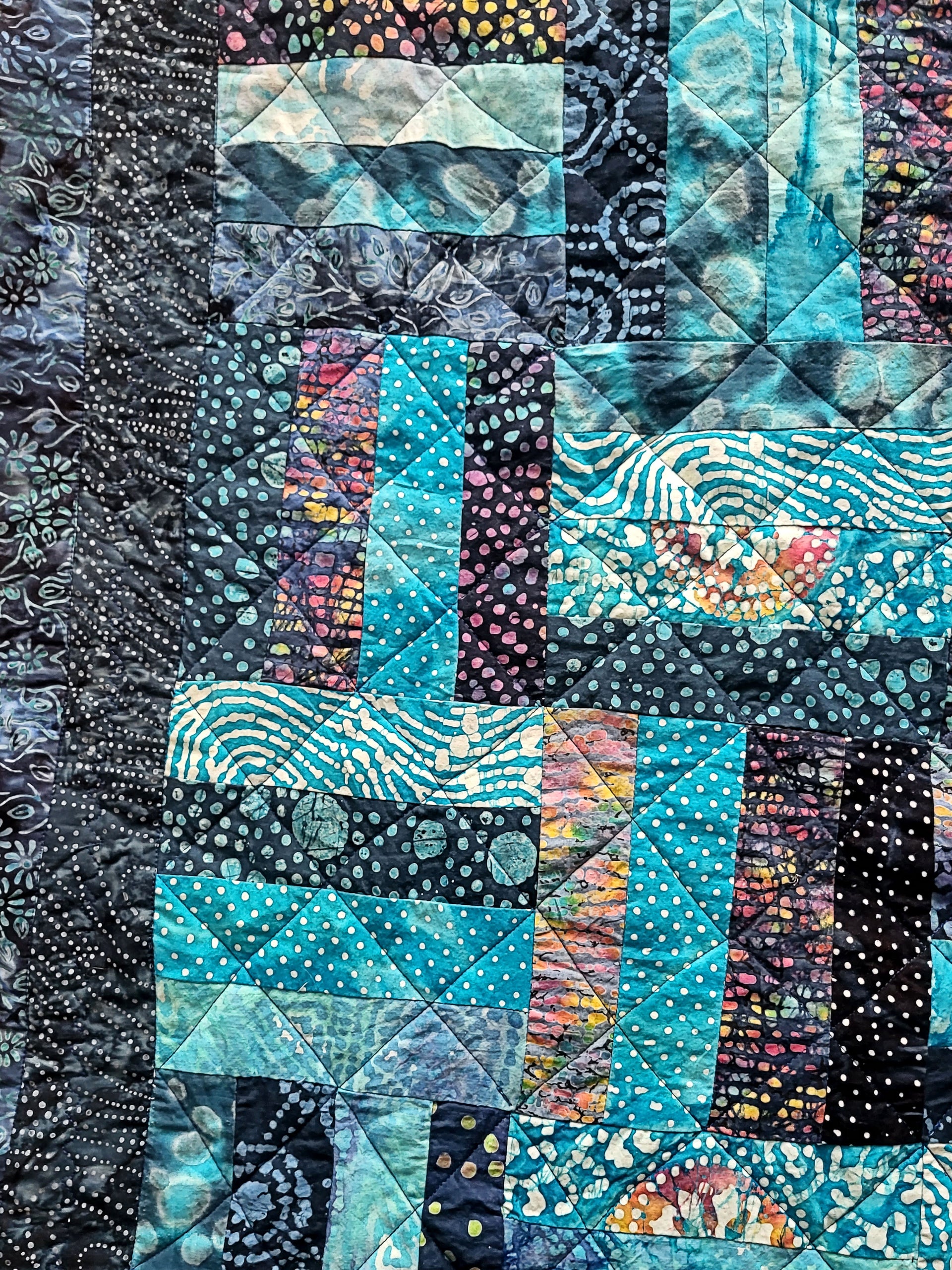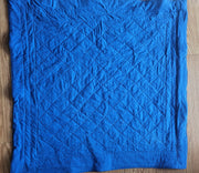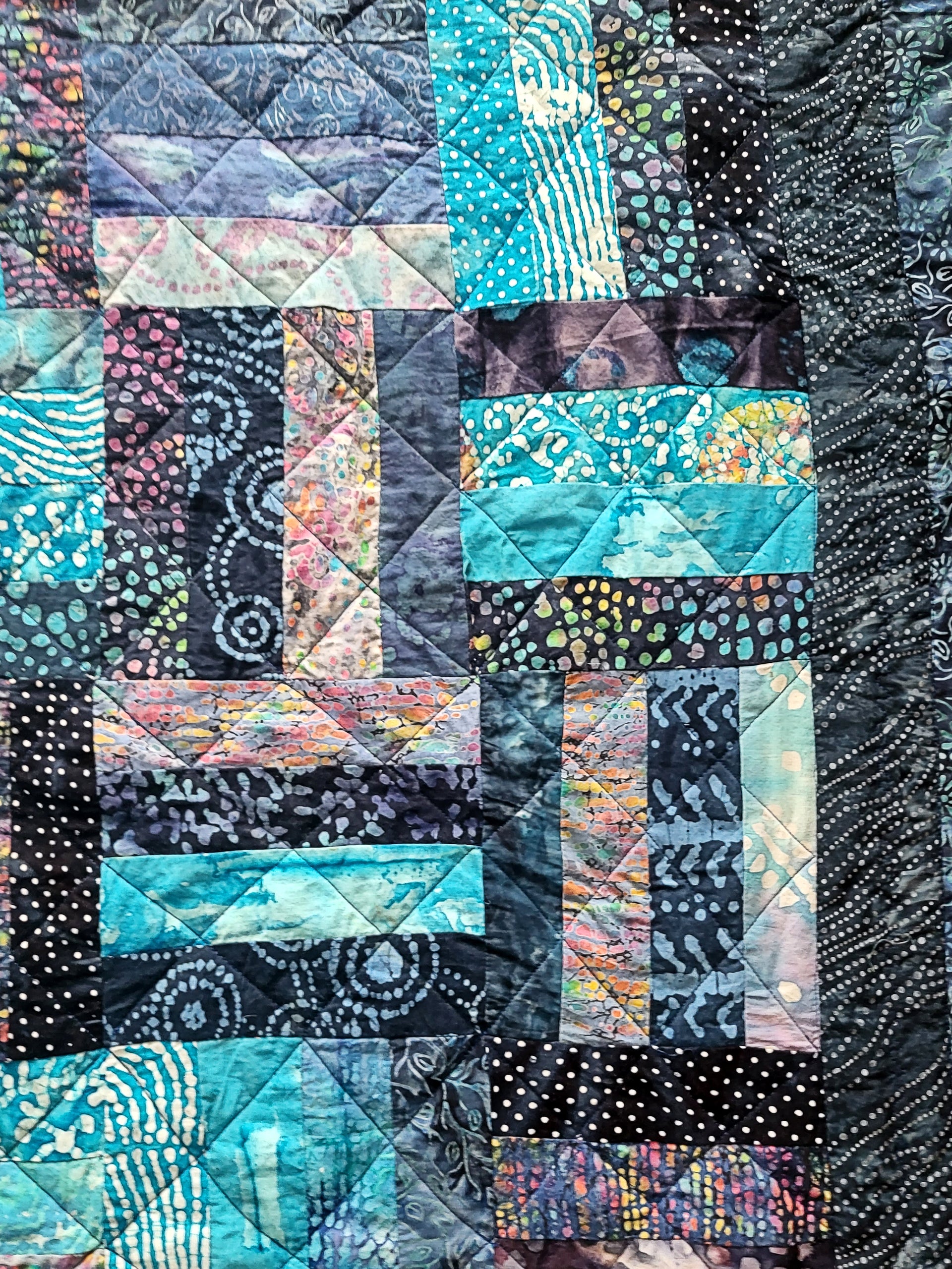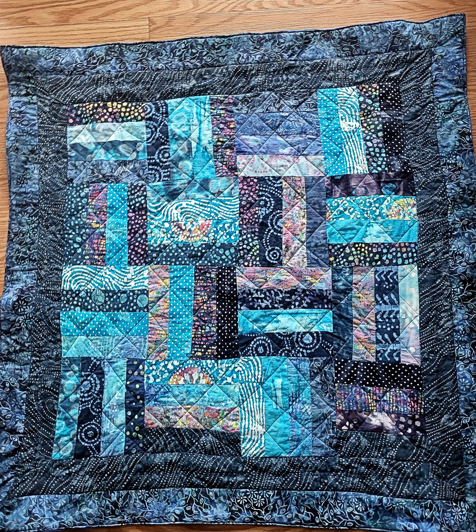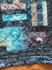 I used a many different colorful with these gorgeous batik variety of blue fabrics in this "Sign of the Times" quilting pattern. These stunning batik fabrics are beautiful and vibrant.  The reverse side of the quilt is a royal blue all cotton flannel.  I used Warm and Natural batting which will keep the user warm and comfy.