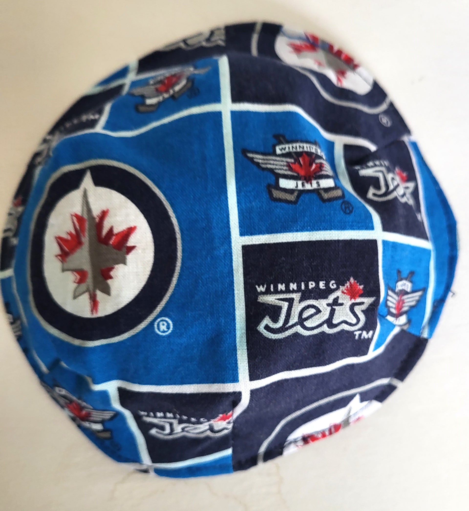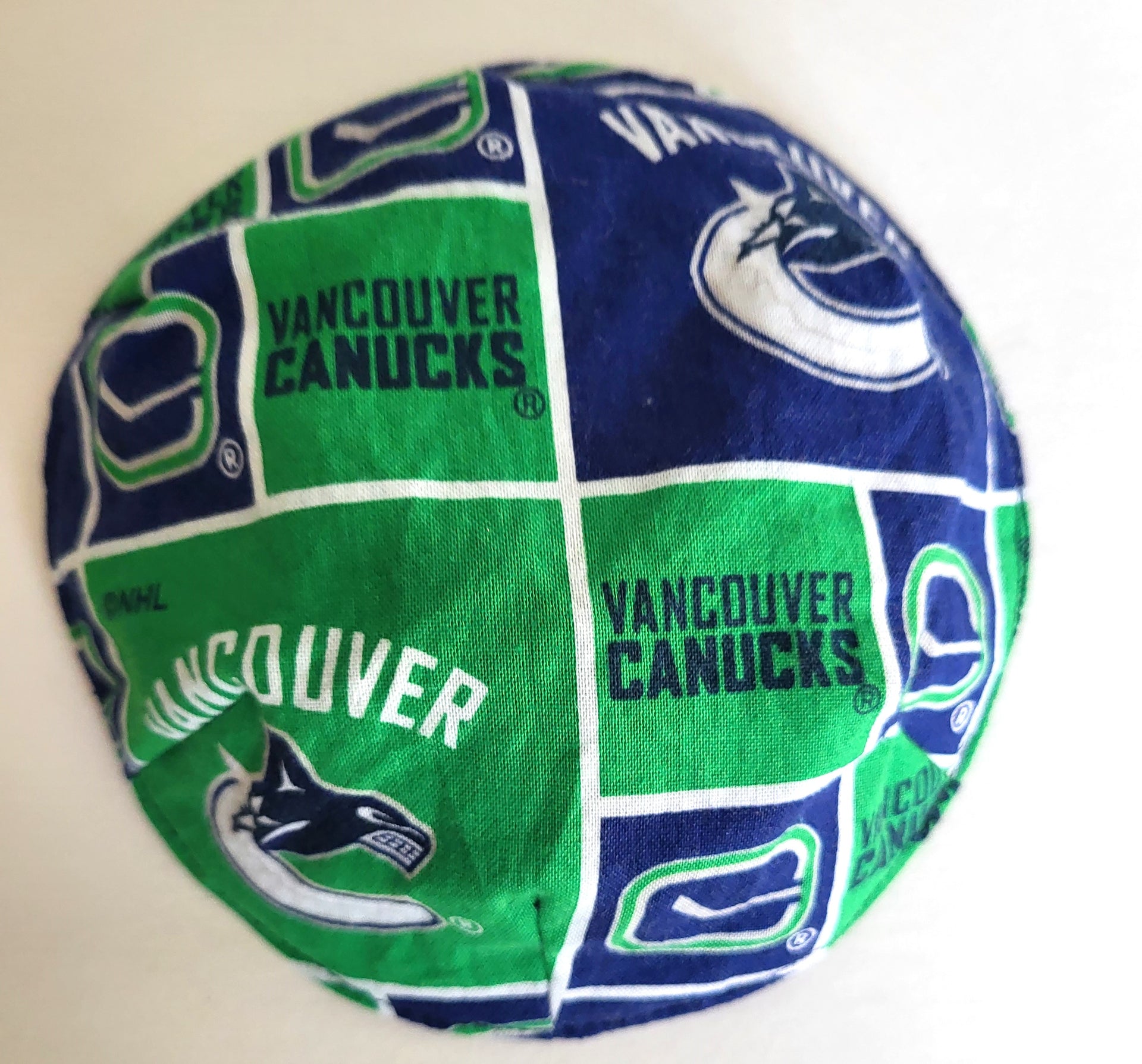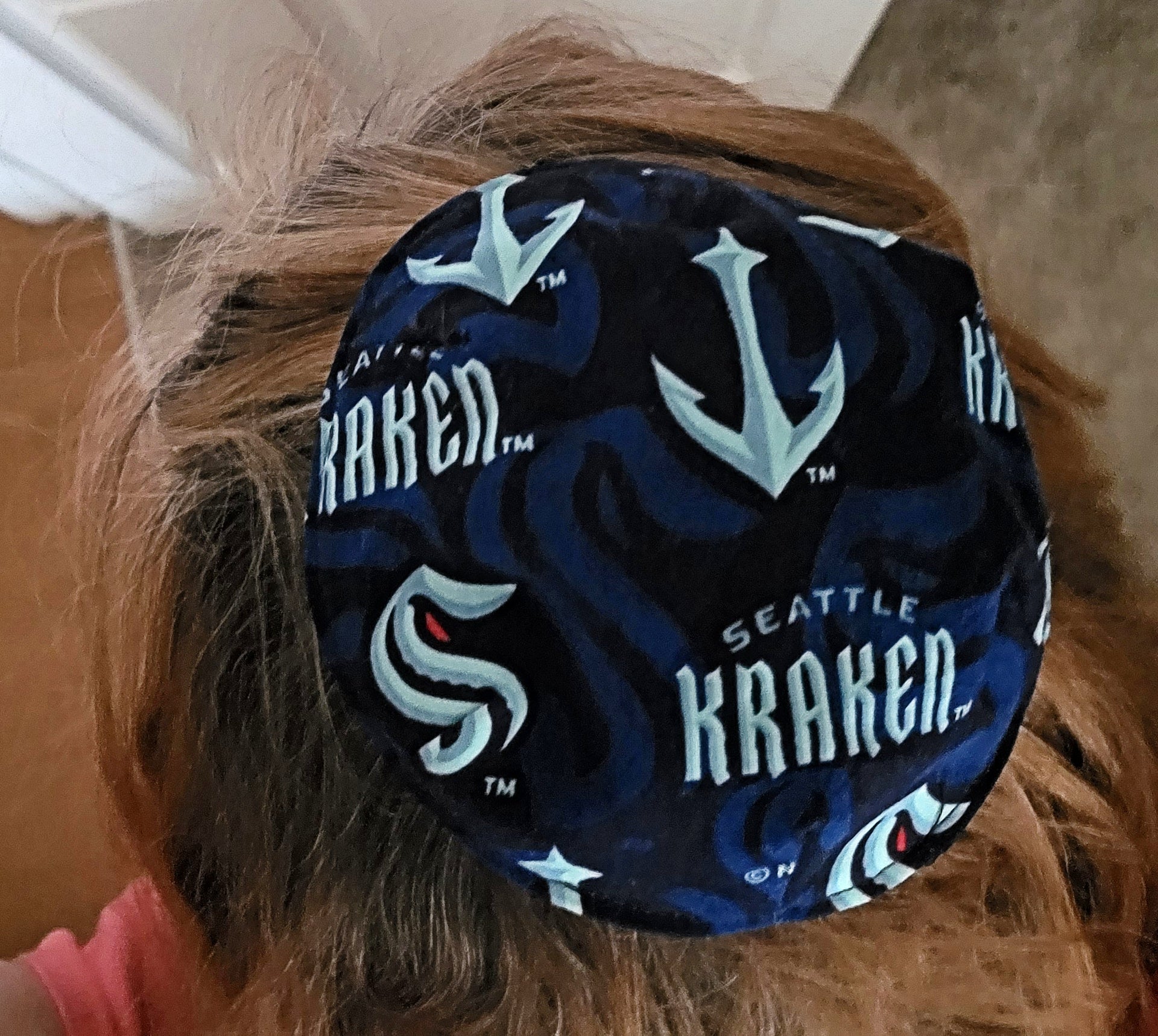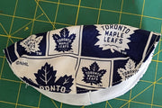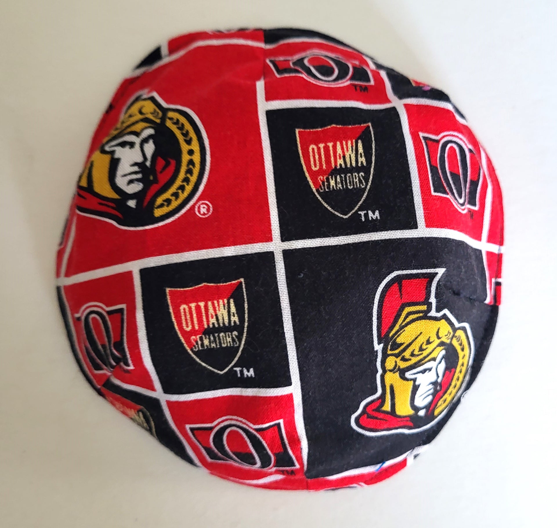 Hockey team Saucer Reversible kippah or yarmulke major sports teams NHL. This is my saucer kippah which has very clear motifs as there are no seams on the top of the kippah, reversible to a solid color(2 kippahs in one!). We have all the USA teams, and six Canadian teams: Edmonton Oilers, Toronto Maple leafs, Montreal Canadiens, Ottawa Senators, Vancouver Canucks, Winnipeg Jets.