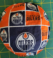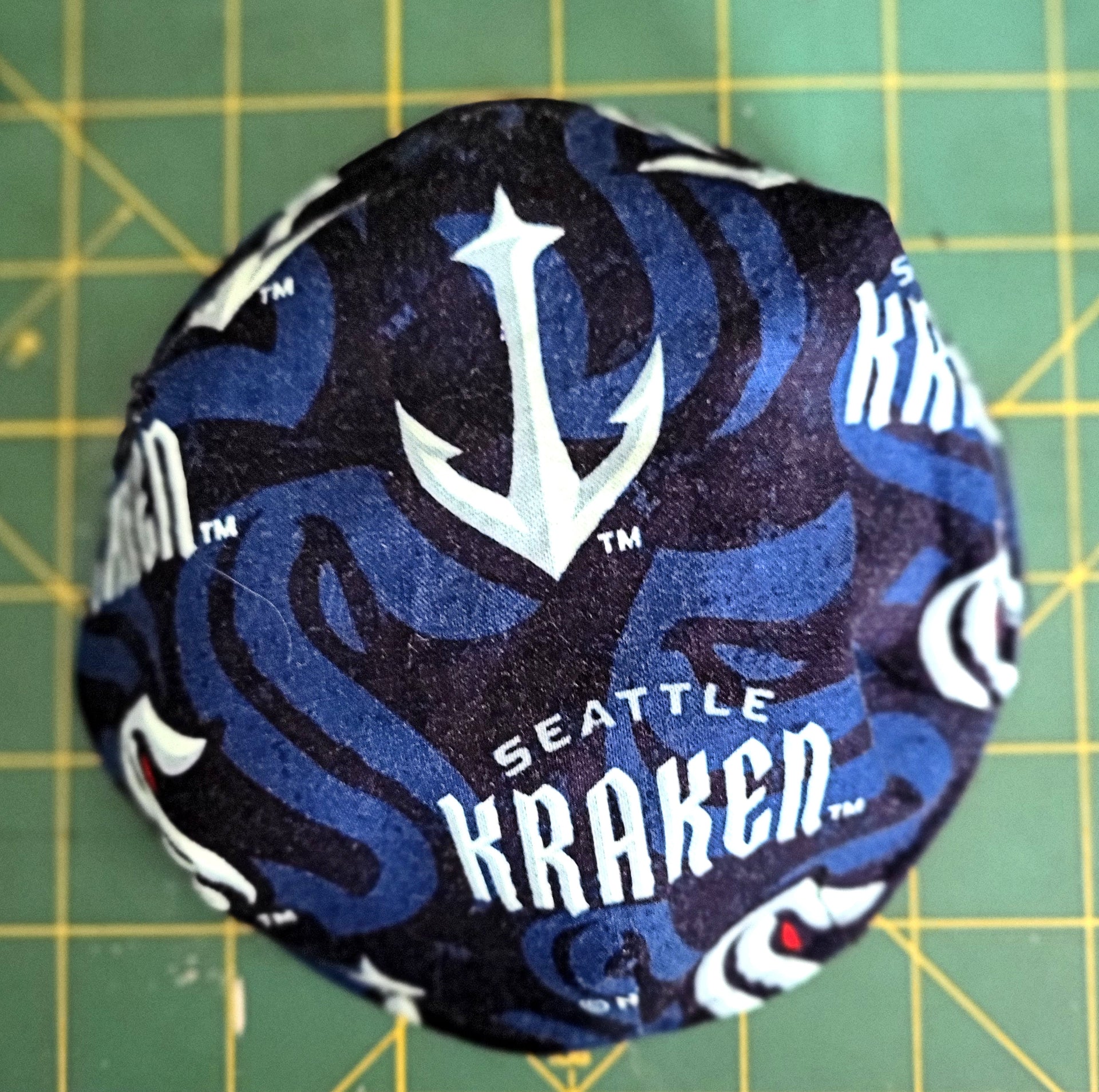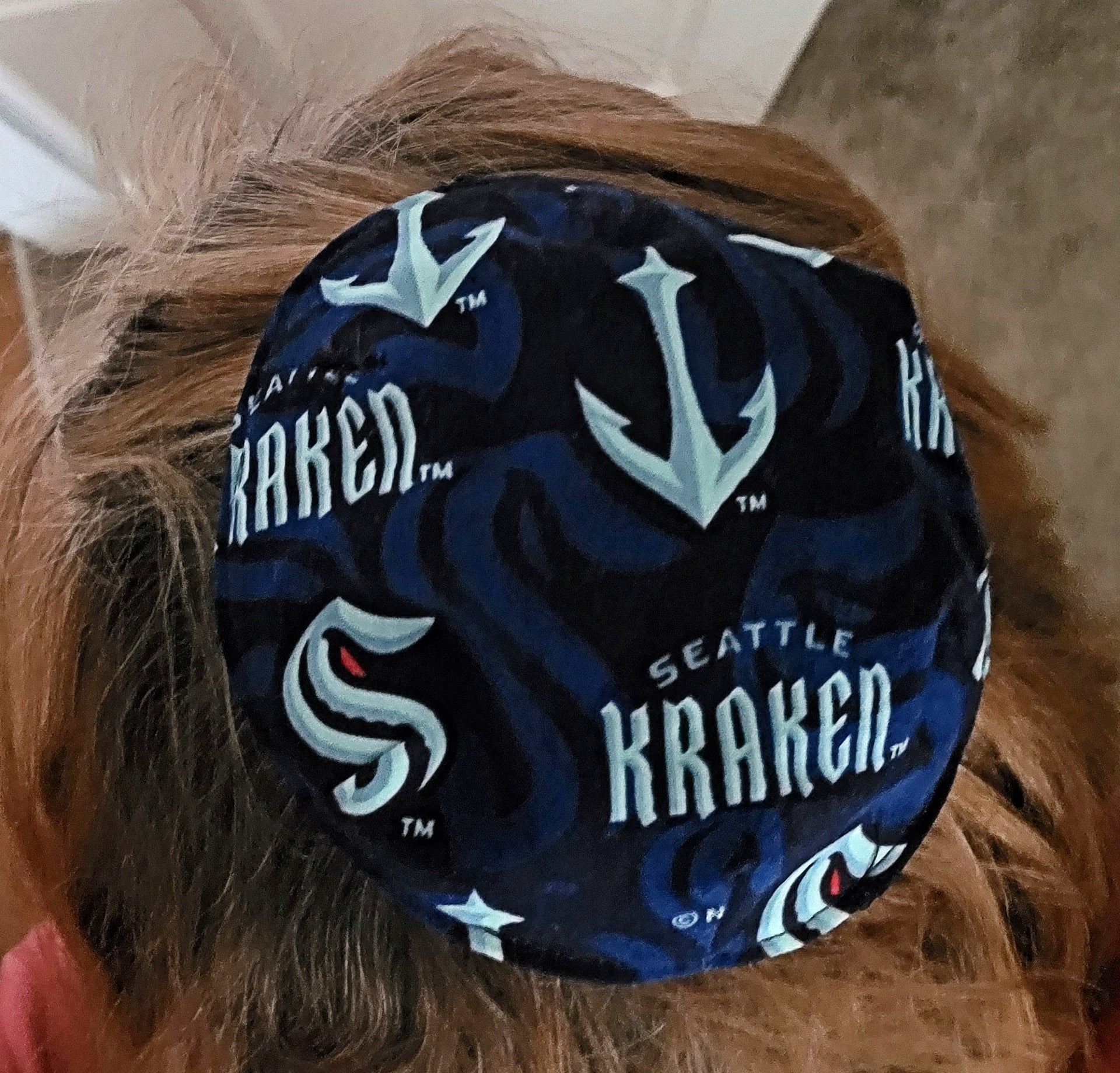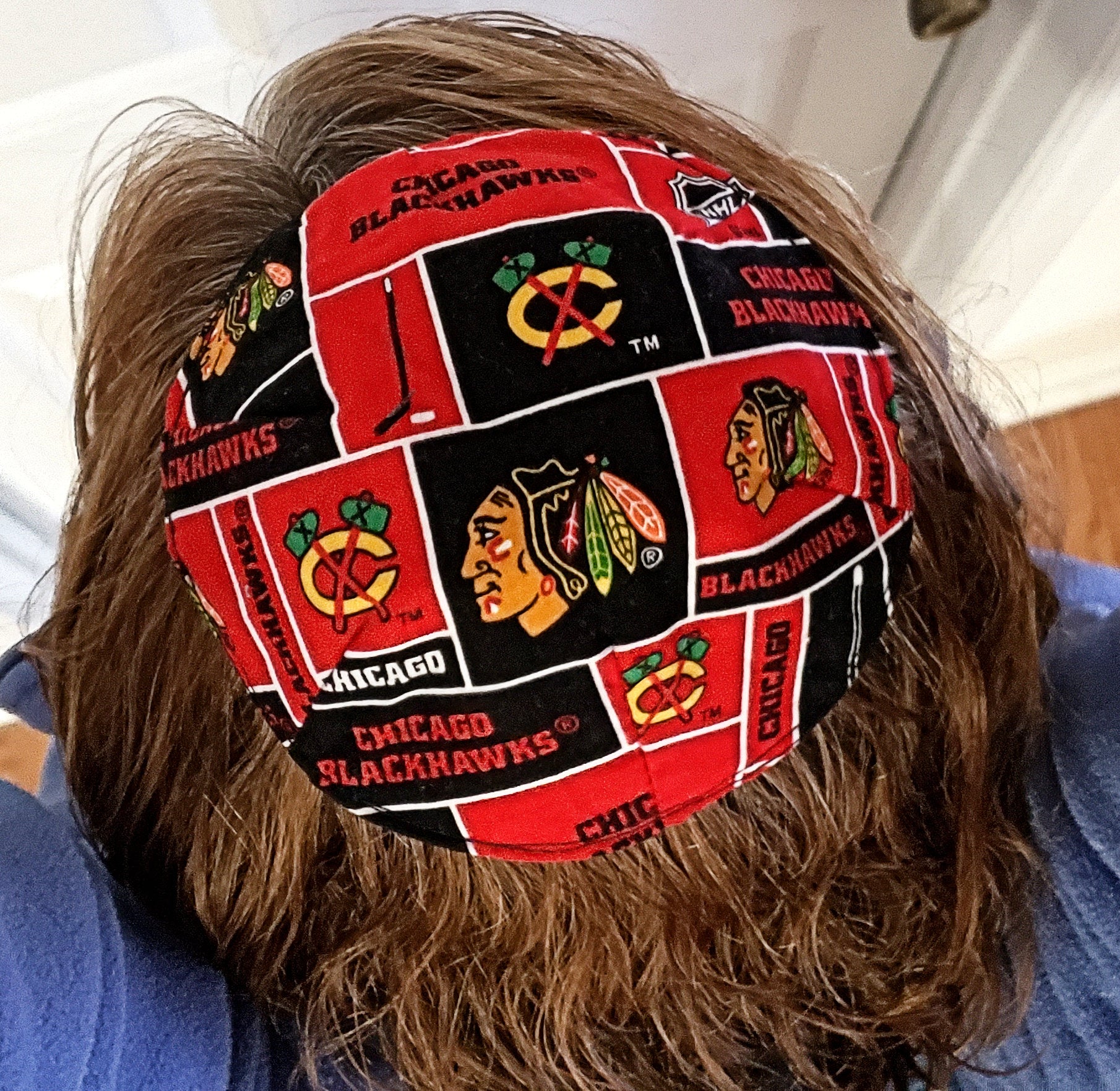 Hockey team Saucer Reversible kippah or yarmulke major sports teams NHL. This is my saucer kippah which has very clear motifs as there are no seams on the top of the kippah, reversible to a solid color(2 kippahs in one!). We have all the USA teams, and six Canadian teams: Edmonton Oilers, Toronto Maple leafs, Montreal Canadiens, Ottawa Senators, Vancouver Canucks, Winnipeg Jets.