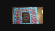 I made this beautiful and colorful challah cover with this very colorful art deco cotton fabric. Shabbat Shalom in Hebrew is embroidered with turquoise letters on to black Kona cotton. I accented this with a mottled turquoise fabric, then the art deco and then more turquoise fabric. The cover is lined with a solid turquoise Kona cotton.