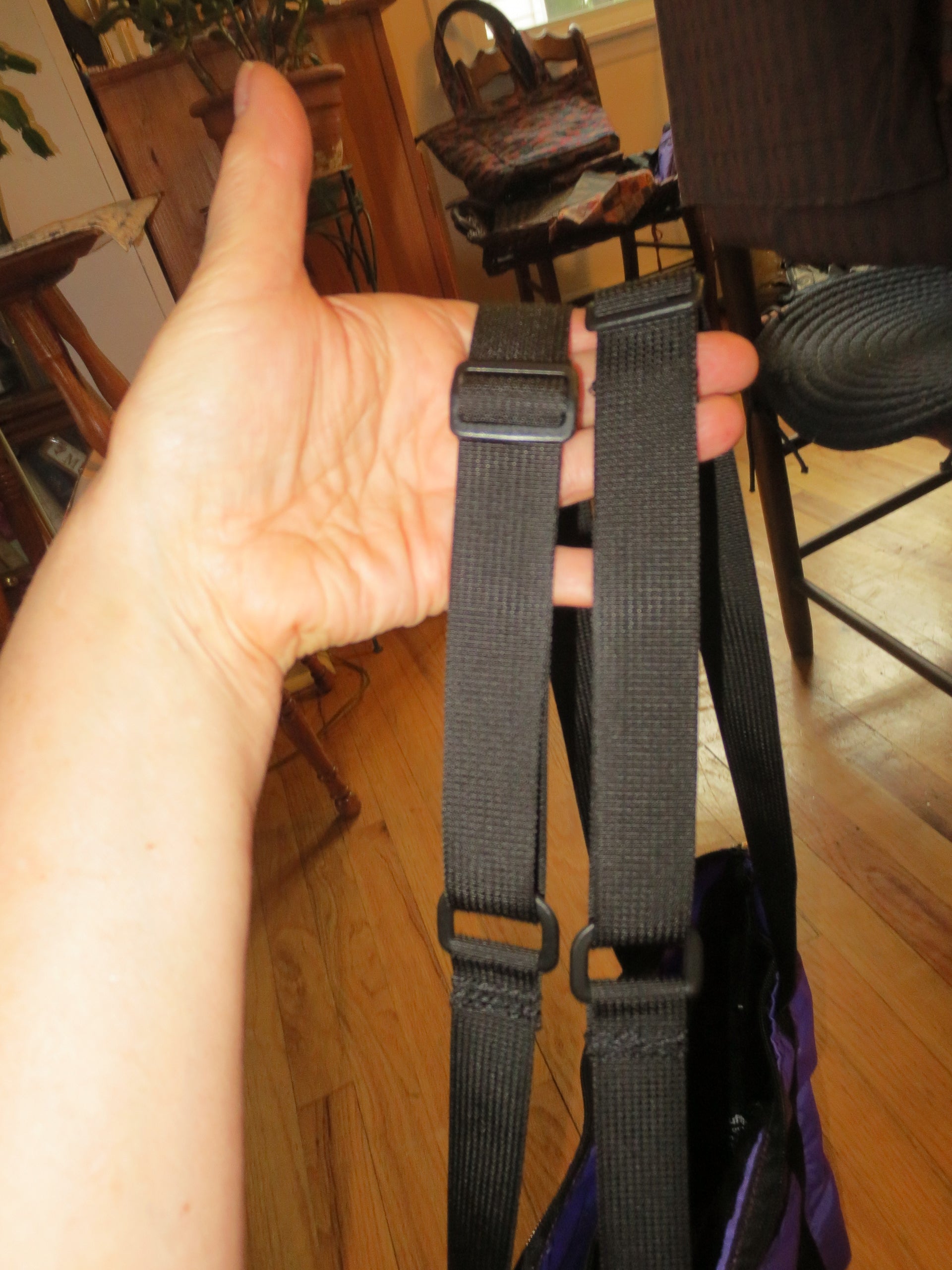 1" wide black nylon adjustable handles with a minimum drop of 10" to a maximum drop of 17" so you will have plenty of room to carry this tote purse comfortable with a winter coat or in a tee shirt.   These very comfortable handles go all the way around the bag.  The dee ring / trislide combination make adjustment a snap.