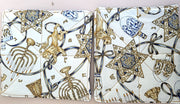 Hanukkah Menorahs, Dreidels and Stars all in metallic gold reversing to blue metallic gold multi-toss Stars of David