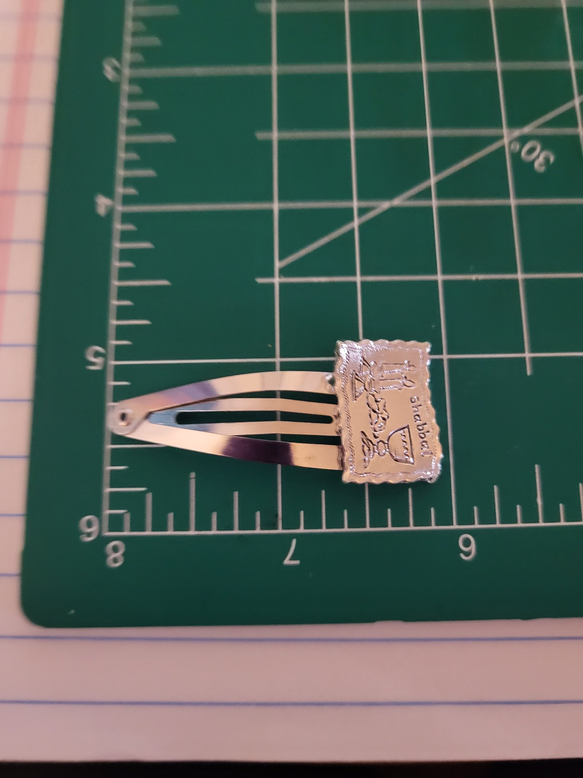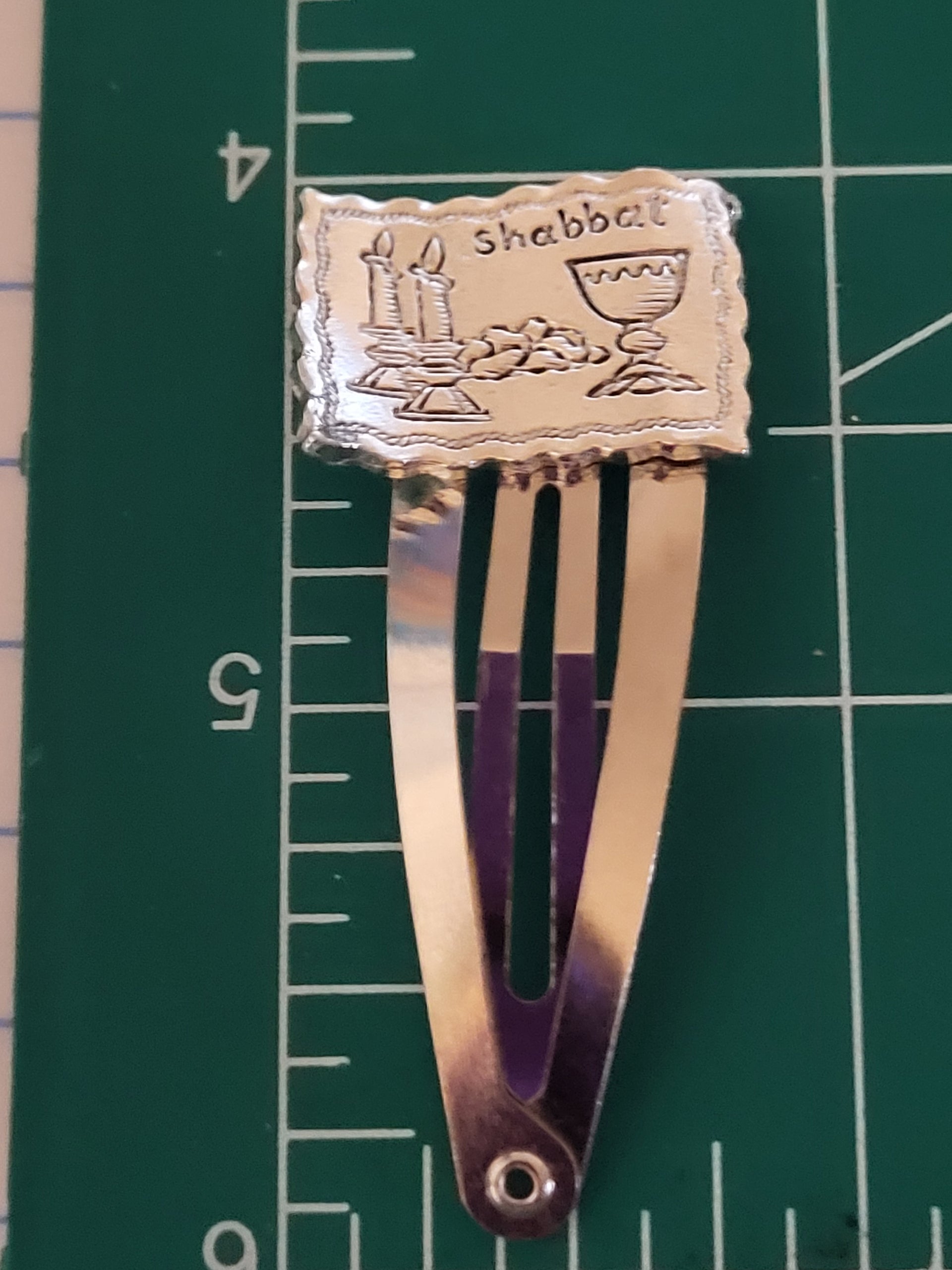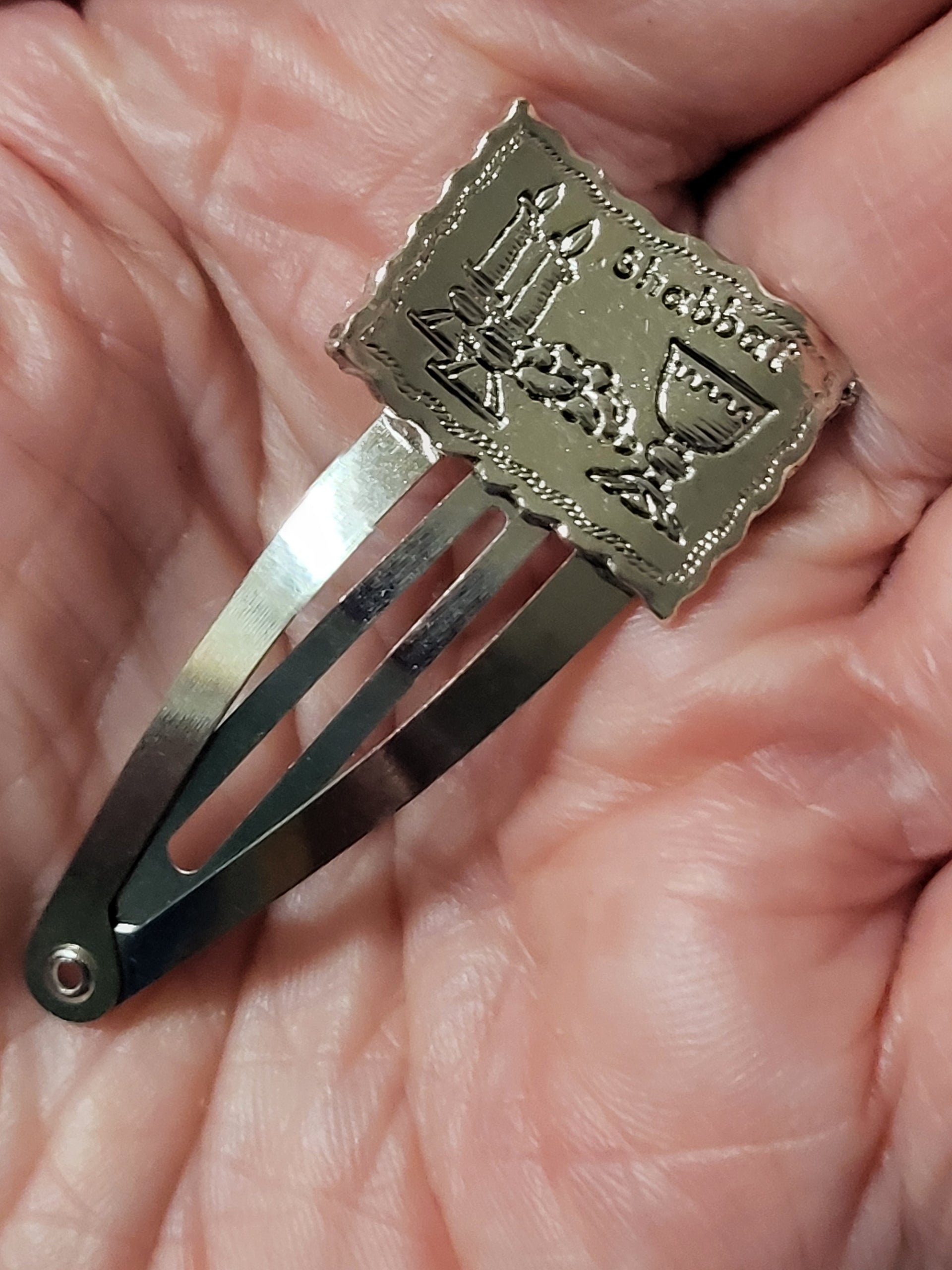 Dimensions (approximate): the kippah clip is 2" long; the widths vary by the charm: round tree of life: 1" wide: Hamsa with Star. tree tree of life, Star of David L'Chi, Jerusalem Star and Double Star of David, owl, Tzedaka box, Menorah, lotus flower, Seder Plate, Haggadah, Ani L’Dodi V’Dodi Li, challah Shabbat bread, 3/4" wide