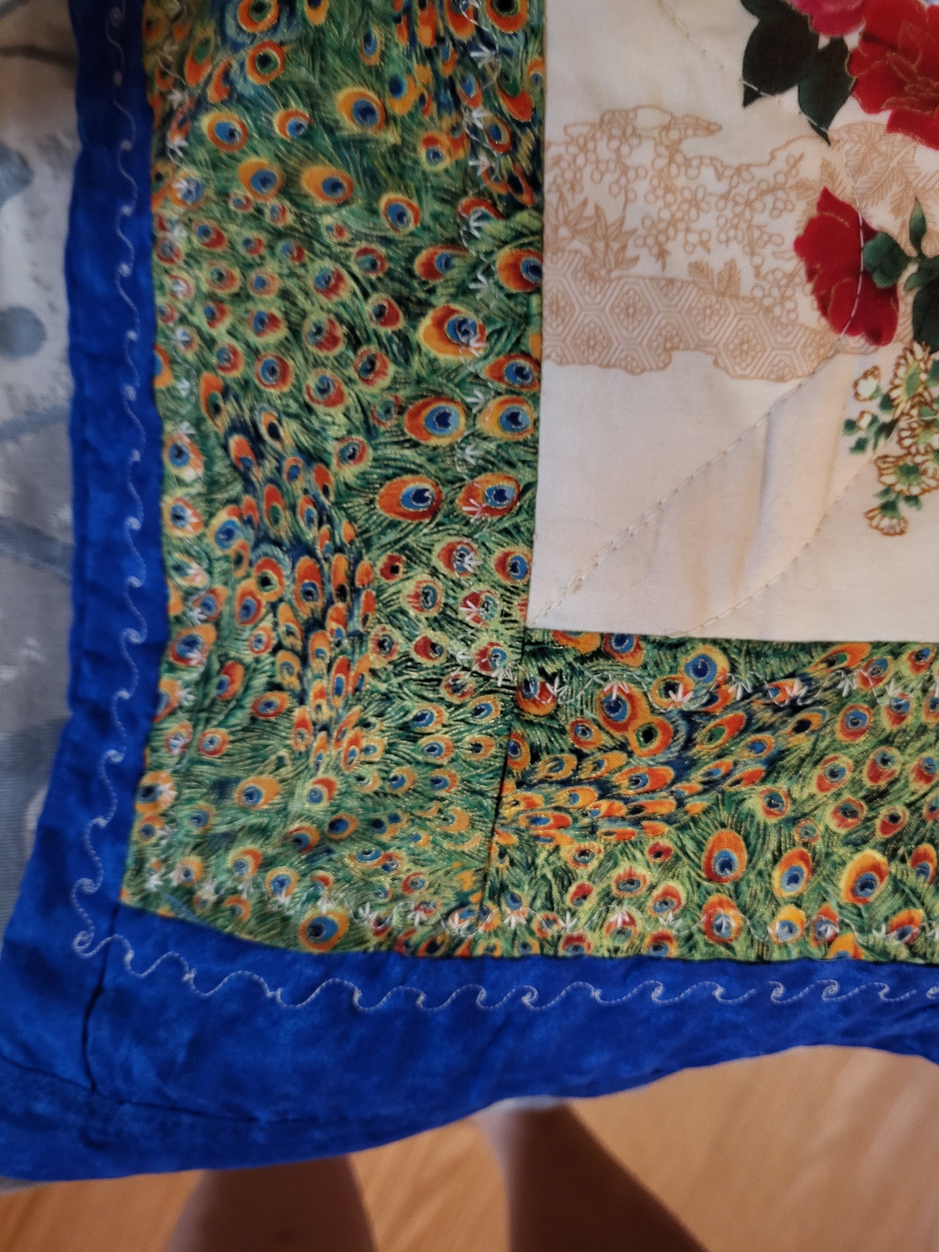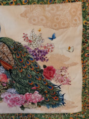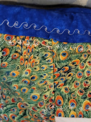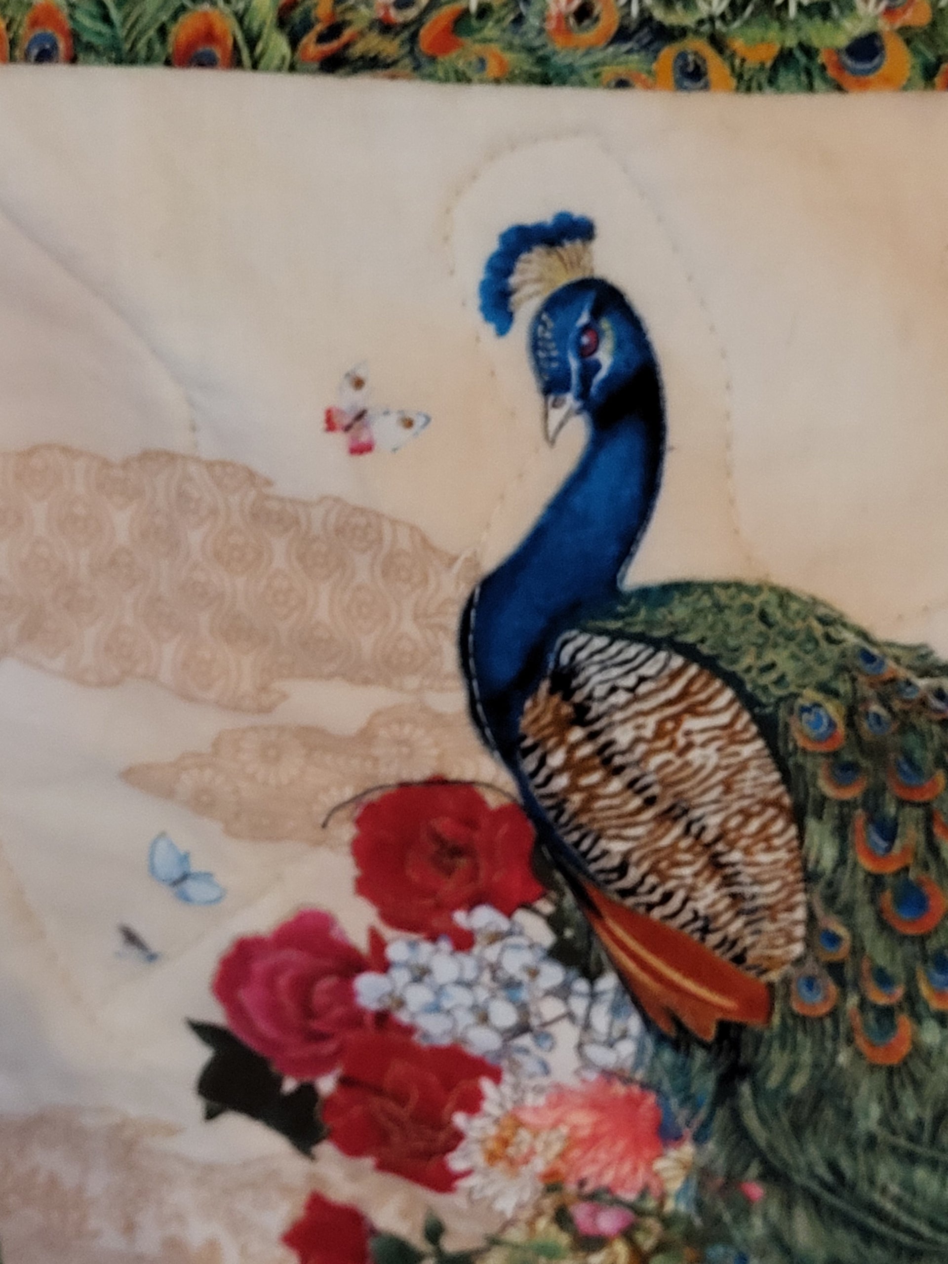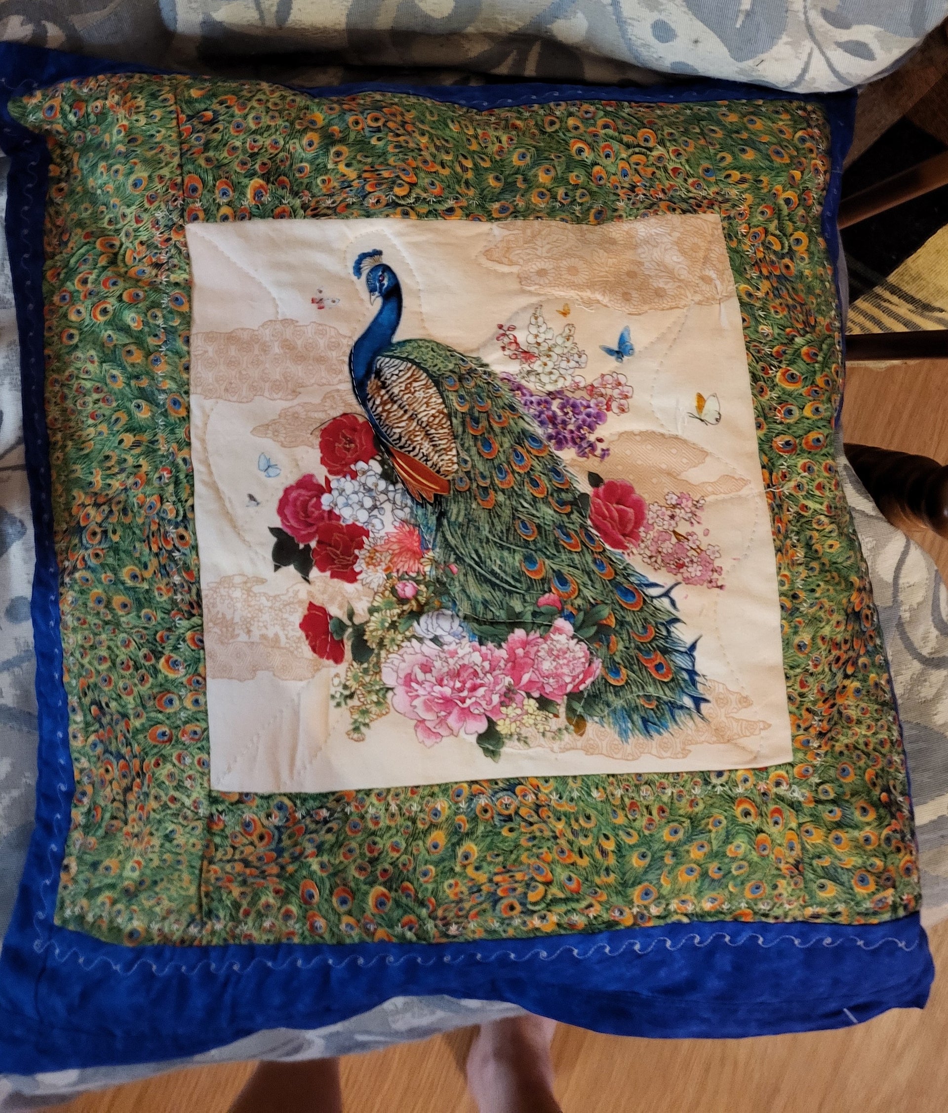 I quilted around this beautiful peacock bird and the flowers. I added peacock feathers inspired cotton metallic gold fabric and then coordinating royal blue. The back of the pillow is the same royal blue. I used a polyester batting and blue lining when I quilted this pillow cover. It has a zipper within a hidden fold. The back is a beautiful multi blue floral so this pillow cover is reversible.