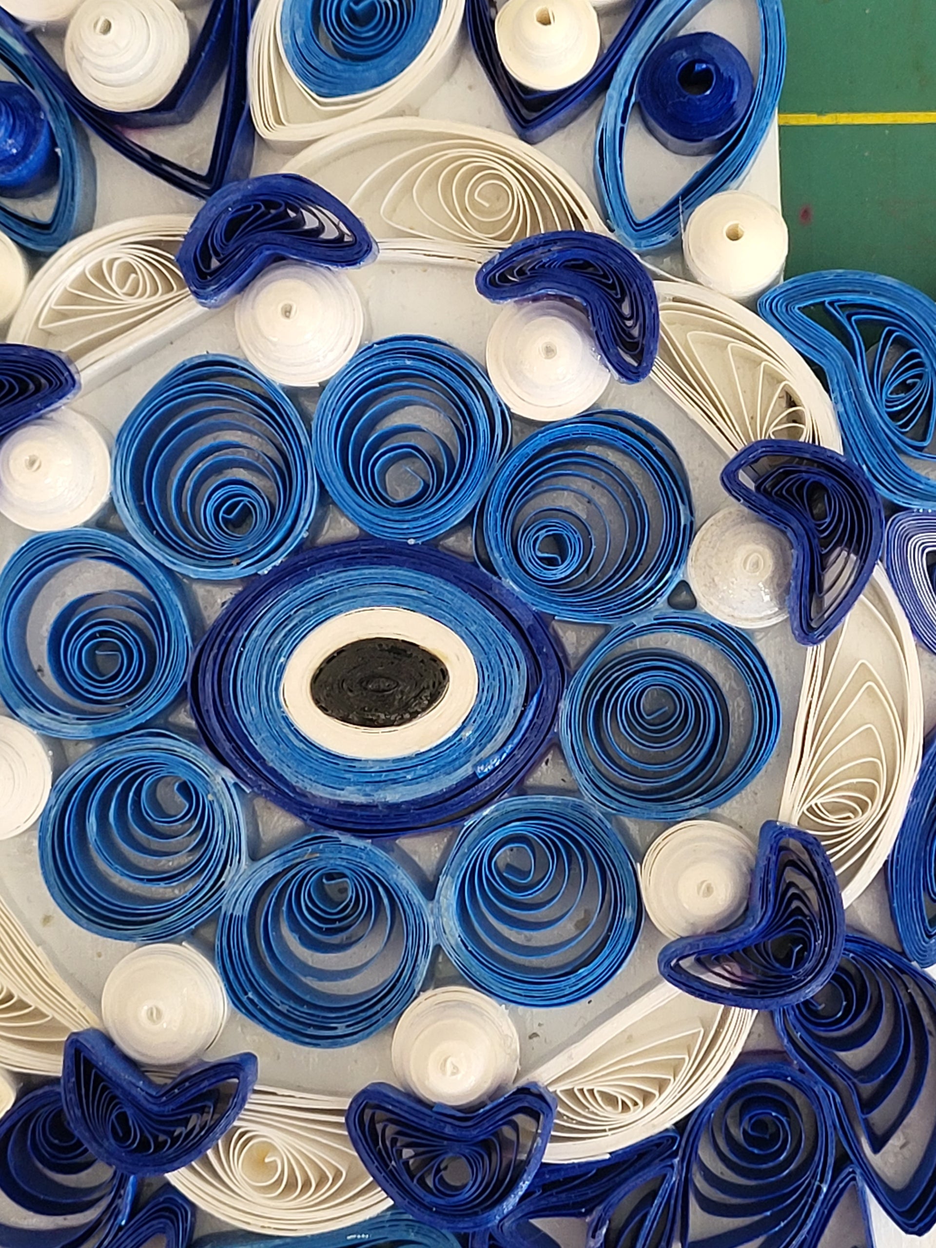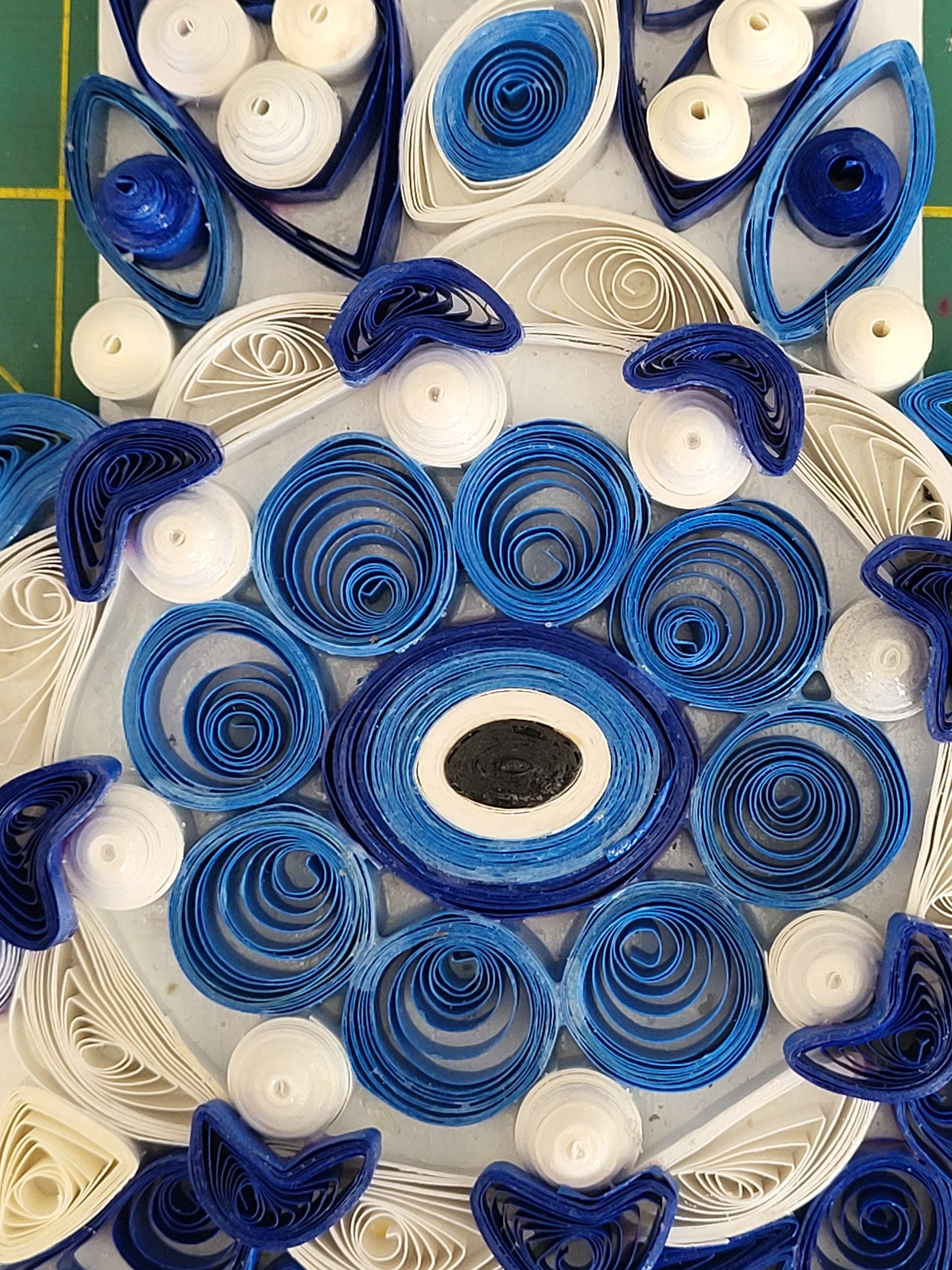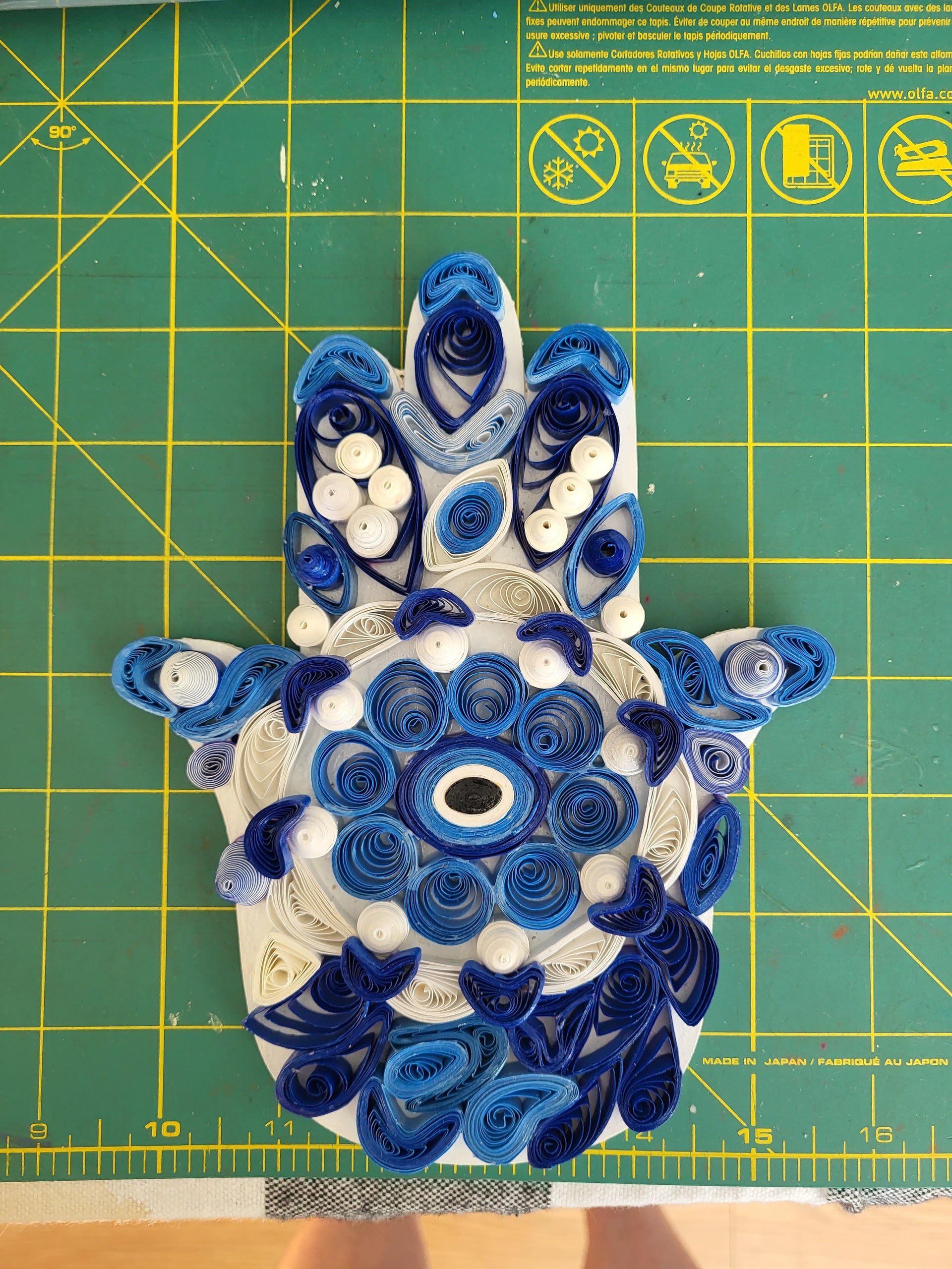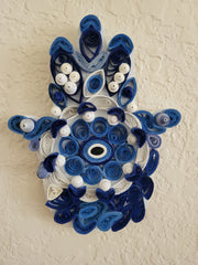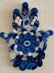 I have created a beautiful quilled Hamsa (Hand of Fatima, Hand of Miriam, Hand of G-d) a wooden Hamsa blank, painted in white, and then added a variety of white and blue quilled objects / shapes, including an evil eye in the middle.