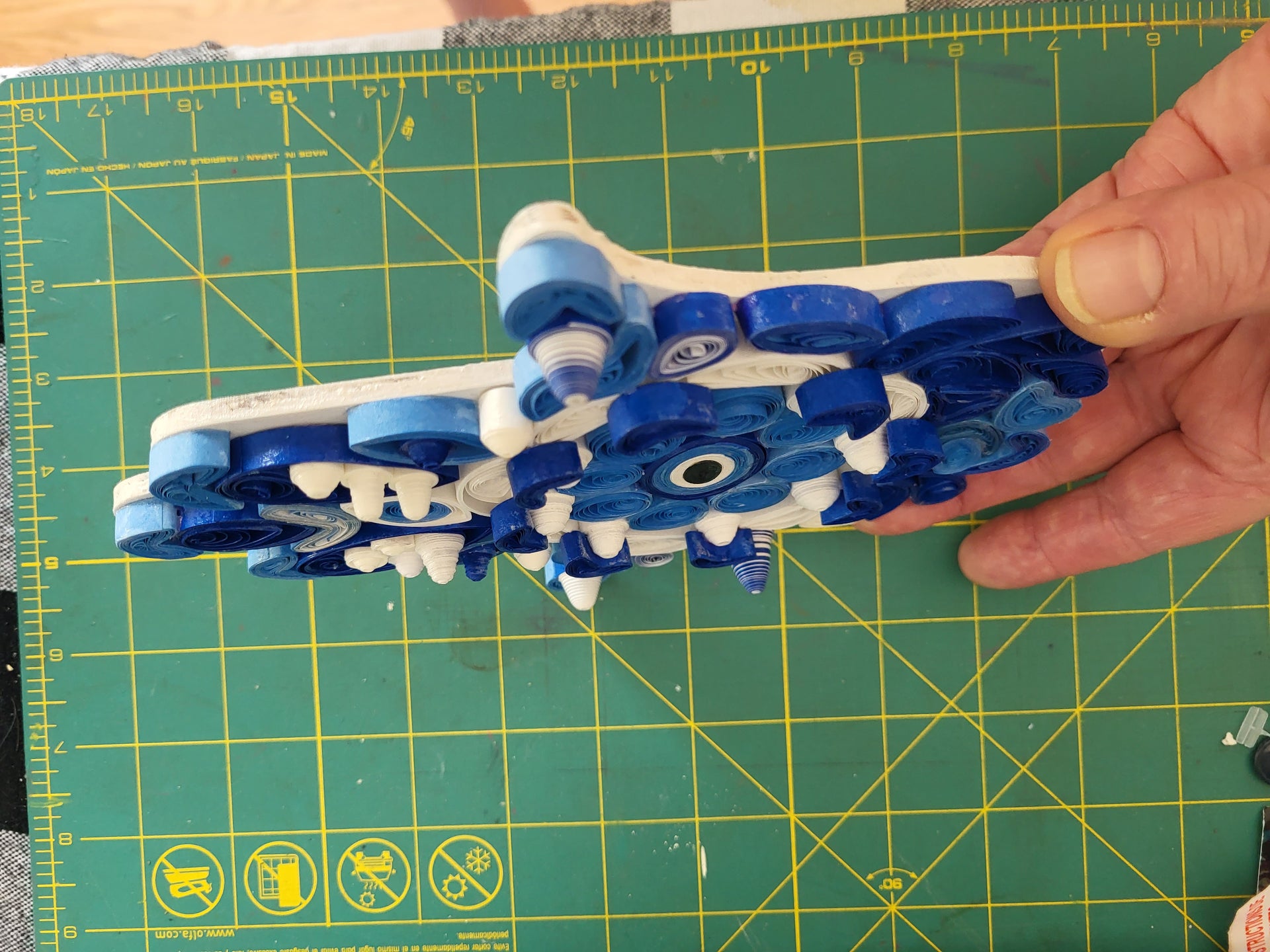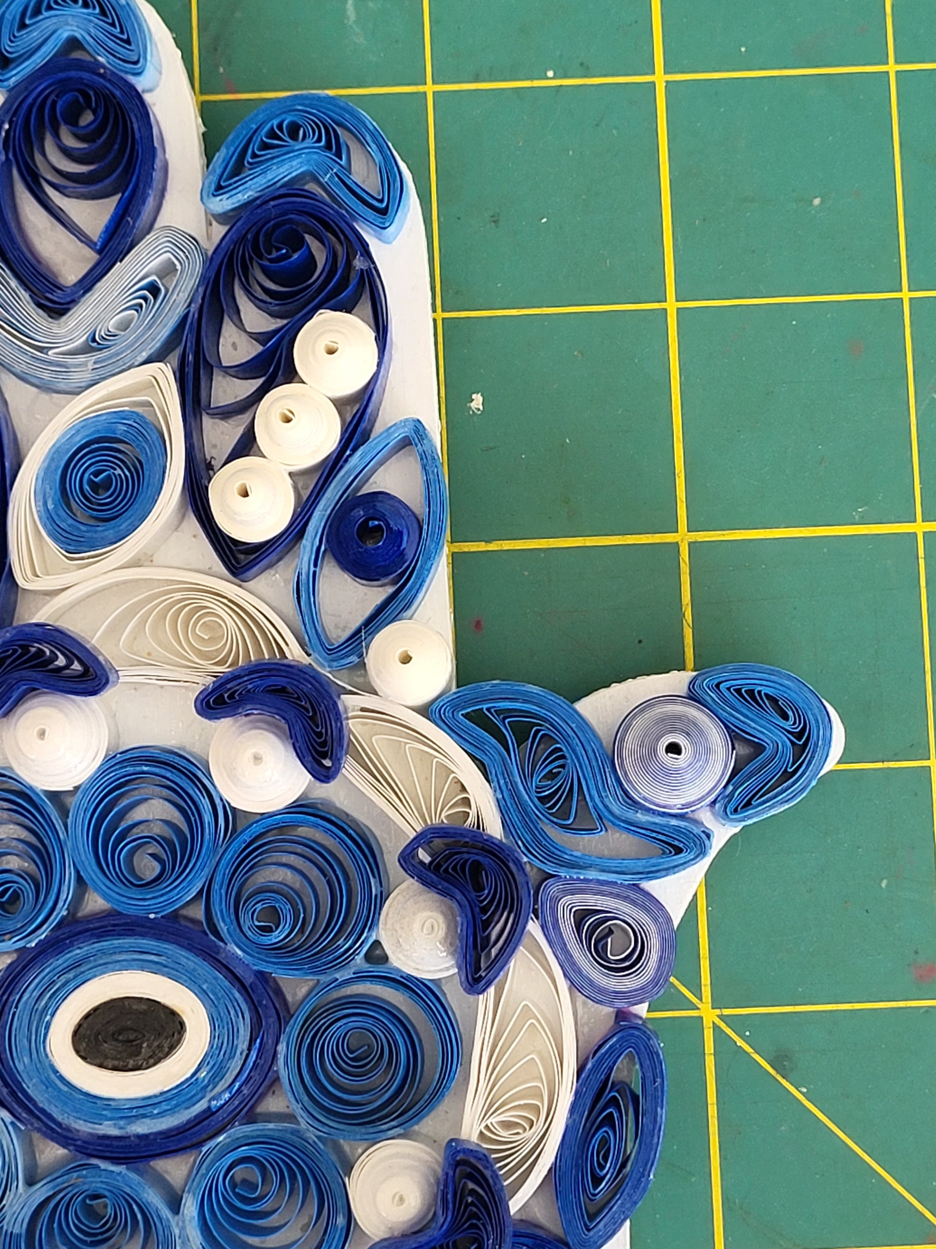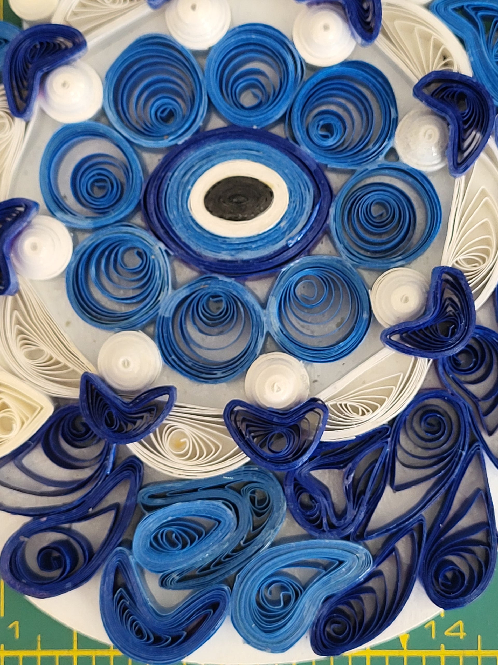 I have created a beautiful quilled Hamsa (Hand of Fatima, Hand of Miriam, Hand of G-d) a wooden Hamsa blank, painted in white, and then added a variety of white and blue quilled objects / shapes, including an evil eye in the middle.