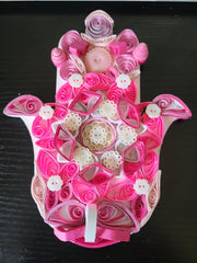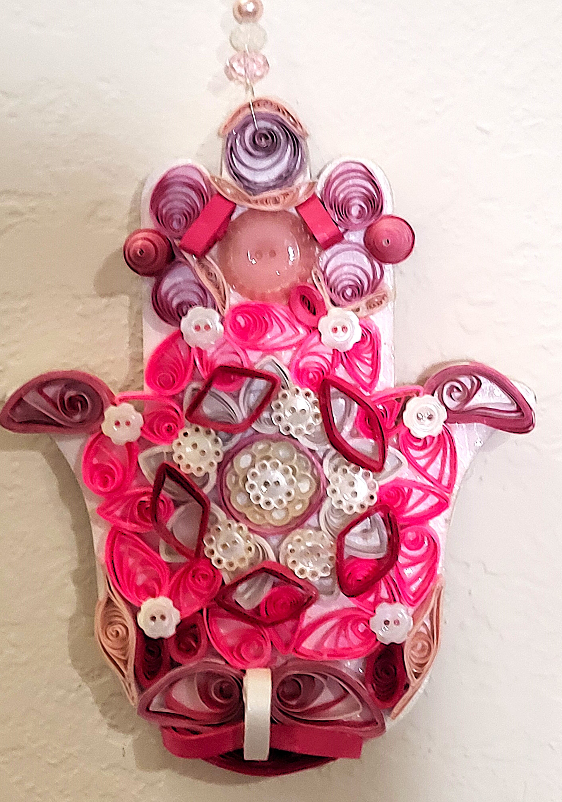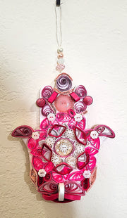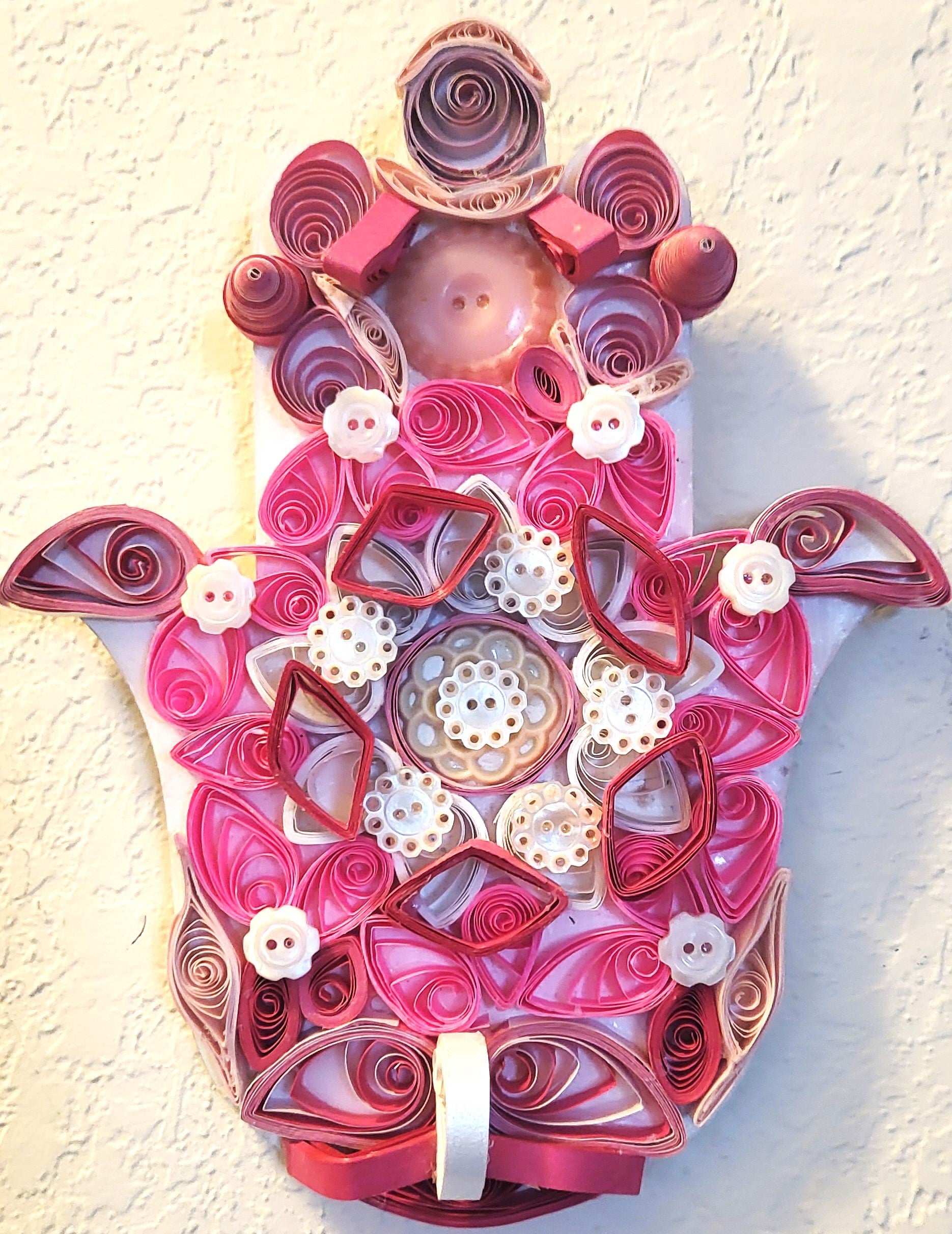 Quilled Hamsa / Hand G-d pink white mother of pearls buttons, one of a kind wall art piece.