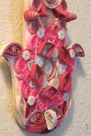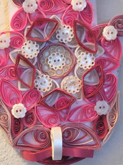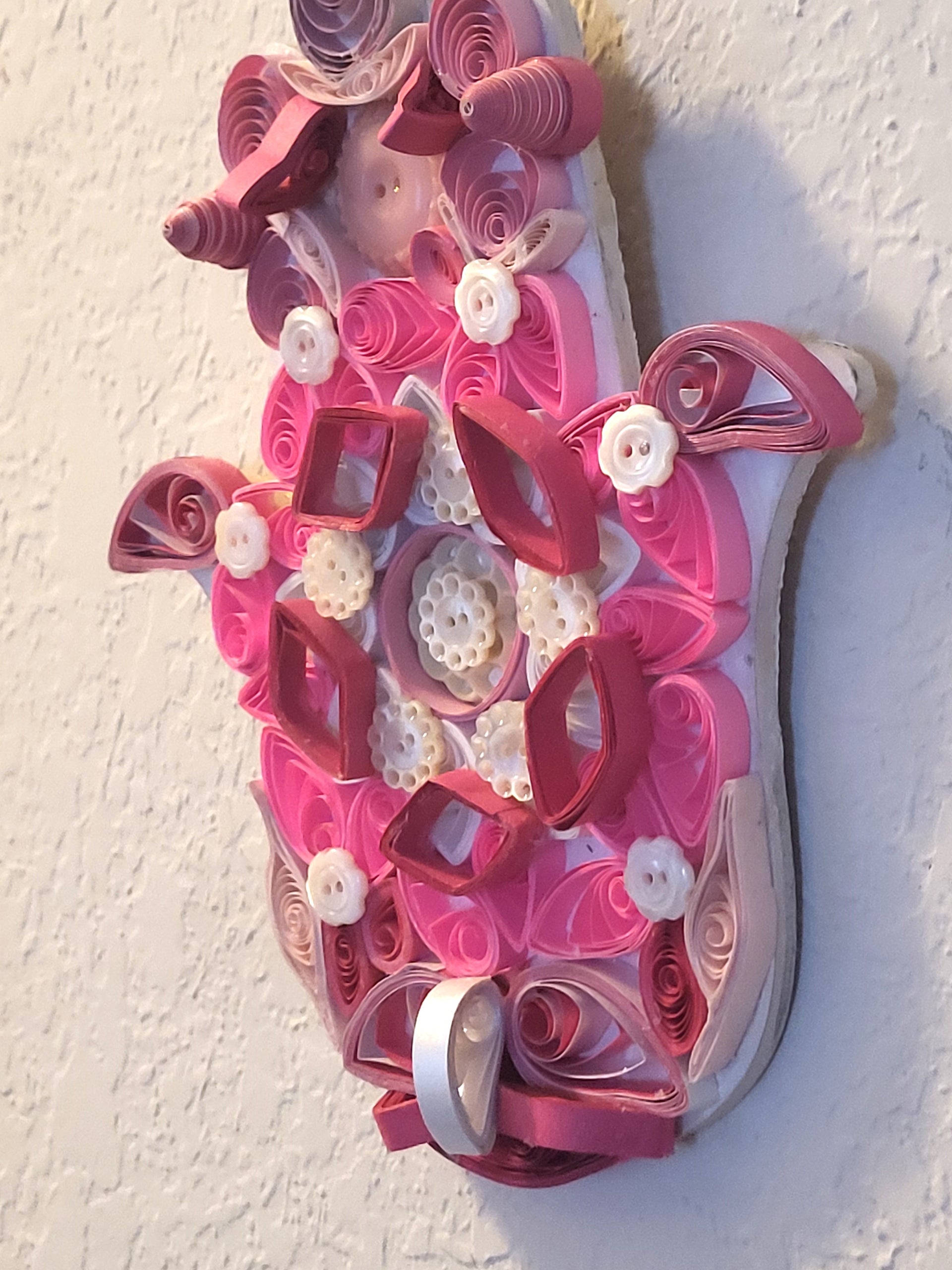 I have created a beautiful quilled Hamsa (Hand of Fatima, Hand of Miriam, Hand of G-d) a wooden Hamsa blank, painted in white, and then added a variety of white and shades of pinks quilled objects / shapes. There is a pretty pink button with rippled edges toward the top. The middel has a lacey button with a stunning flower lacey mother of pearl antique buttons. These same buttons were added in a circle, with accenting parallelogram pink objects. Six other flower vintage mother of pearls accent this piece,