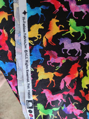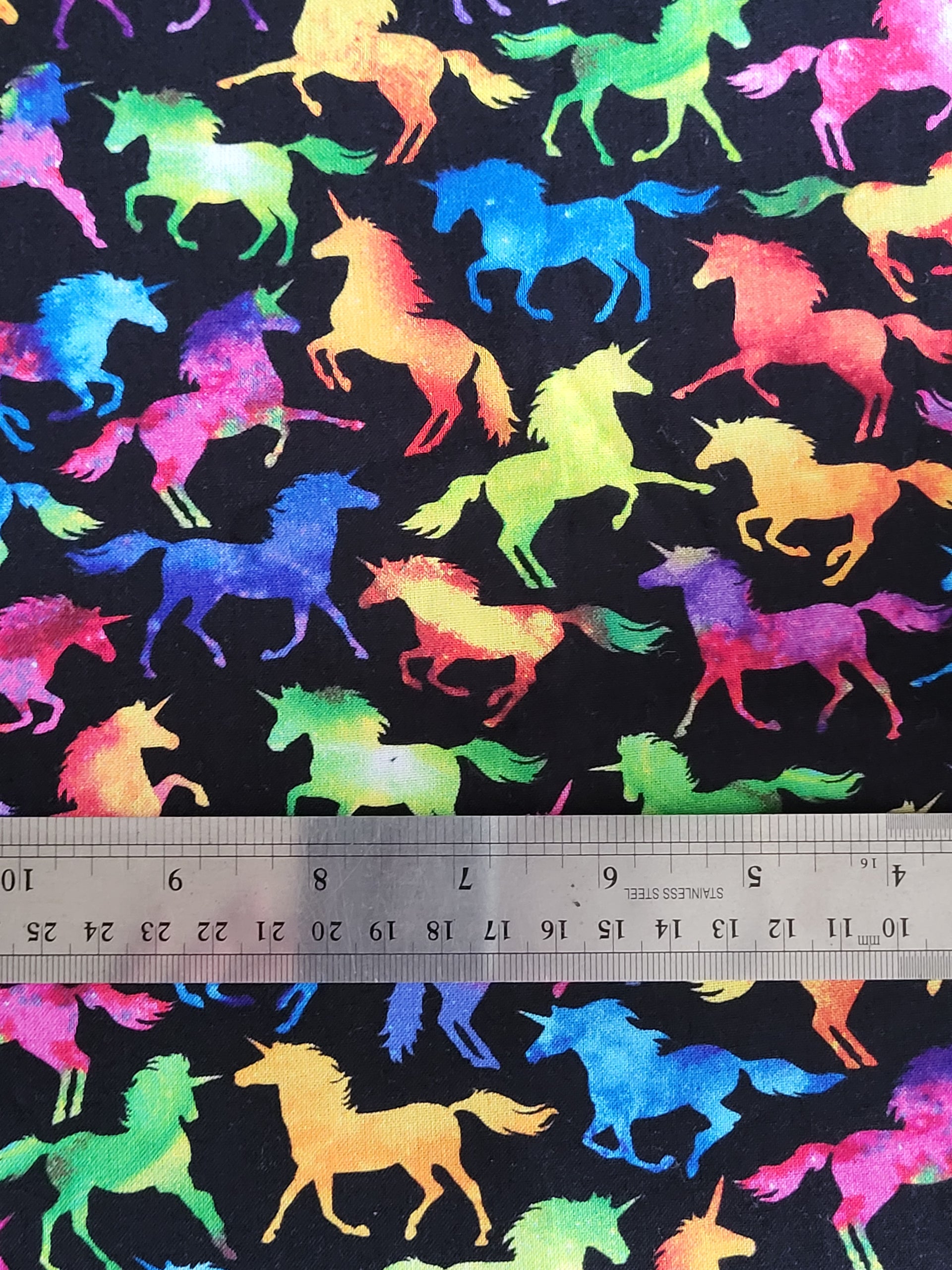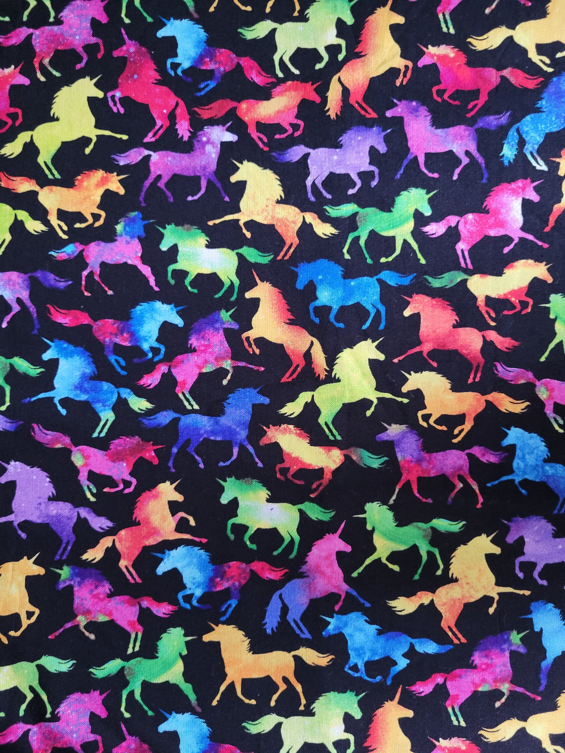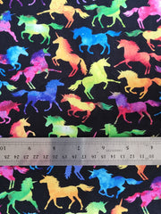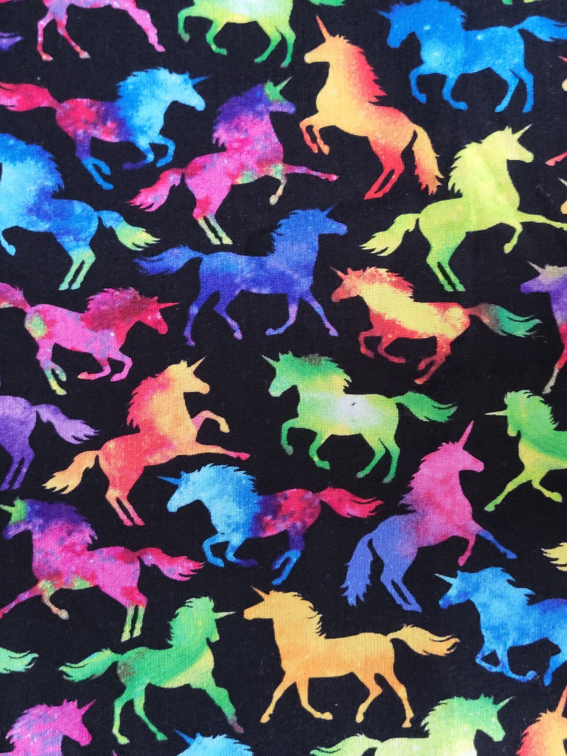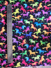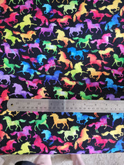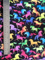 Beautiful rainbow silhouettes many unicorns in bright colors on a black background.