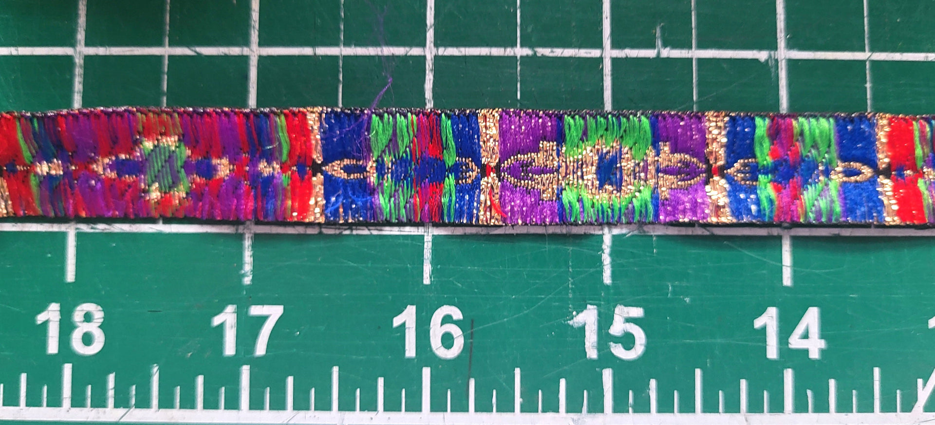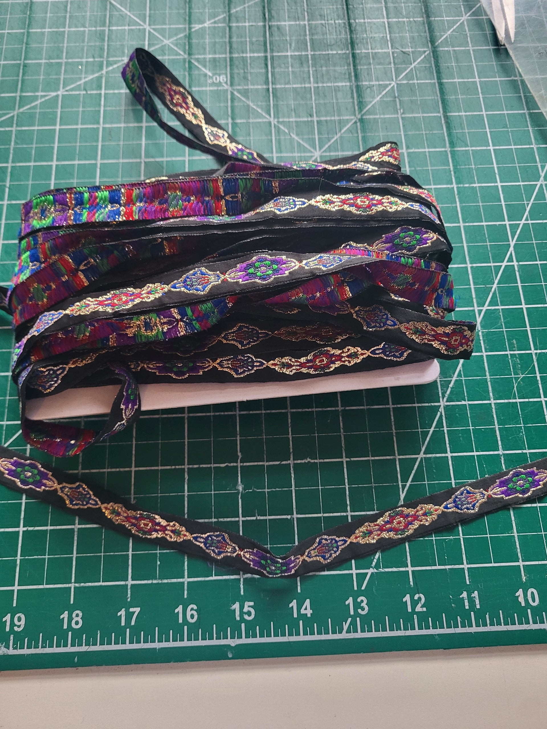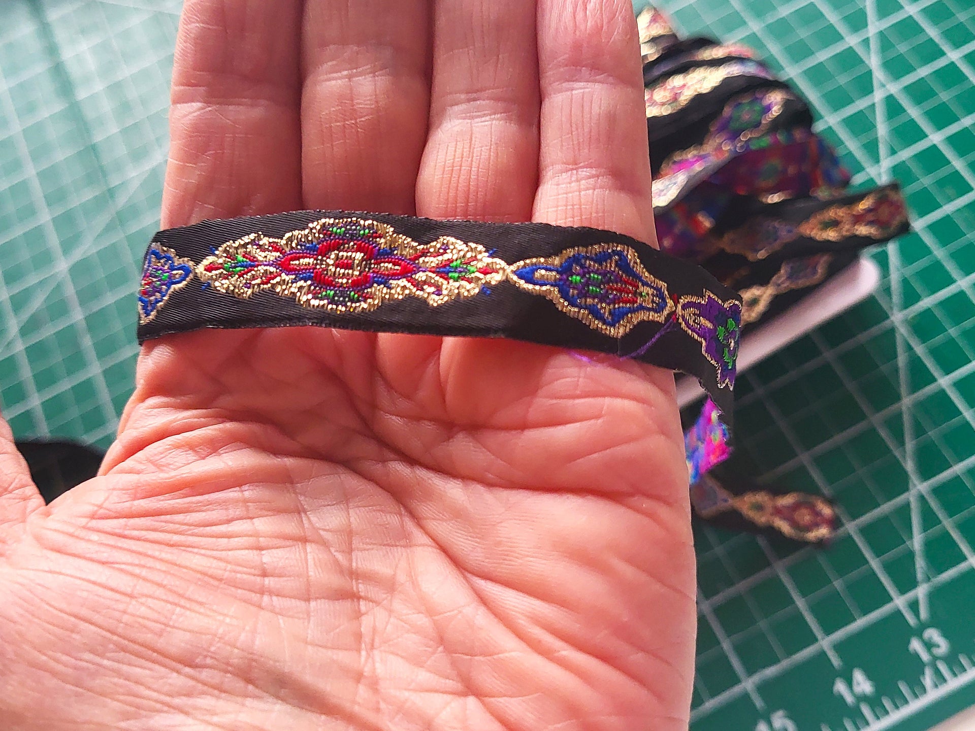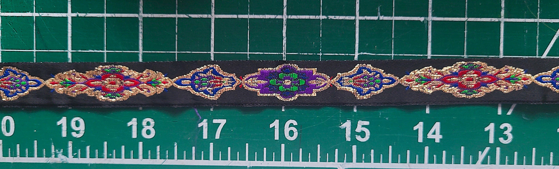 This Renaissance ribbon is a gorgeous tapestry trim that you sew on to an item. The background is black with gold, purple, emerald, and wine colors.
