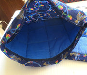 I used a polyester batting and navy blue lining when I quilted the front of this cover.