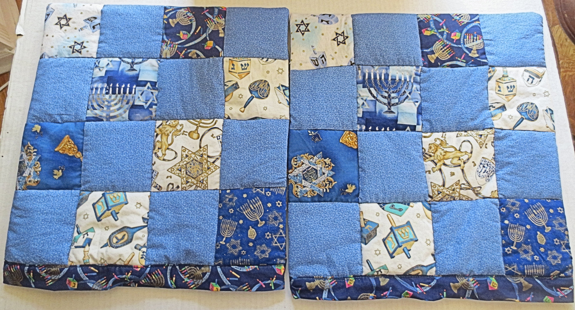 I used a square block design of 8 different blue and metallic gold Hanukkah or Chanukah fabrics. These are accented with a coordinating mini calico vine leaf pattern.
