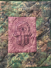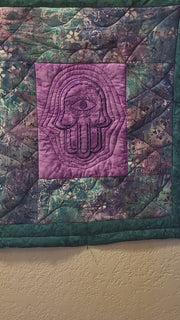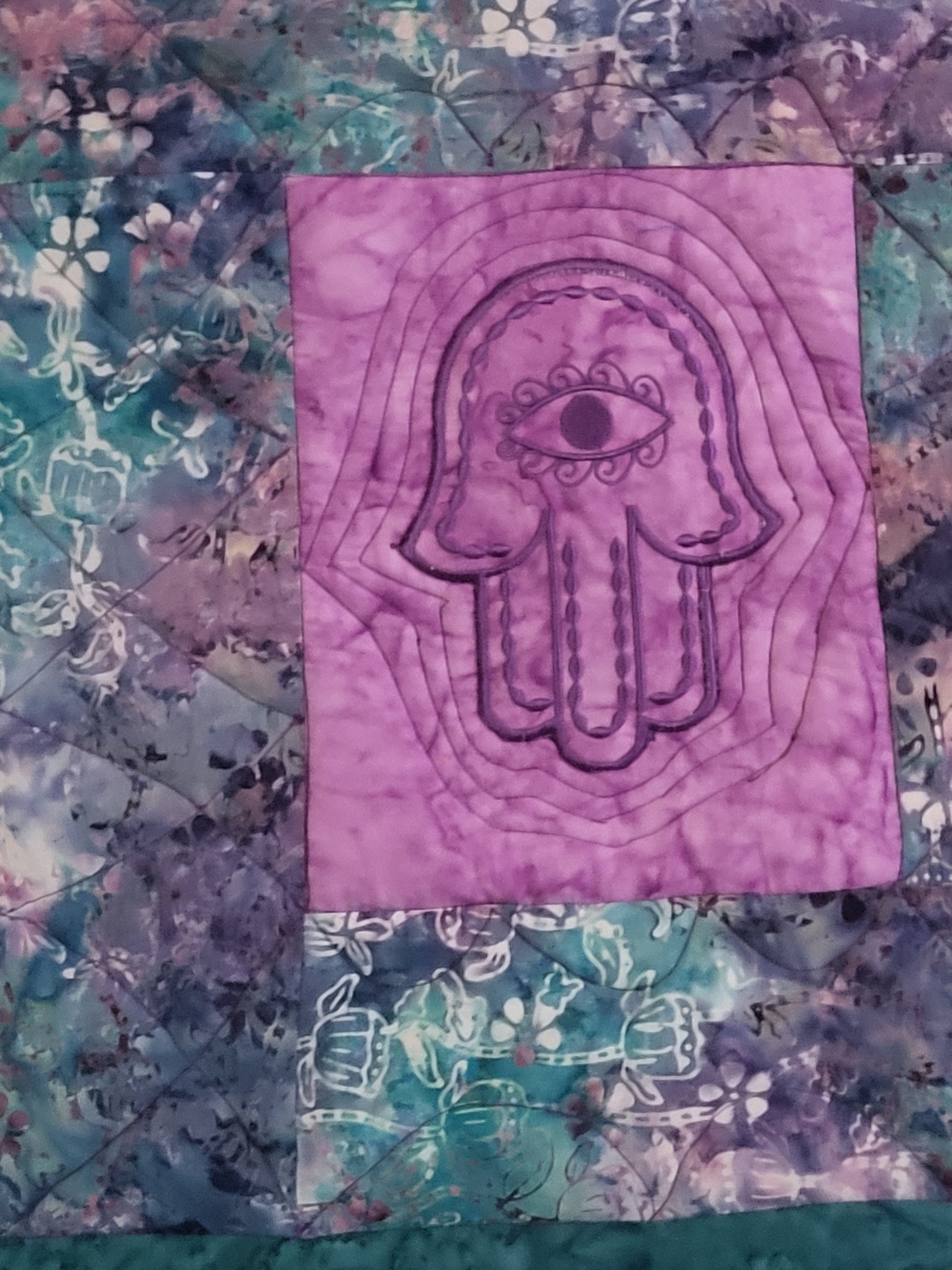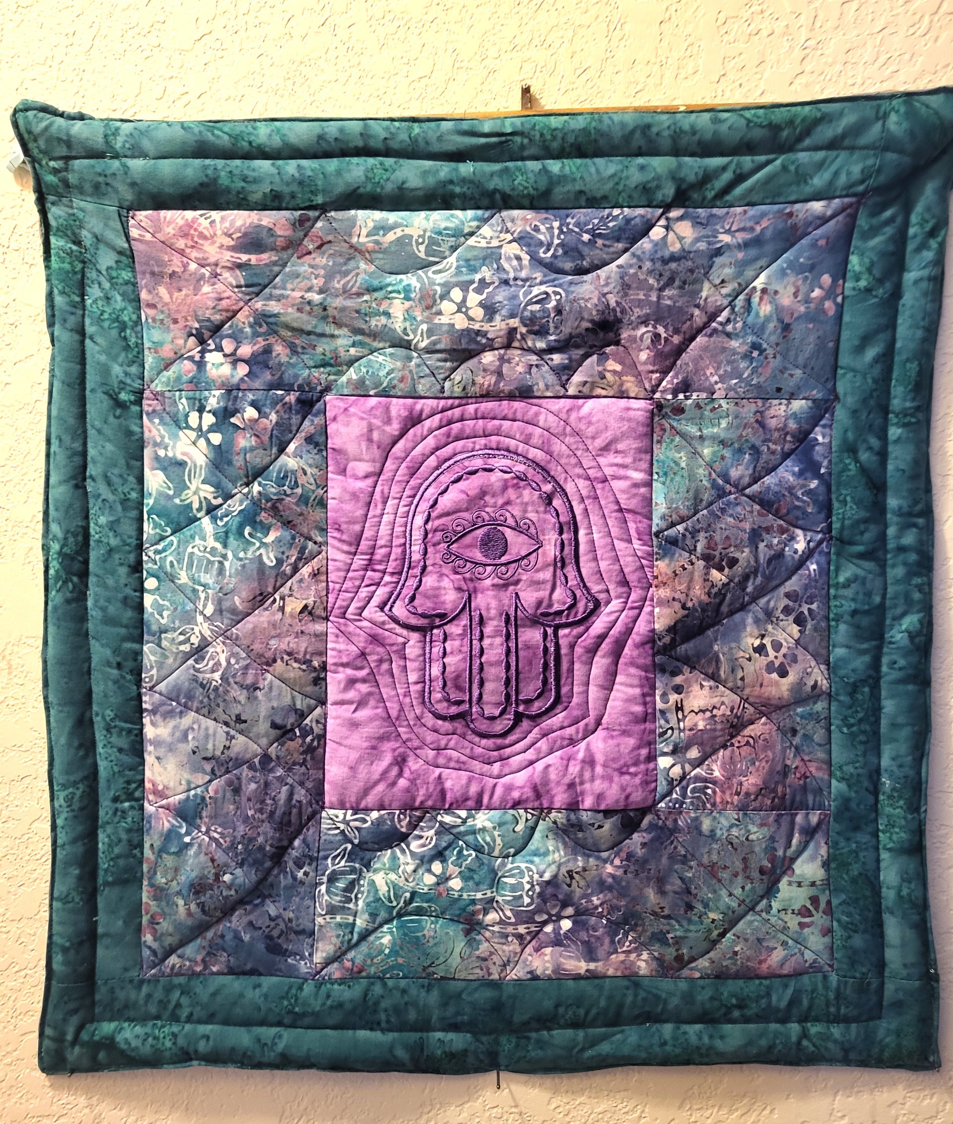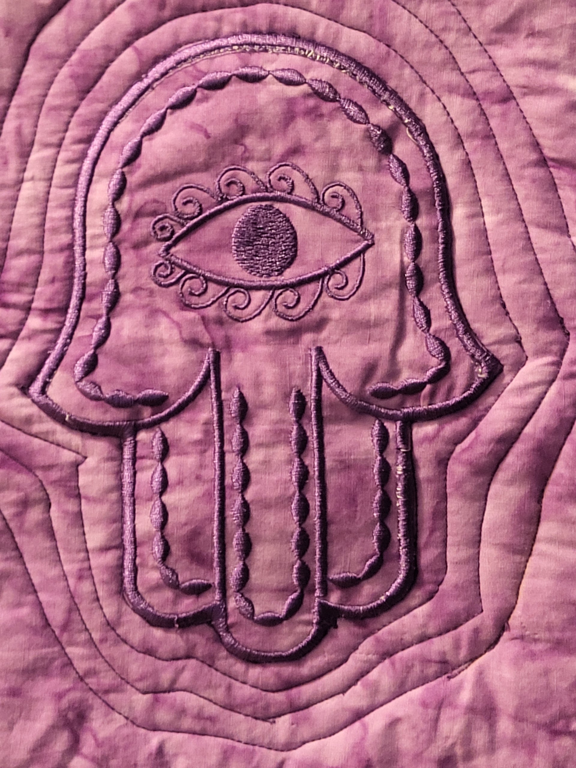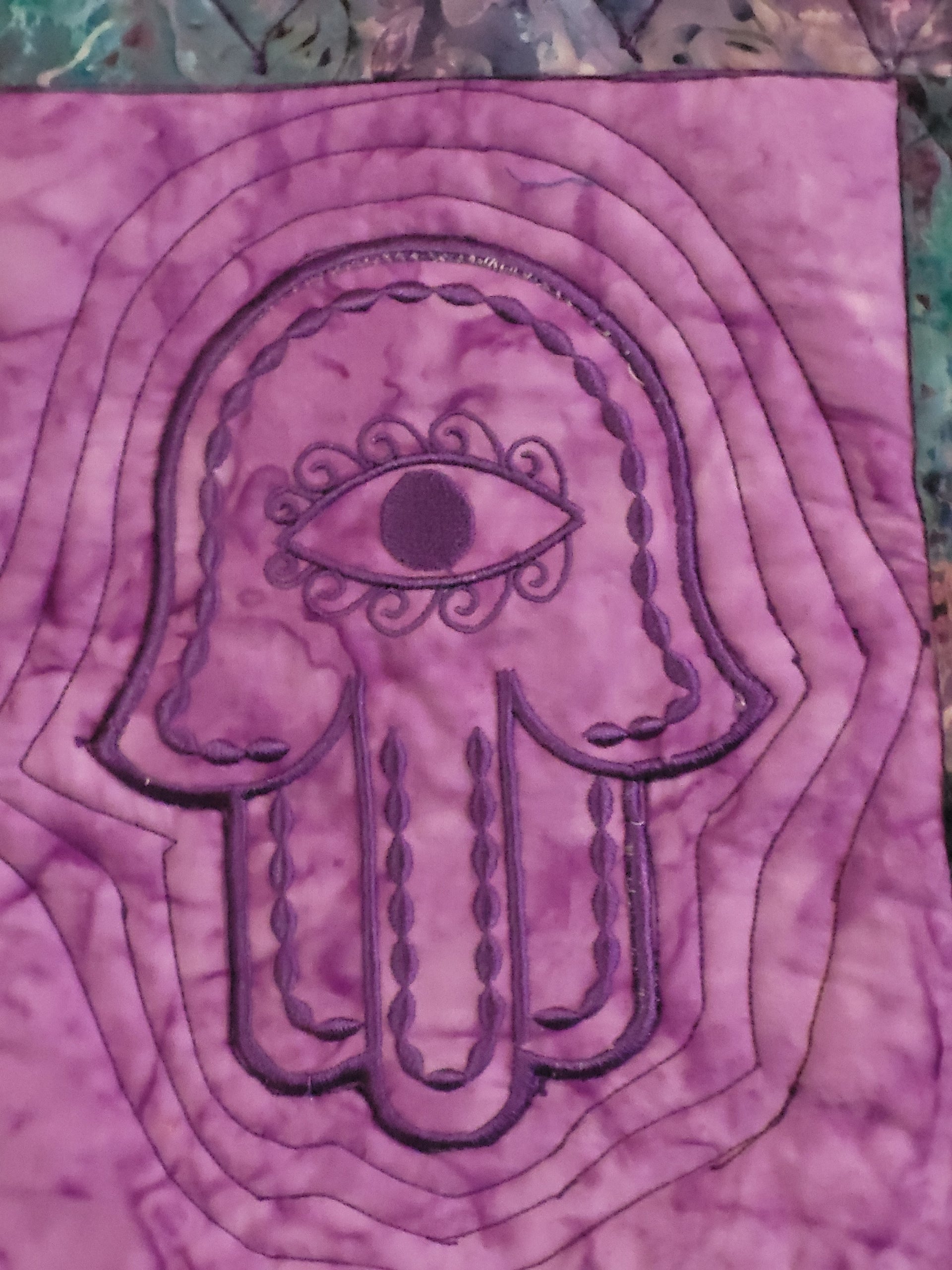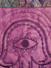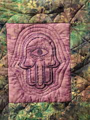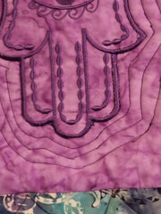 I have created a beautiful quilted Hamsa (Hand of Fatima, Hand of Miriam, Hand of G-d) using batiks, machine embroidery, machine quilting and a variety of quilting method. The one embroidered Evil Eye Hand of G-d/hamsa in purple embroider thread on an amethyst mottled batik.