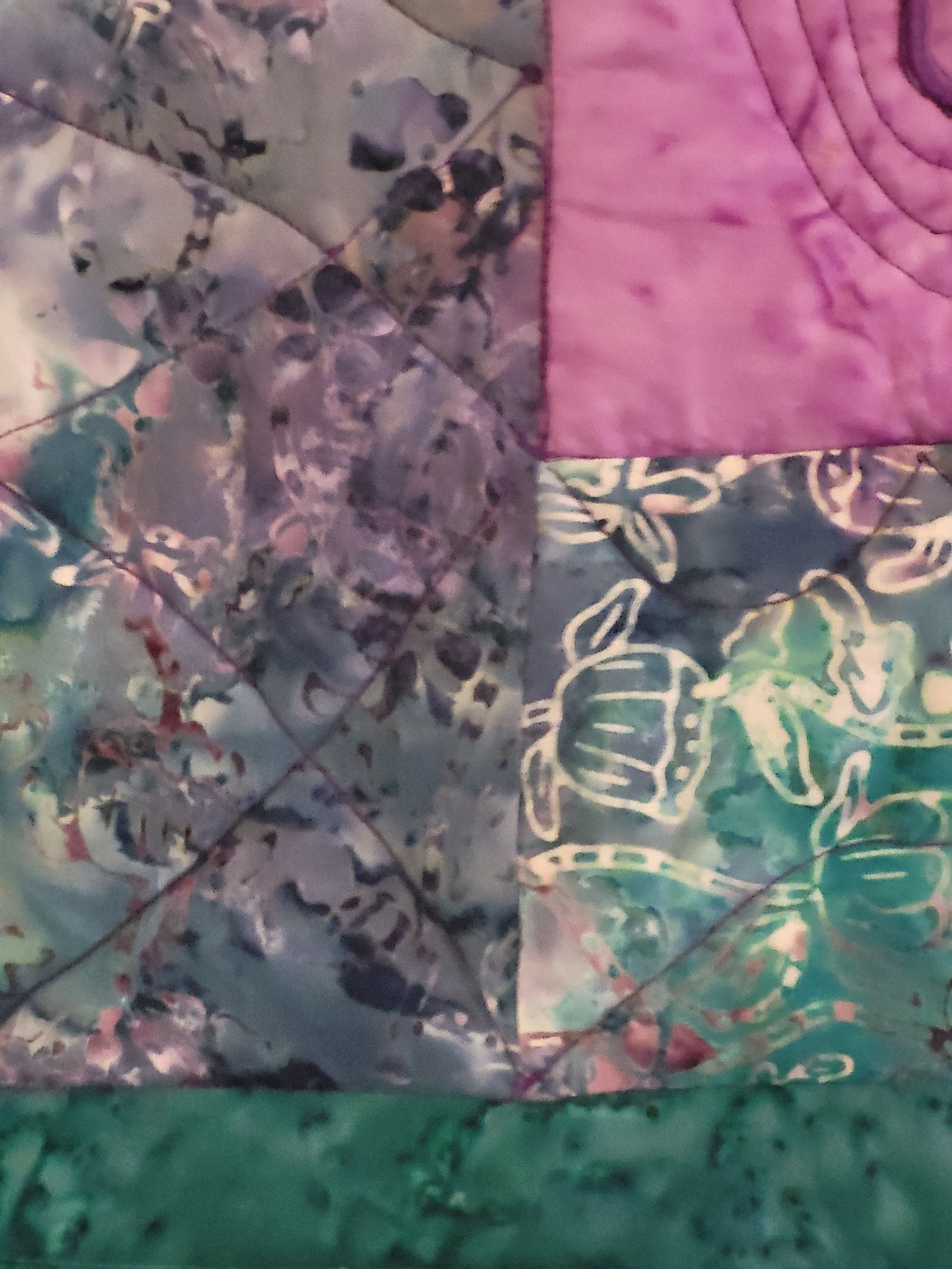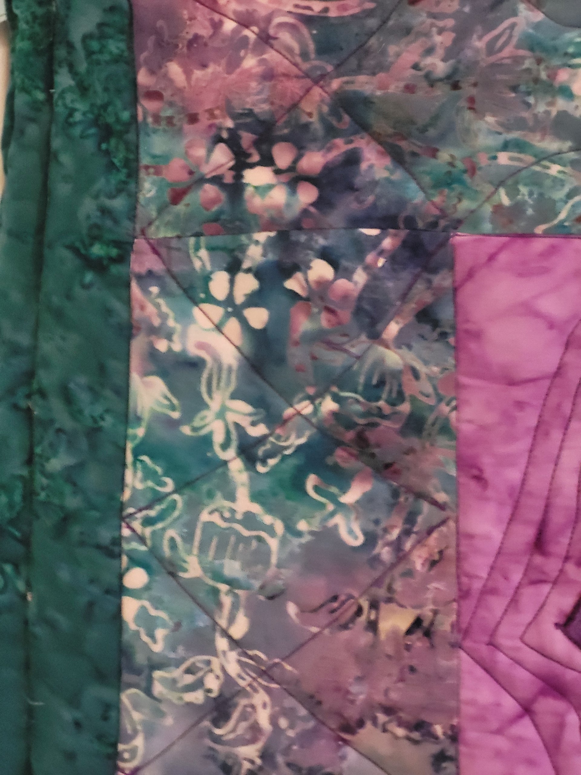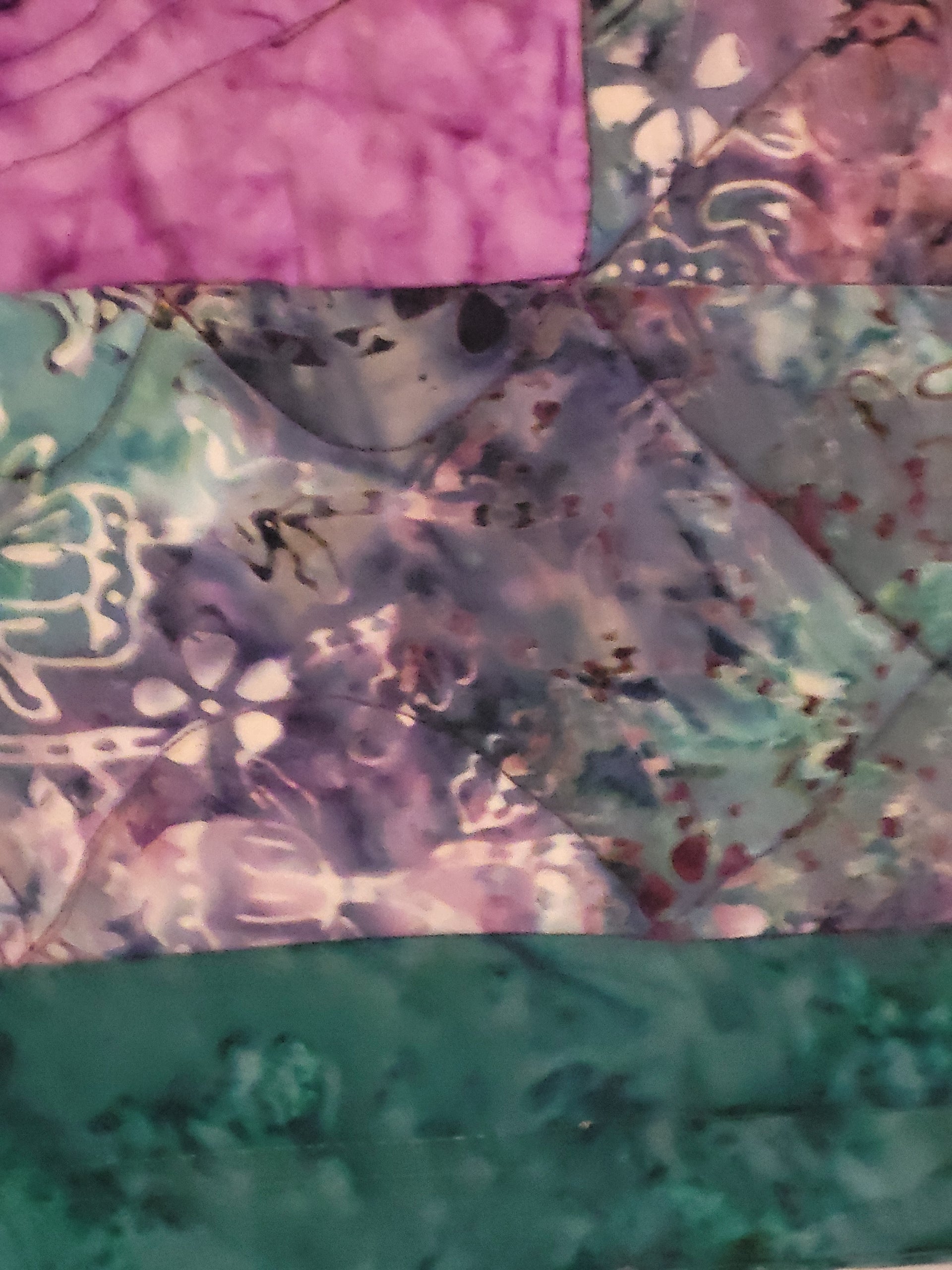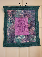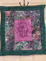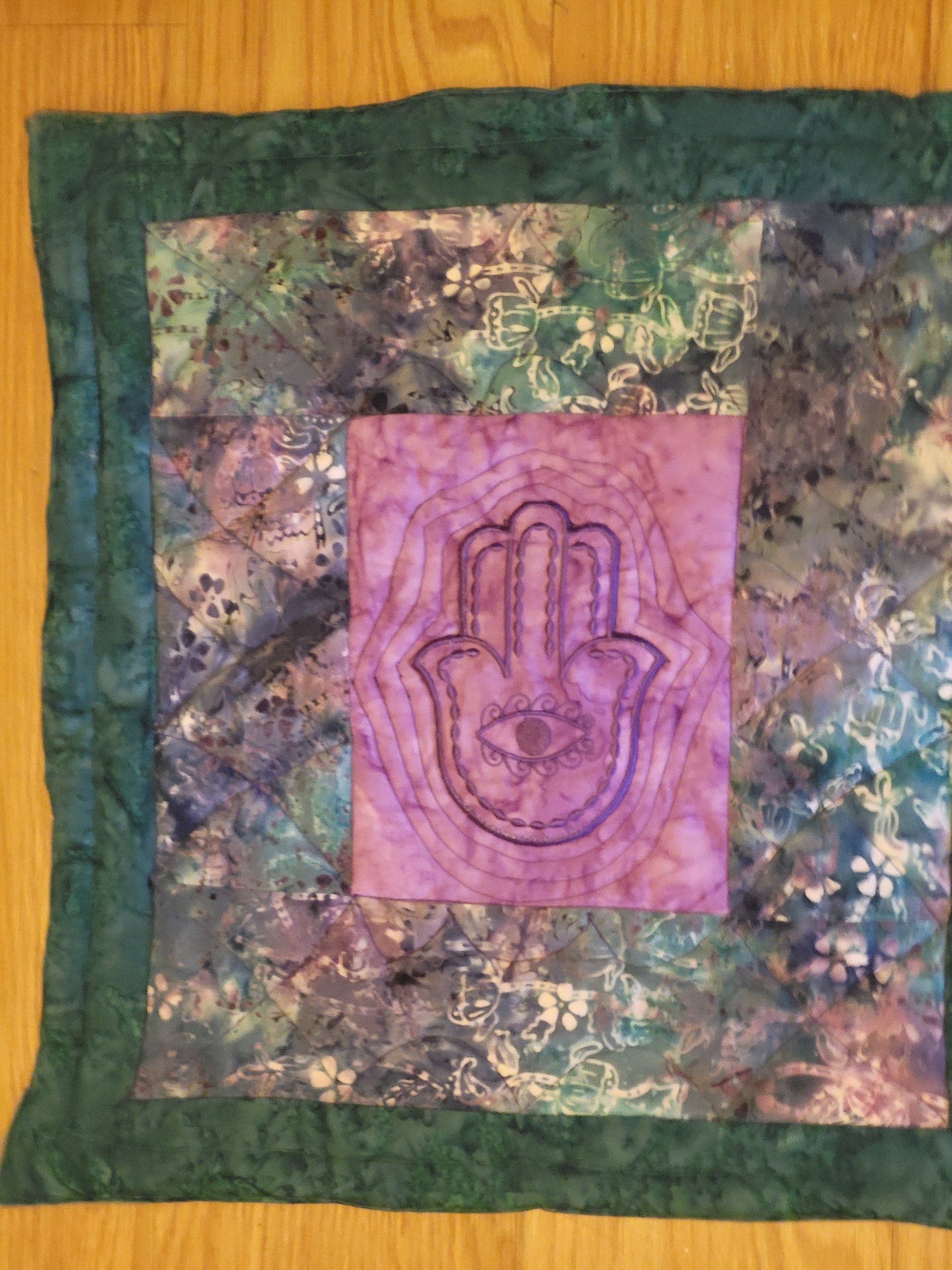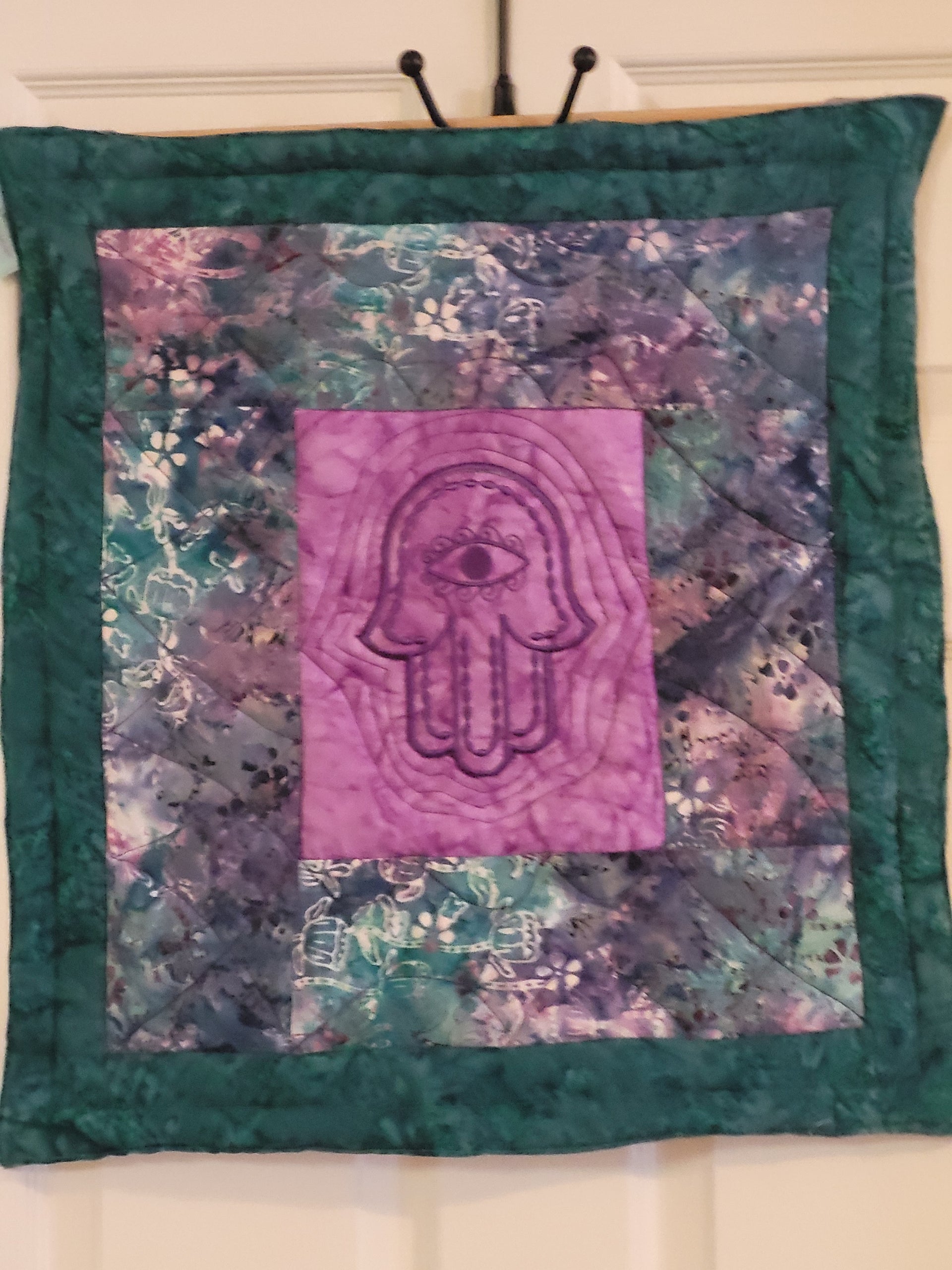 I have created a beautiful quilted Hamsa (Hand of Fatima, Hand of Miriam, Hand of G-d) using batiks, machine embroidery, machine quilting and a variety of quilting method. The one embroidered Evil Eye Hand of G-d/hamsa in purple embroider thread on an amethyst mottled batik.